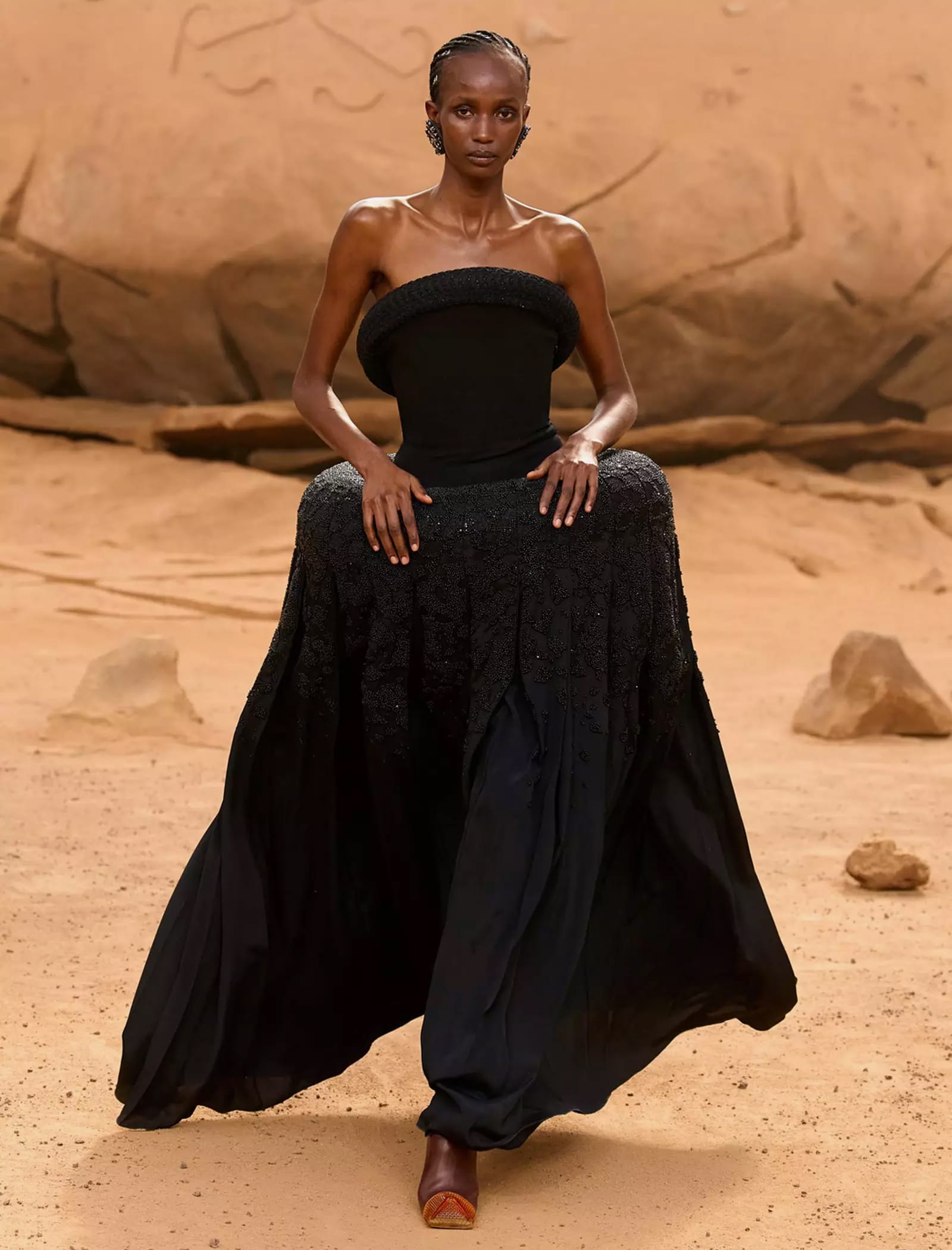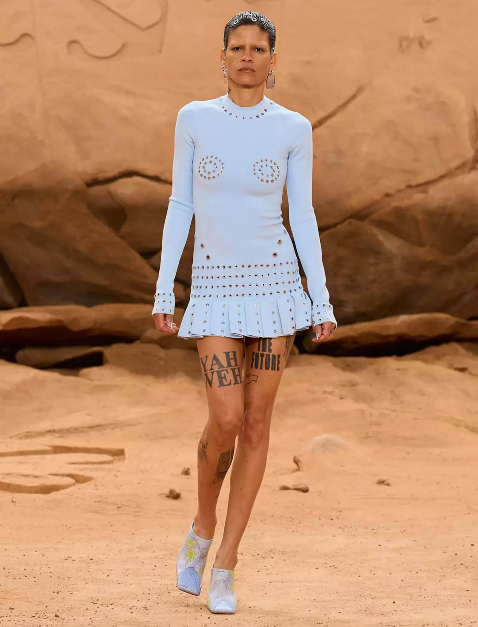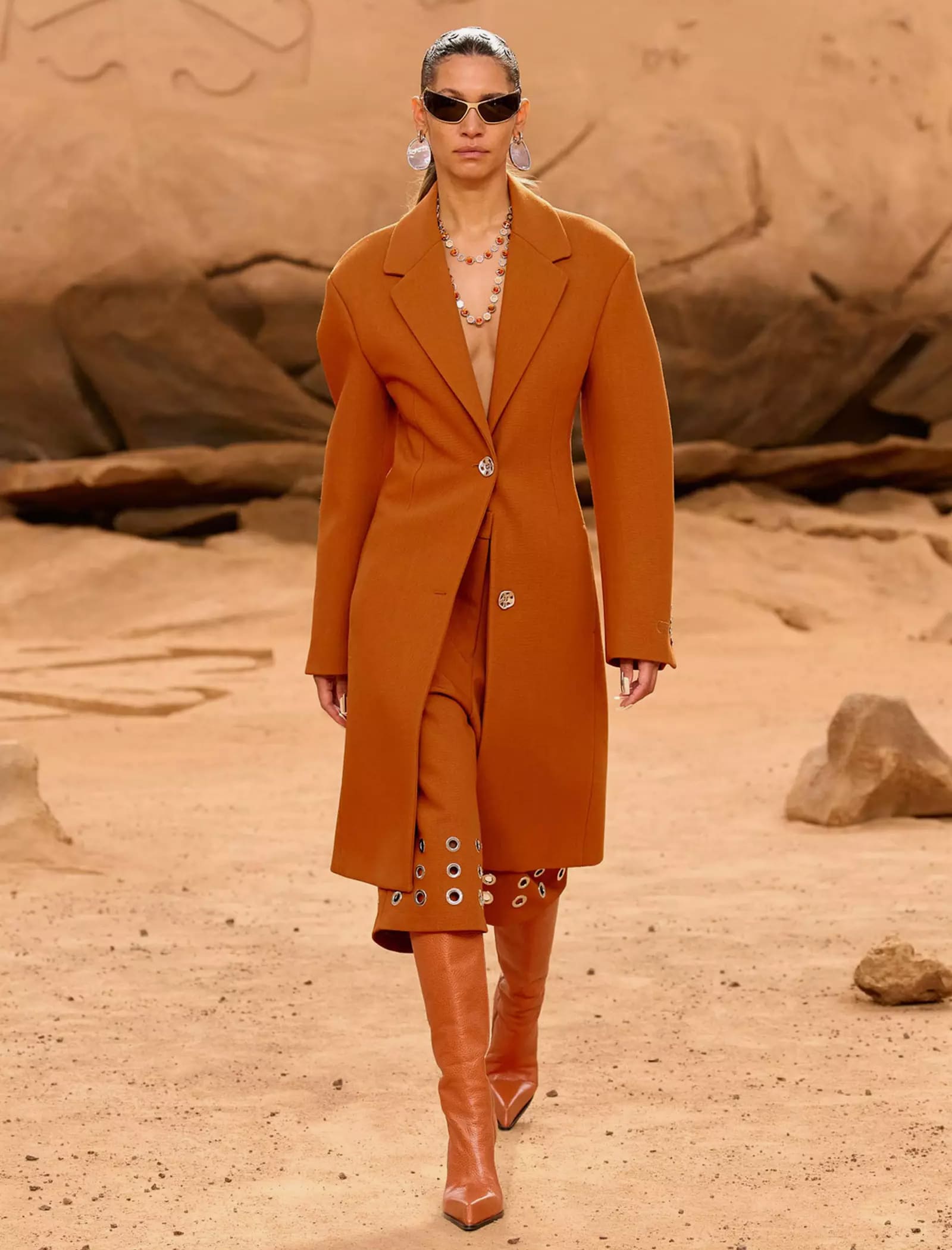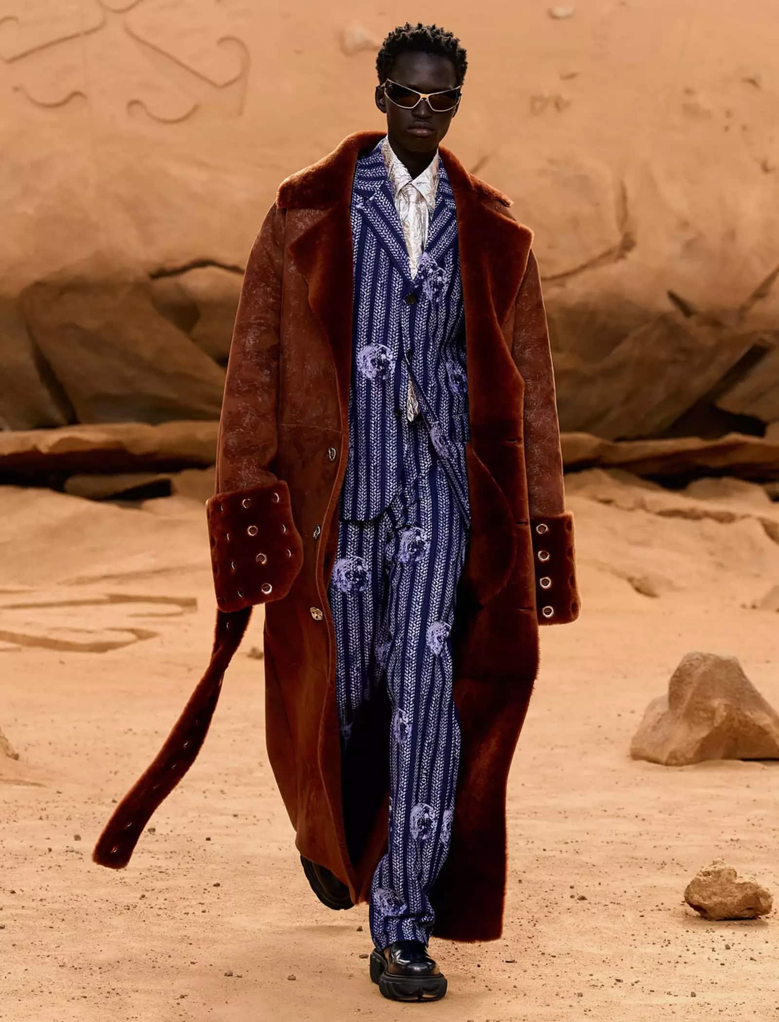 I capi svelati per la FW23 “LUNAR DELIVERY“ potrebbero tranquillamente rappresentare abiti di scena per il sequel di Interstellar, indossati da uomini e donne che tornano sulla Terra dopo un lungo vagare extraterrestre portando con sé look audaci e dai forti echi metal e steampunk: tute e completi decostruiti trovano la loro dimensione sulla sabbia post-apocalittica, calcata da modelli asettici e freddi, in linea con gli indumenti borchiati, con fibbie e ingranaggi che indossano. È un essere umano futuristico, a tratti irriconoscibile, ma che incarna l’evoluzione naturale del metro stilistico di Off-White rimaneggiato da Kamara.