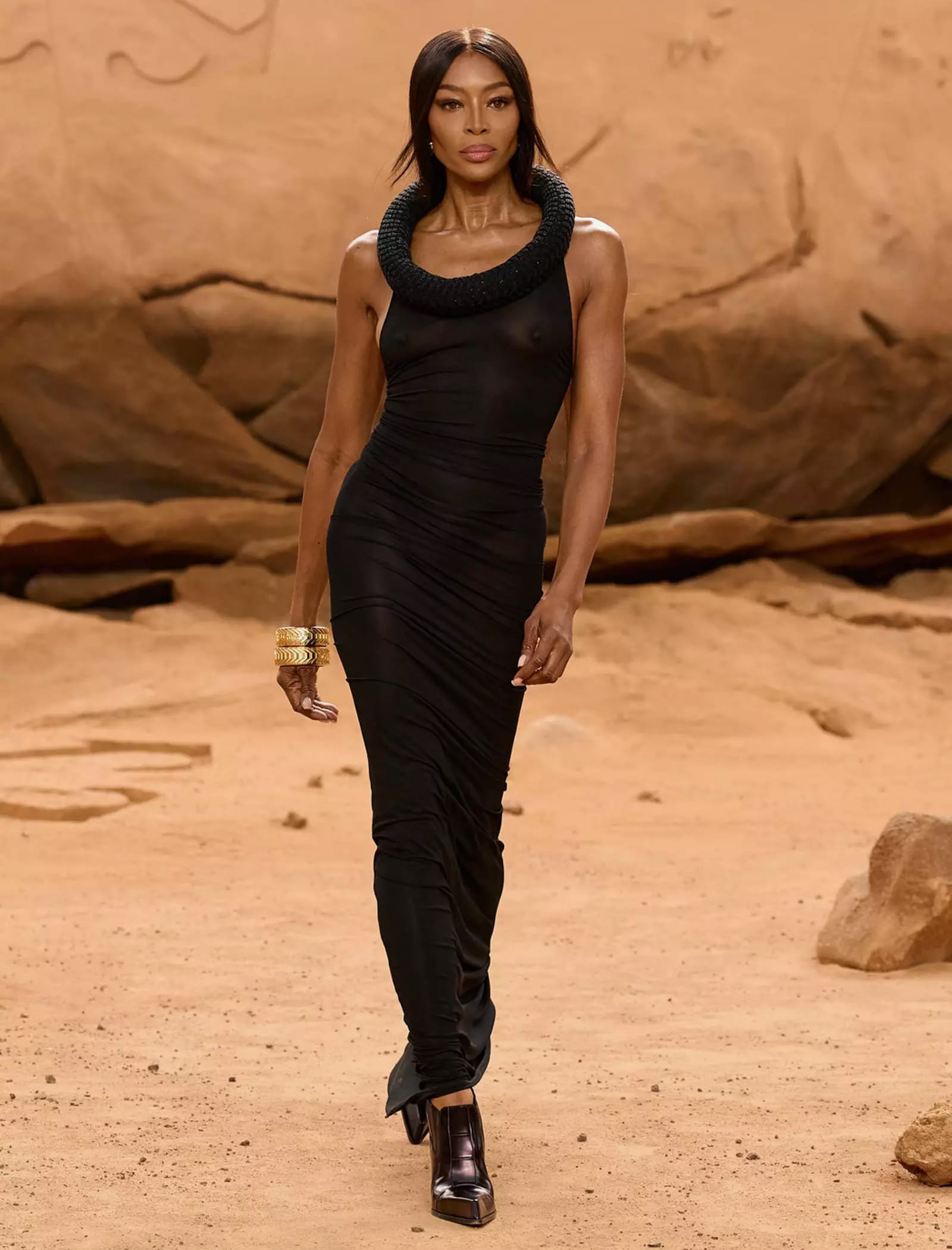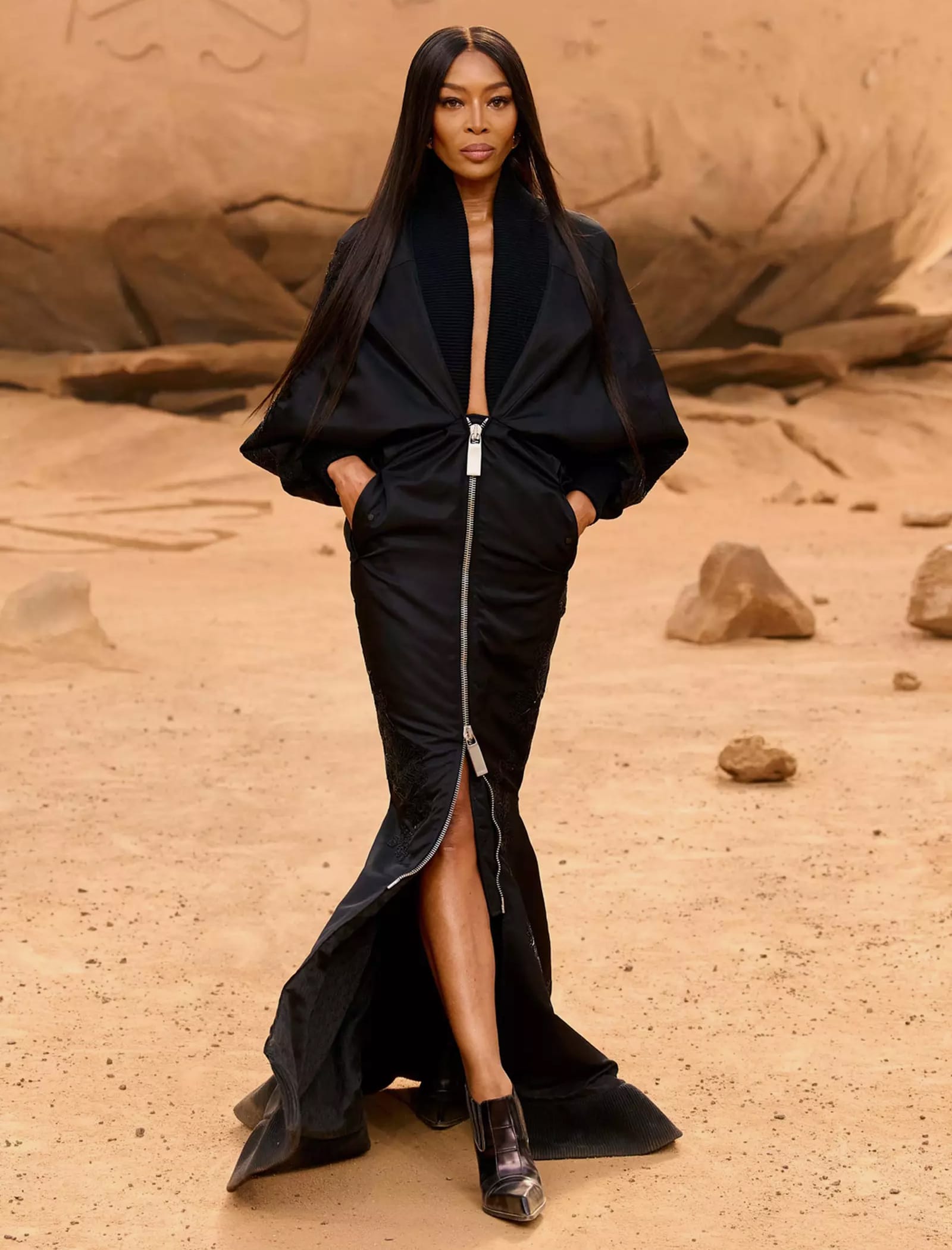 Anche Naomi Campbell (amica e collaboratrice di Virgil) ha fatto la propria comparsa in passerella, sfoggiando ben due look, tra cui un lungo abito scuro e una mise composta da un bomber jacket in color nero rivisitato nelle sembianze di un vestito da sera con scollo frontale.