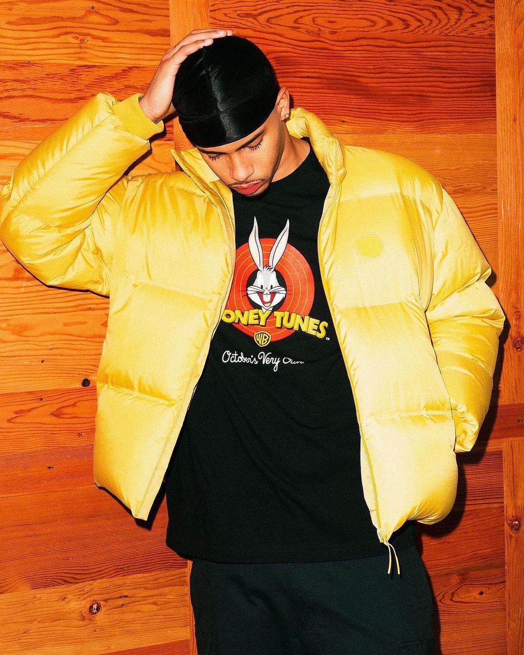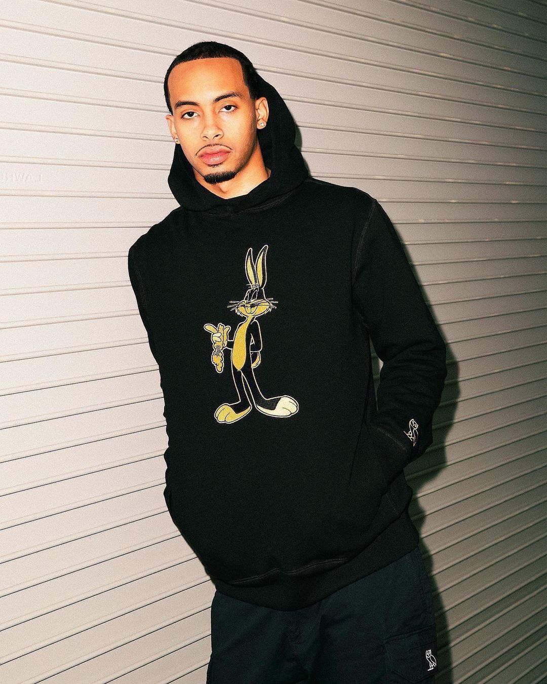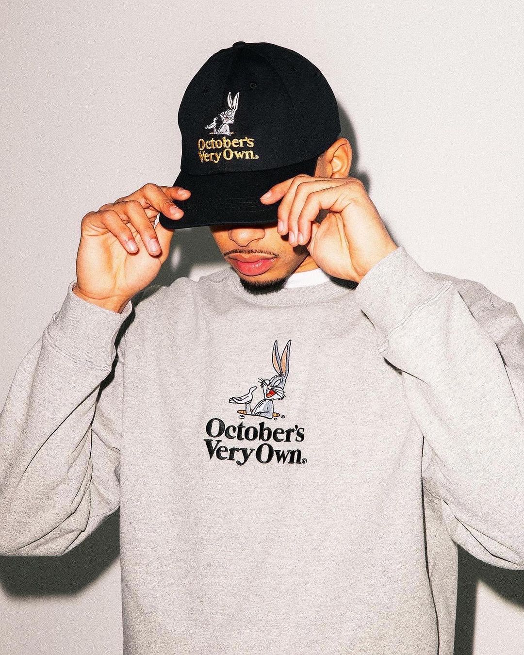 Il protagonista indiscusso della collezione è Bugs Bunny, che compare su numerosi capi prodotti in collaborazione accanto al branding di October’s Very Own: il simpatico coniglio risalta particolarmente sulla hoodie, presentandosi nella sua iconica immagine mentre mangia una carota.