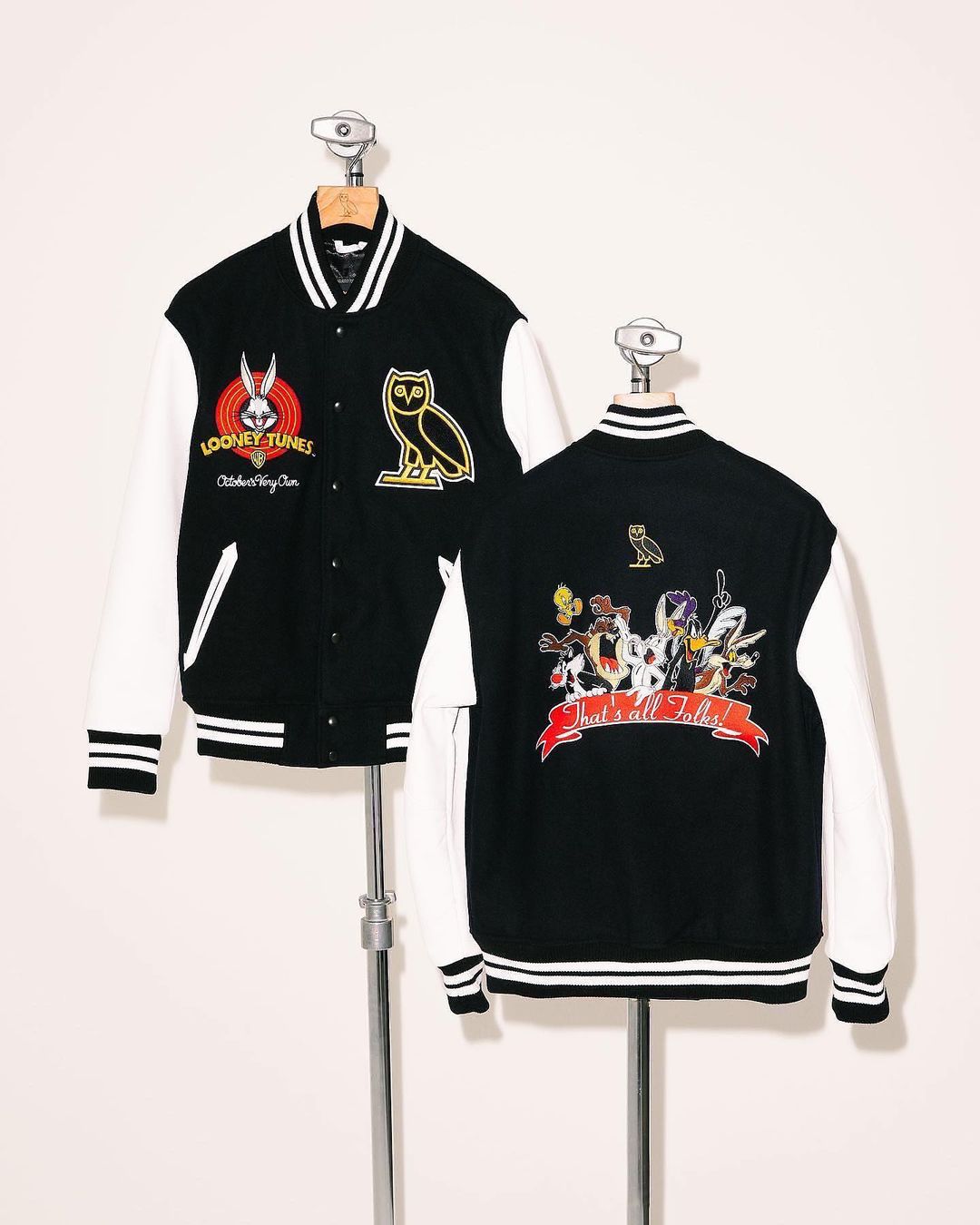 Anche le varsity jacket e le crewneck riportano grafiche ispirate a Bugs Bunny, mentre l’intera banda di personaggi Looney Tunes è evidenziata in modo vivace sui pantaloni della tuta e sulla stessa giacca (che presenta anche l’iconica frase “That’s all, Folks!” ricamata sul retro).