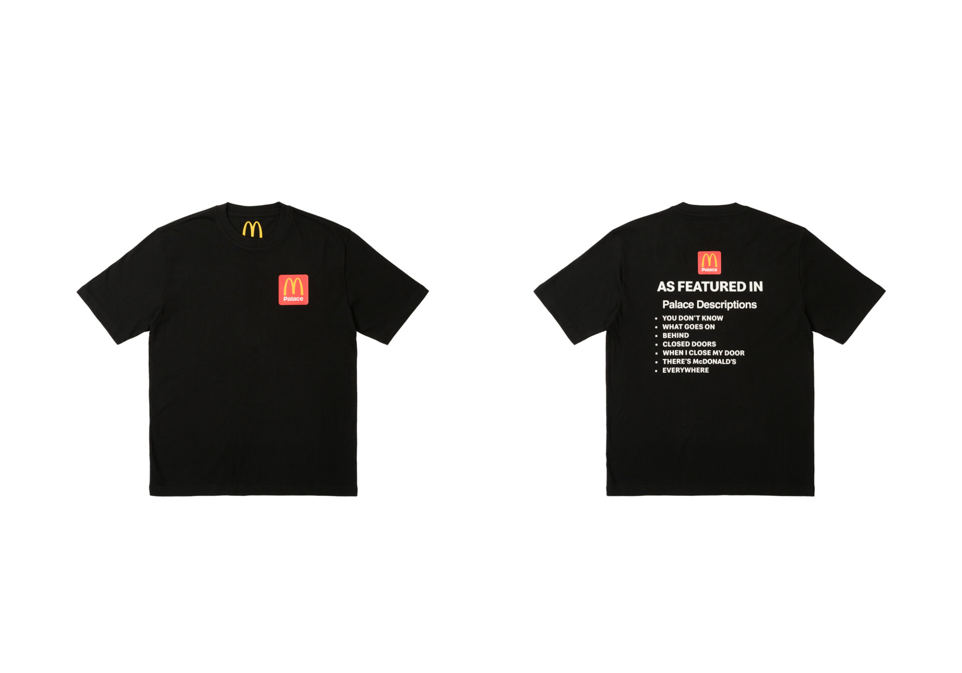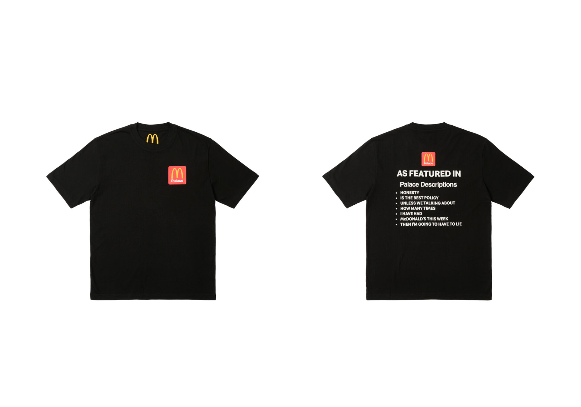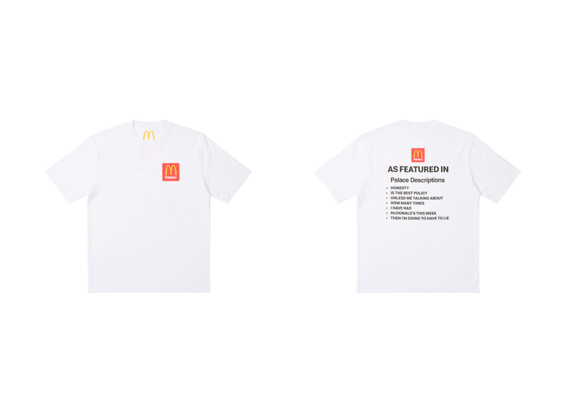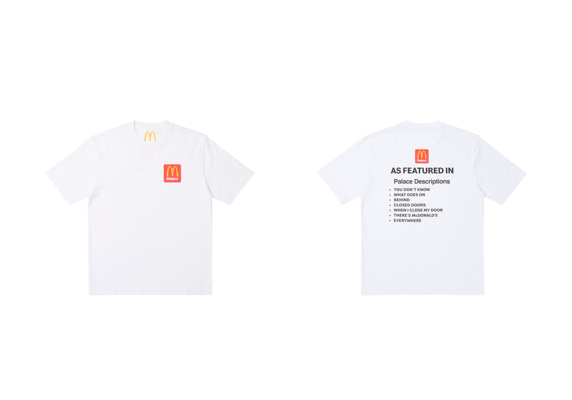 C’è da dire che Palace, con le sue descrizioni giocose e accattivanti, utilizzate per descrivere ogni item del suo shop online, negli anni, è diventato uno dei marchi più prolifici in merito a collaborazioni con i più disparati settori, a cui però mancava quello inerente al food. Argomento che invece non tocca McDonald’s che ha accumulato partnership con Travis Scott, CLOT e Cactus Plant Flea Market, giusto per citarne alcune.