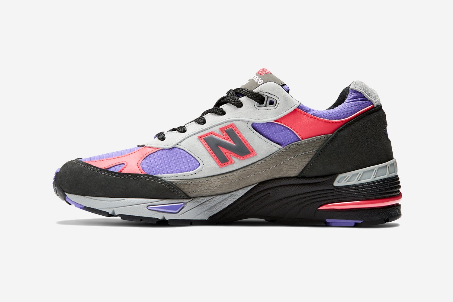 Le inedite Palace x New Balance Made in UK 991 sono state presentate in due varianti multicolore: un primo paio incentrato sul protagonismo di una tomaia in mesh a base viola abbinata a pannelli in pelle scamosciata grigio chiaro e accenti rosa sulla punta e sul collo della caviglia. Co-branding sull’etichetta della linguetta, midsole Encap bicolore e suola nera completano il look della prima variante.