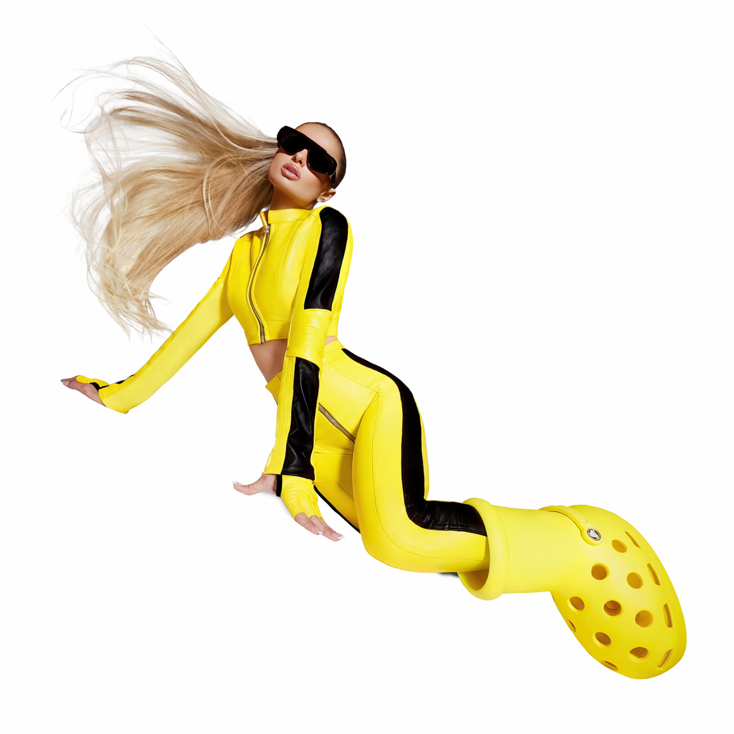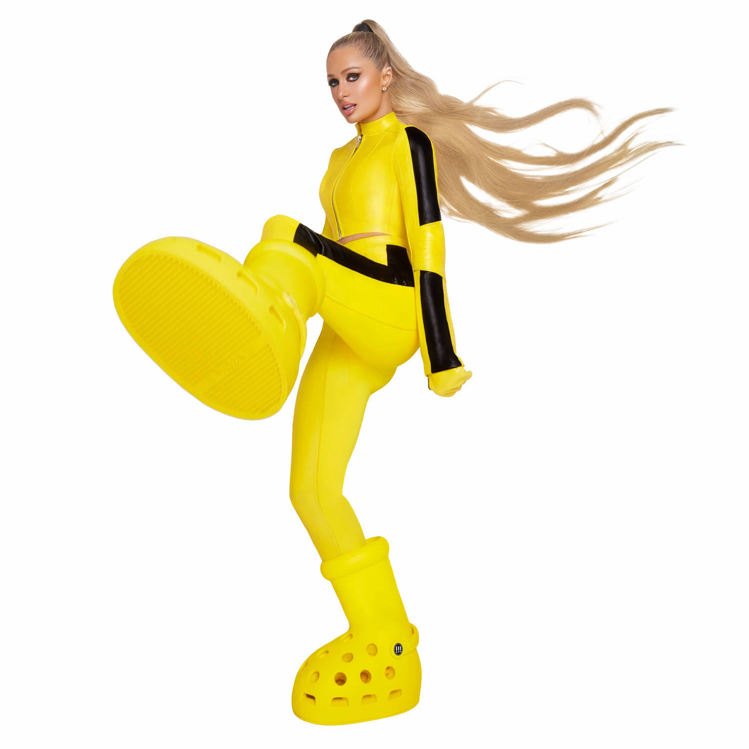 Per il lancio di questi stivali, il collettivo ha chiamato la reginetta dell’era Y2K, trend che sembra ormai intramontabile ora che tutti si sentono un po’ Barbie, Paris Hilton, che li ha indossati abbinandoli ad una tutina gialla, che ricorda in tutto e per tutto quella sfoggiata da Uma Thurman per Kill Bill. Gli stivali sono modellati in plastica monoblocco, e presentano le caratteristiche tipiche di una calzatura Crocs, come le perforazioni sull’upper e il cinturino sul tallone.