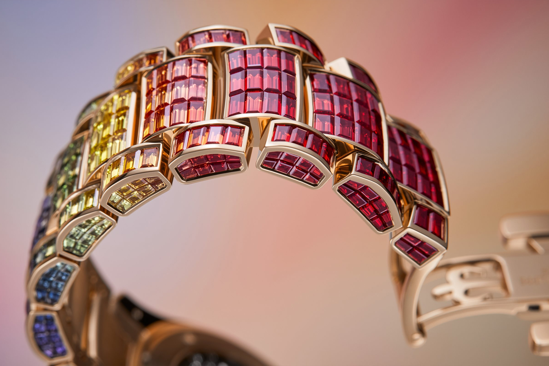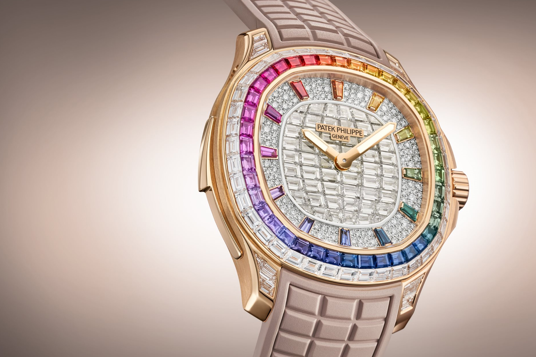 A conquistare il titolo di “più appariscente” tra i nuovi arrivati è sicuramente l’Aquanaut Luce “Rainbow” Haute Joaillerie, che introduce la ripetizione minuti su cassa sportiva: protagonisti del timepiece sono i 52 zaffiri multicolore taglio baguette (3,19 ct), i 112 diamanti baguette (7,31 ct) e gli ulteriori 160 diamanti taglio brillante (0,72 ct) che ornano la cassa in oro rosa, incastonati su quadrante e lunetta a creare uno scintillante effetto arcobaleno. Nella versione con bracciale, che dovrebbe costare più di 2.5 milioni di euro, gli zaffiri e i diamanti taglio baguette sono invece rispettivamente 779 (45,05 ct) e 130 (8,66 ct).