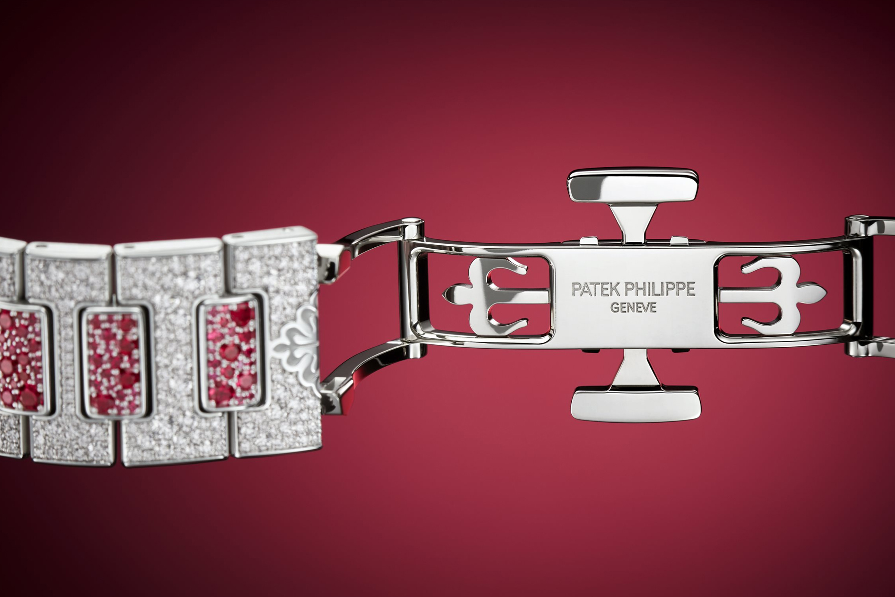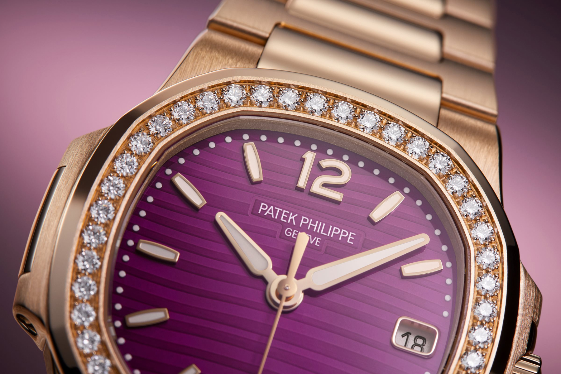 Protagonisti dell’ultimo modello, il Nautilus Lady, sono invece l’oro rosa, di cui sono costituiti la cassa da 32 mm e l’opzionale bracciale, e il viola, che invece tinge lo speciale quadrante laccato e ornato da un motivo a onde. Il gioiello è poi completato da una lunetta tempestata da 46 diamanti Top Wesselton taglio brillante da 0,8 carati. Il prezzo è di 56.640 euro per la versione con bracciale in oro e di 39.950 euro per quella con cinturino in materiale composito viola.