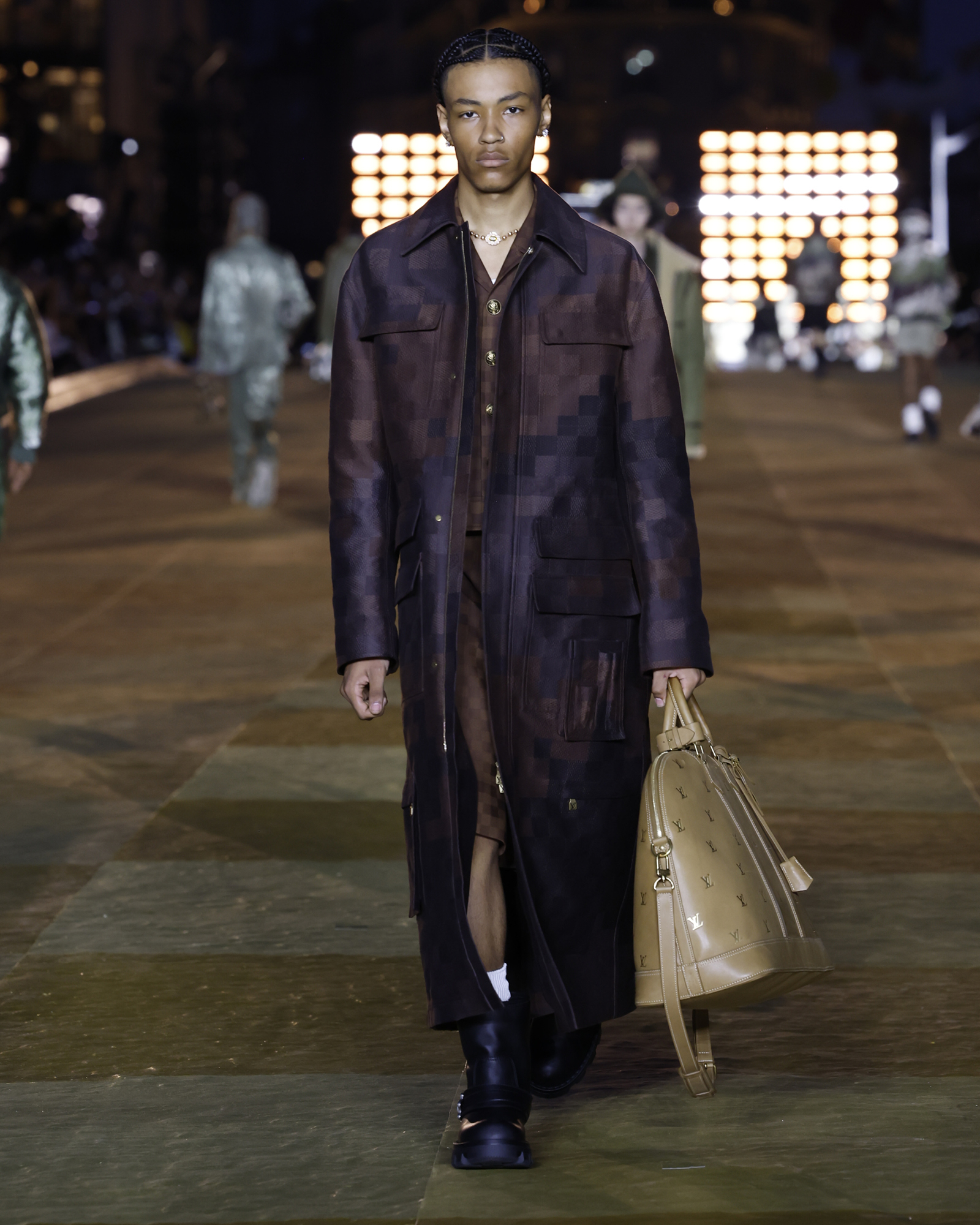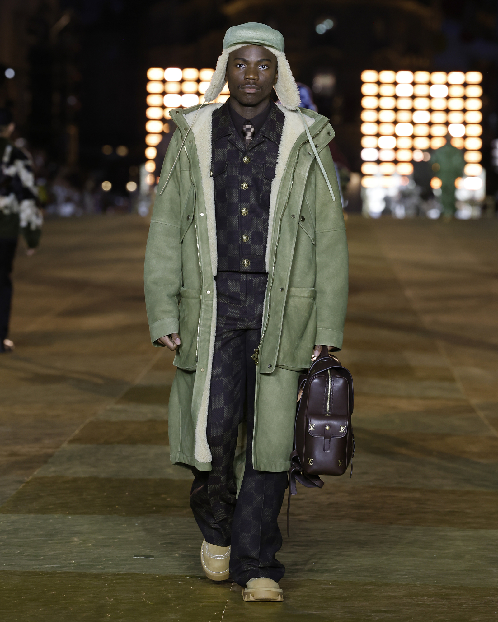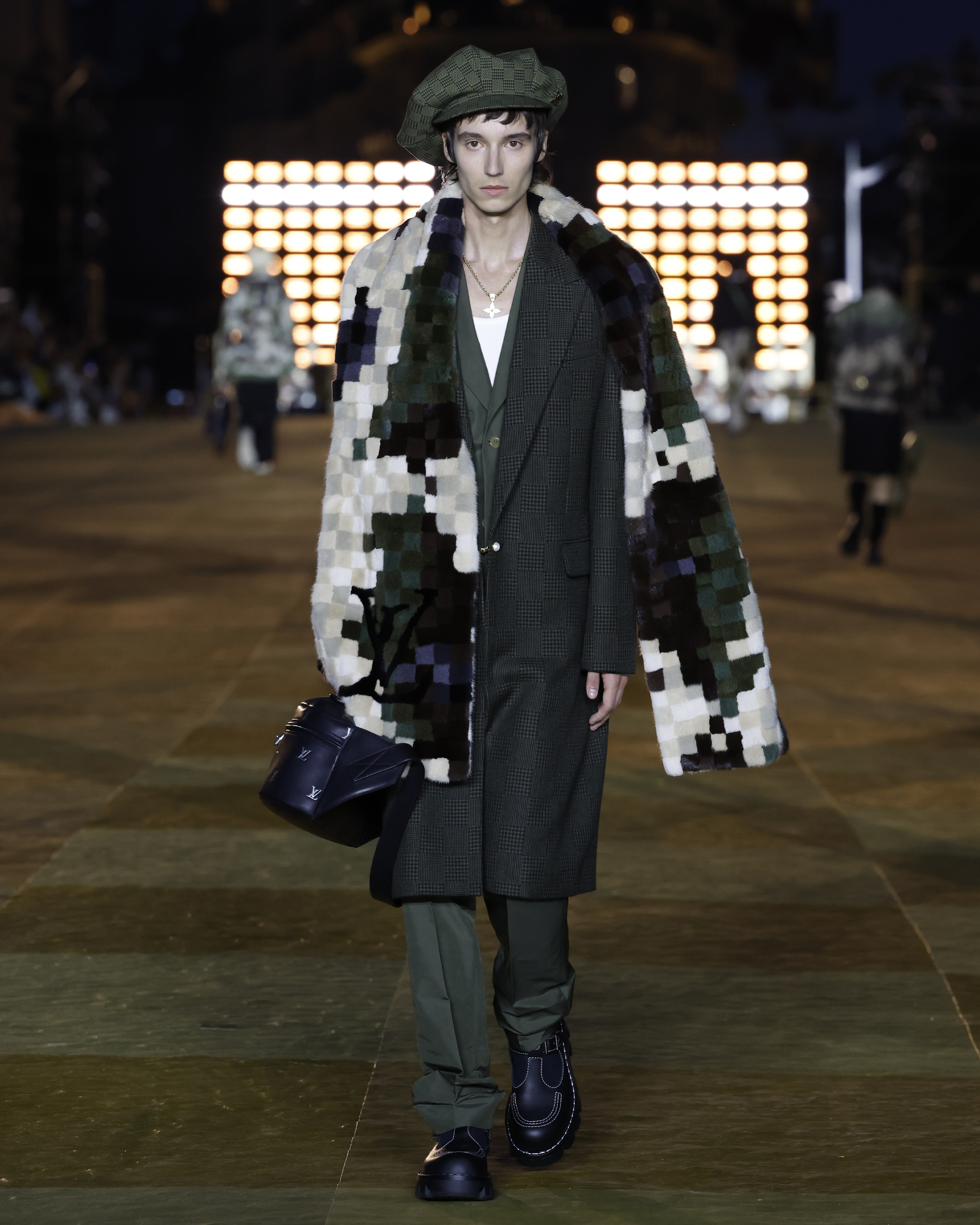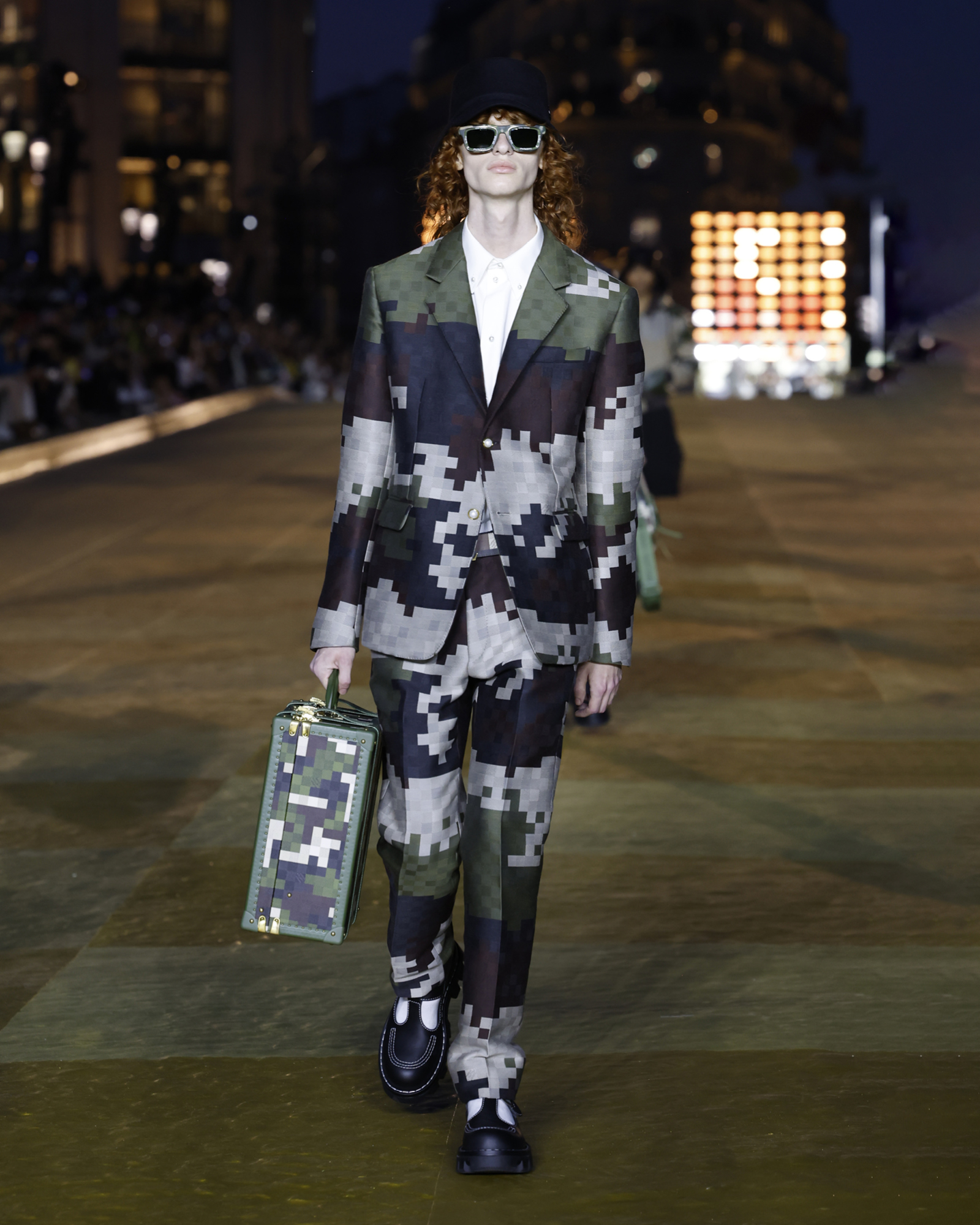 A coinvolgere maggiormente il pubblico, e nel dettaglio anche gli ospiti è stato il cosidetto “Damouflage”, un pattern che fonde l’iconico motivo Damier della maison con i quadrotti goffi dei pixel, dando vita ad un nuovo pattern, inconfondibile e ormai legato indissolubilmente alla figura di Pharrell. L’uomo che porta in scena Louis Vuitton è formale ed essenziale, presentando una linea per lo più incentrata sull’alta sartoria, con tocchi di contaminazione streetwear e militaresca.