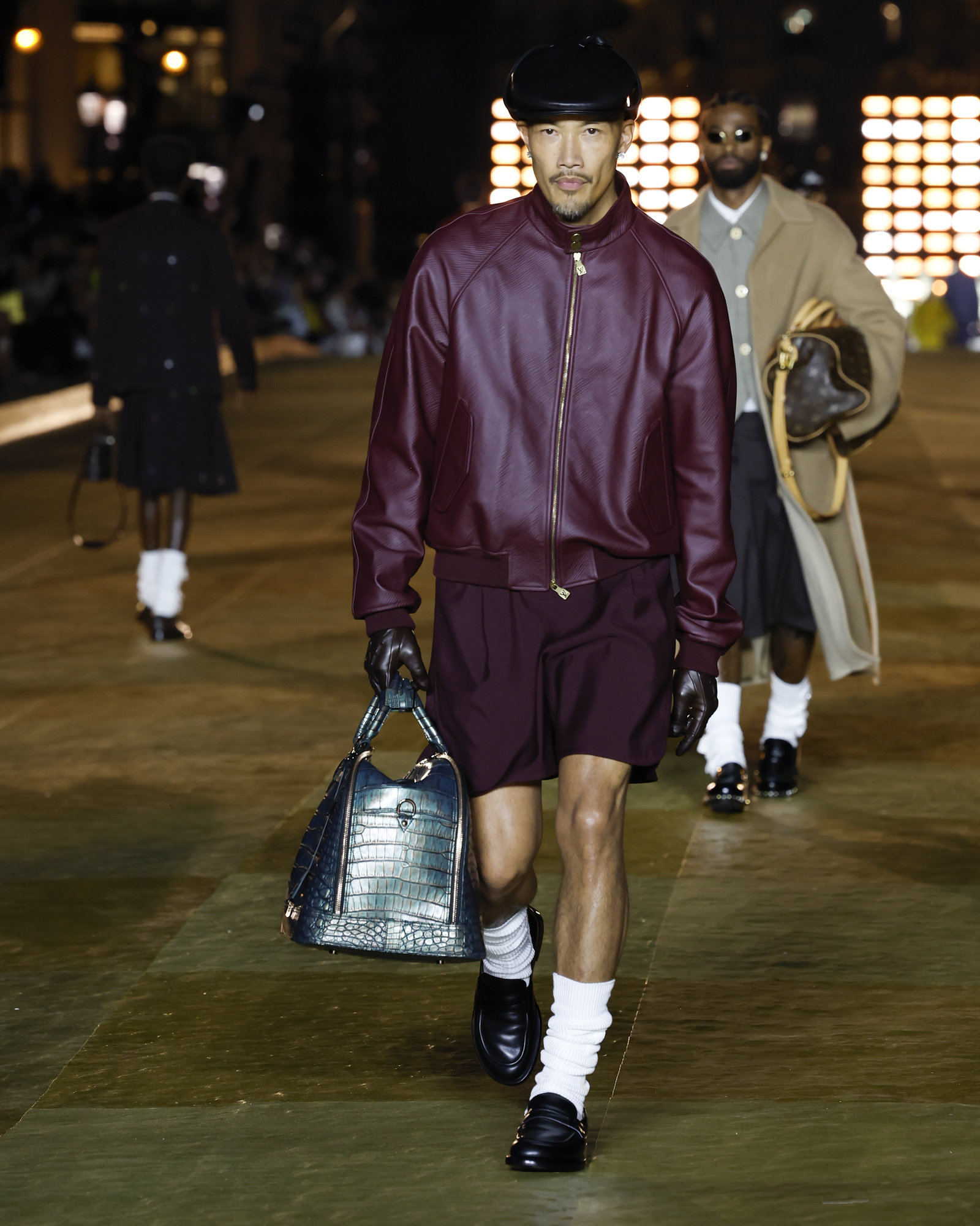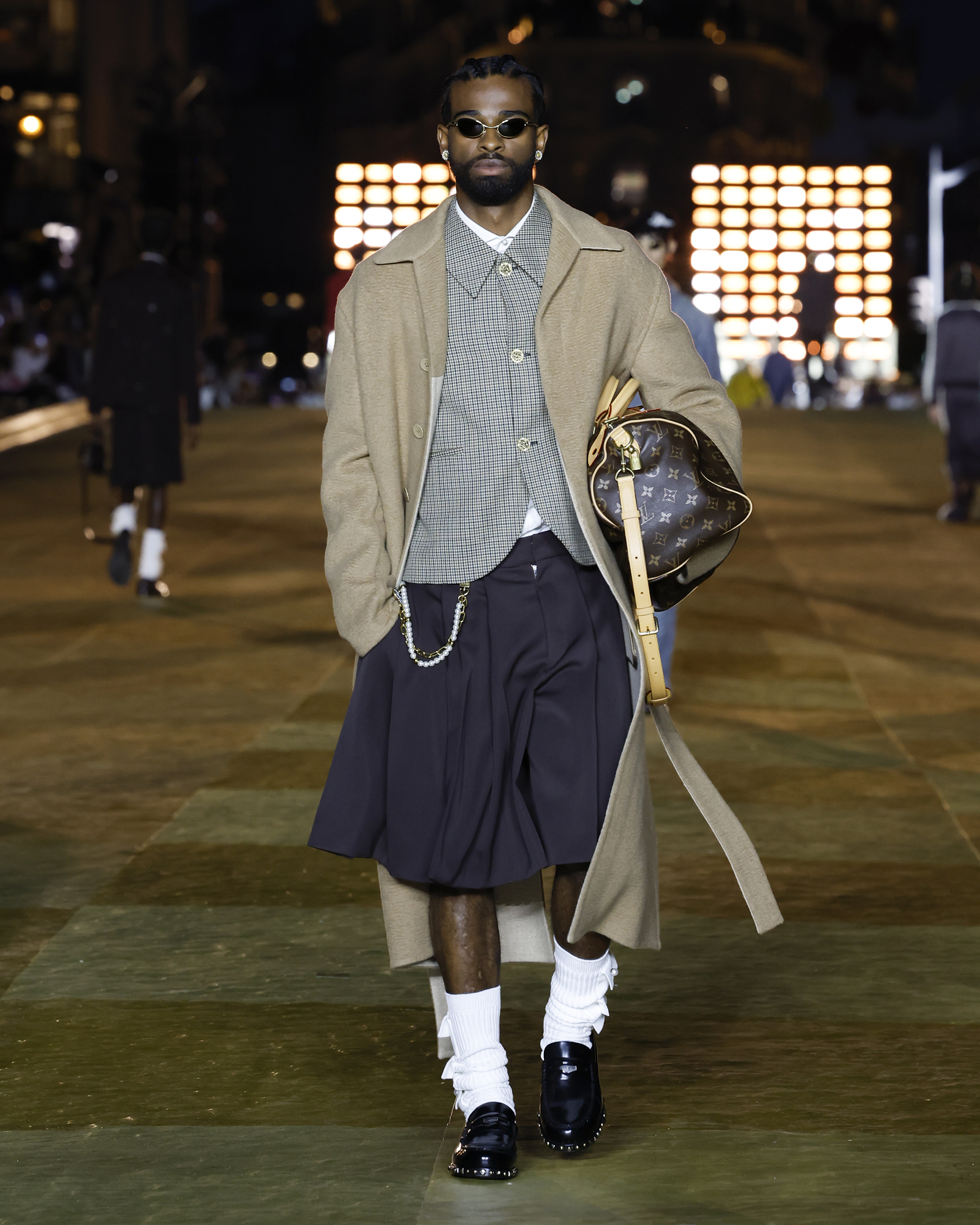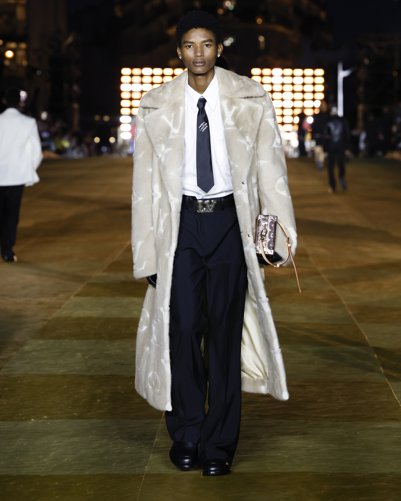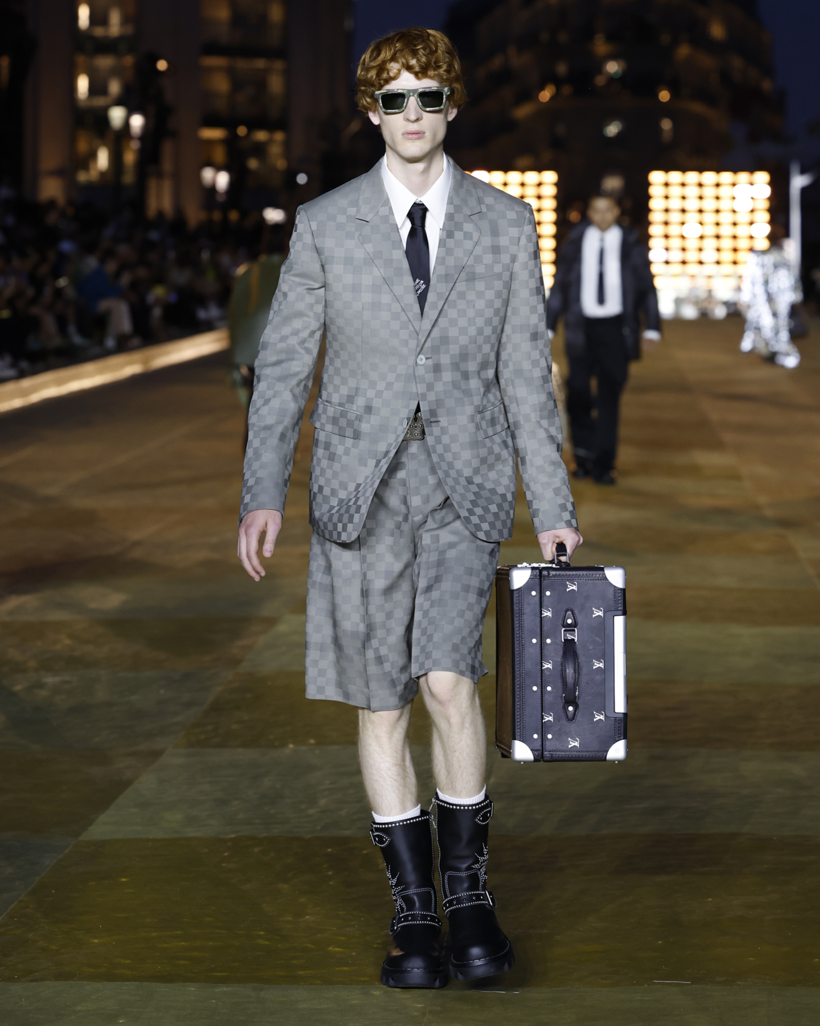 A coinvolgere maggiormente il pubblico, e nel dettaglio anche gli ospiti è stato il cosidetto “Damouflage”, un pattern che fonde l’iconico motivo Damier della maison con i quadrotti goffi dei pixel, dando vita ad un nuovo pattern, inconfondibile e ormai legato indissolubilmente alla figura di Pharrell. L’uomo che porta in scena Louis Vuitton è formale ed essenziale, presentando una linea per lo più incentrata sull’alta sartoria, con tocchi di contaminazione streetwear e militaresca.