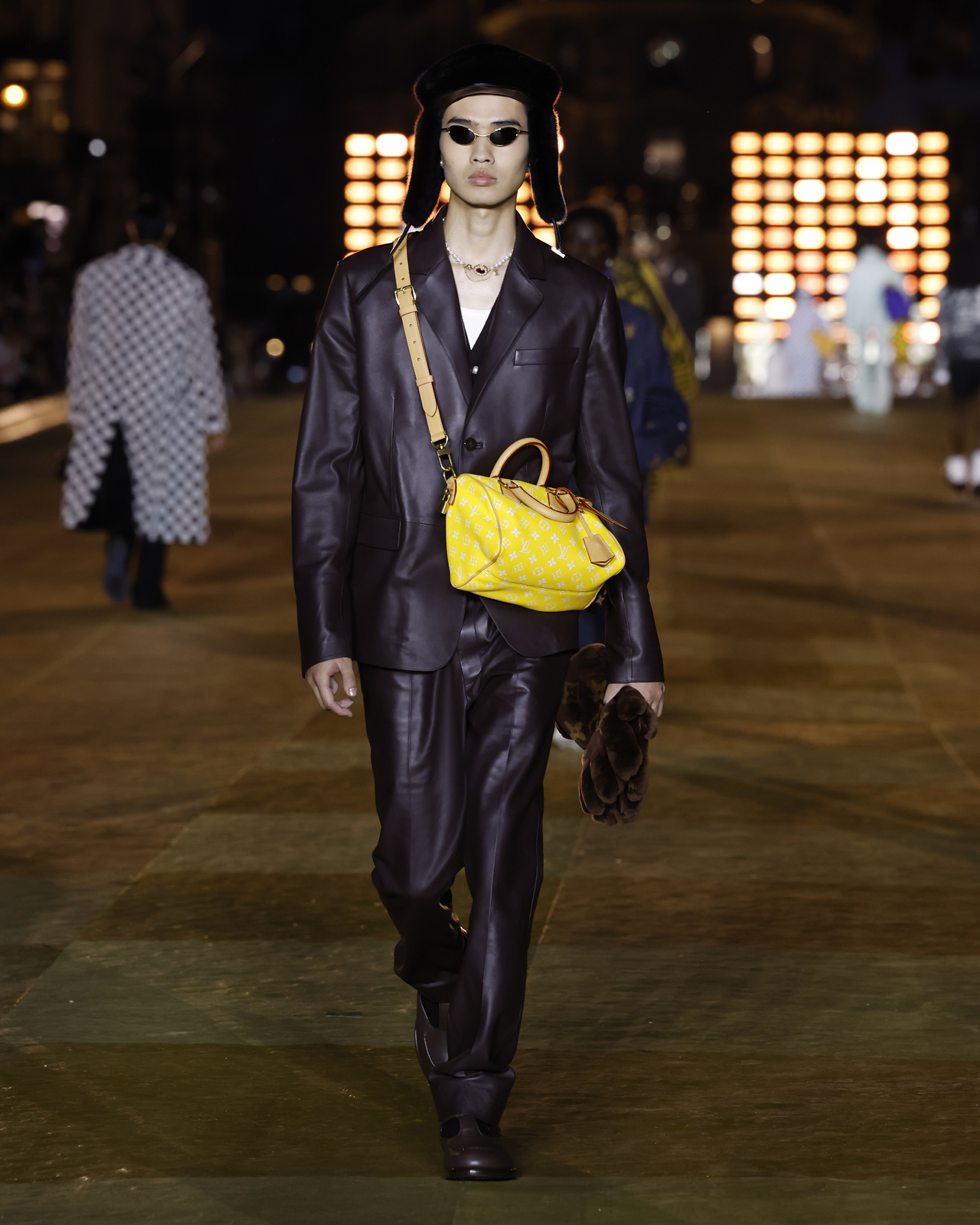 Il fil-rouge che ha mosso la presentazione è il gioco di parole LVovers, ovviamente costituito dal monogram LV, che fa capolino su cappelli, colletti, giacche e persino cravatte, segnando ufficialmente il ritorno non solo della mania dei loghi ben in vista, ma a tratti anche un lento, ma inesorabile, riavvicinarsi alle forme esagerate che si contrappongono all’ideale quiet luxury.