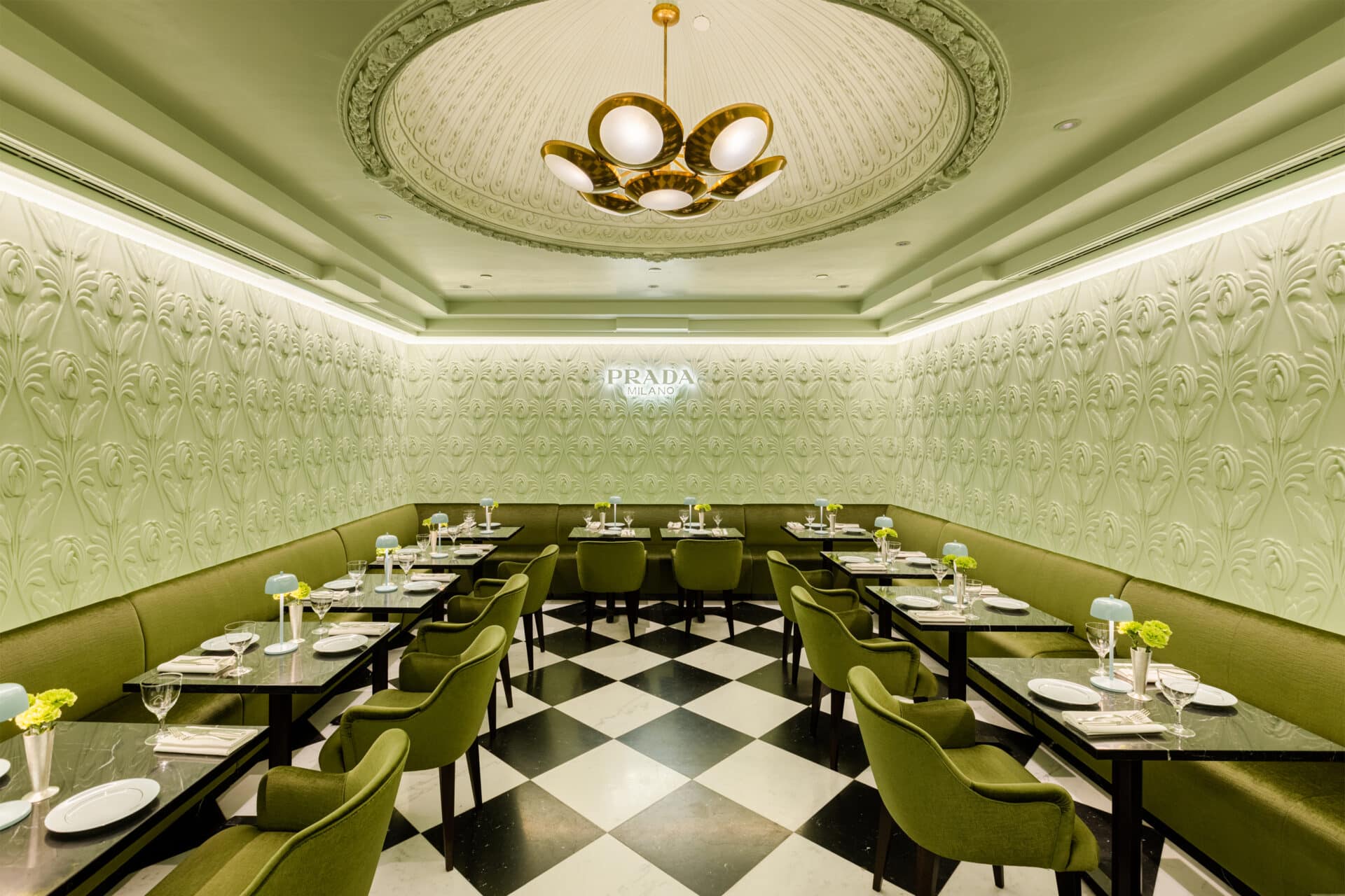 Il design del locale risulta ispirato alla struttura del caffè Marchesi di Milano, nota pasticceria del capoluogo lombardo, anch’essa di proprietà del gruppo Prada: le pareti, i soffitti, i divani e le poltrone in velluto che animato lo spazio interno si presentano in una delicata tinta verde salvia, mentre i pavimenti a scacchiera bianchi e neri sono stati progettati per riprendere quelli della storica boutique Prada di Corso Vittorio Emanuele II a Milano. L’intero spazio viene dunque caratterizzato da nuance di colore tipiche dei locali anni ‘50, in un’armonia che sembra essere uscita direttamente da un film di Wes Anderson.