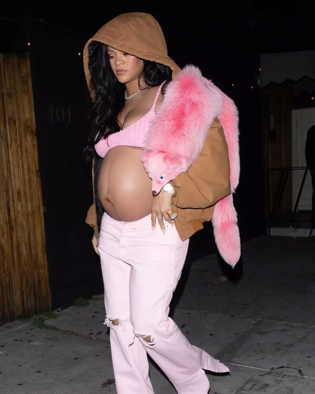 Lo stile premaman di Rihanna è un fenomeno inedito e sorprendentemente interessante, che è stato coronato nelle scorse ore dall'ultimo outfit sfoggiato proprio dalla popstar delle Barbados.La cantante, stilista e imprenditrice ha mostrato con orgoglio il suo pancione in crescita mentre lasciava l'hot spot di Hollywood Nice Guy indossando un completo monocromatico. La star 34enne, che aspetta il suo primo figlio con A$AP Rocky, ha optato per un bralette in spugna rosa pastello di Bottega Veneta, abbinata a jeans Vetements rosa chiaro con fondo svasato. I pantaloni a vita bassa presentavano inoltre strappi intorno alle ginocchia, in una silhouette a campana con spacchi sui lati (vicino alle caviglie).Rihanna ha completato il suo look optando per una stola rosa vintage in pelliccia a forma volpe disegnata da John Galliano e per un bomber color marrone chiaro. Per quanto riguarda gli accessori, la cantante ha sfoggiato un paio di scarpe con tacco rosa firmate Amina Muaddi, un orologio e una collana di diamanti. Consapevole dell'importanza della propria mise, la star delle Barbados ha fornito uno sguardo più dettagliato al suo outfit sul proprio profilo Instagram, pubblicando una foto scattata da Miles Diggs.