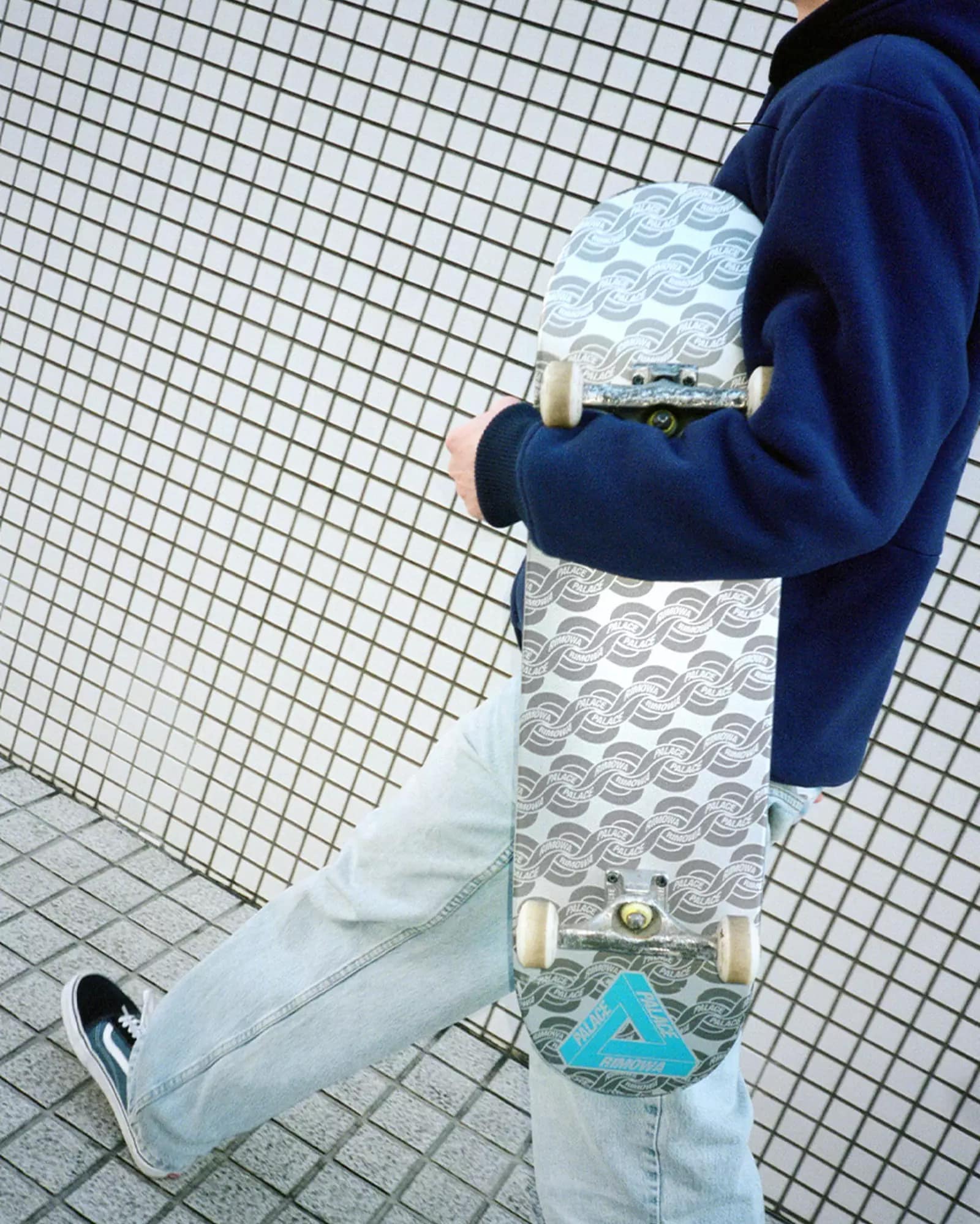 In secondo luogo, per celebrare lo spirito del brand britannico, le due parti hanno progettato un particolare skate deck in limited edition che presenta i loghi di entrambe le aziende combinati in maniera geometrica e ripetuta in corrispondenza del lato inferiore della tavola.