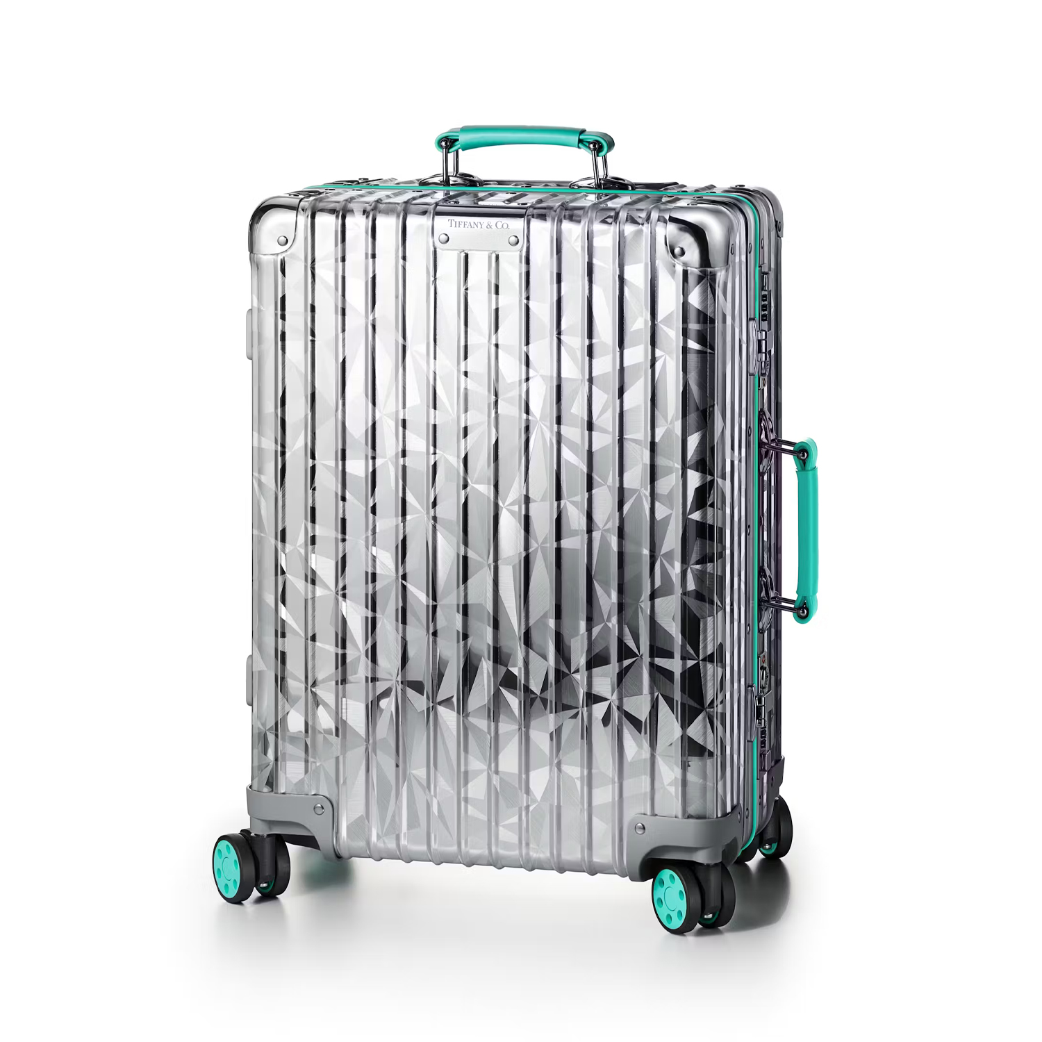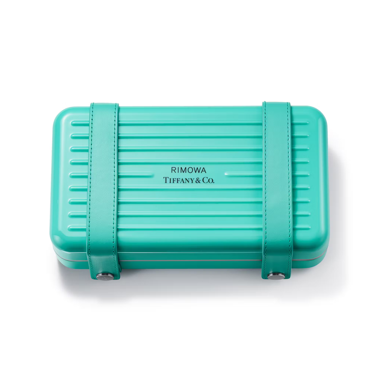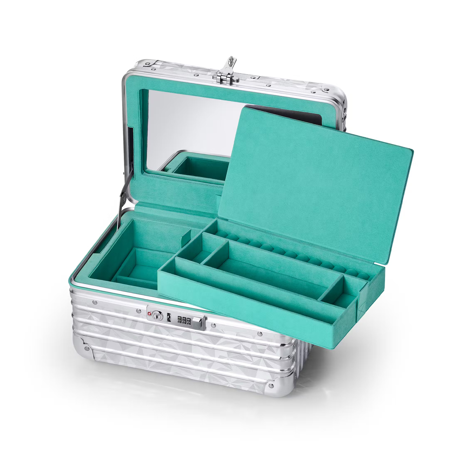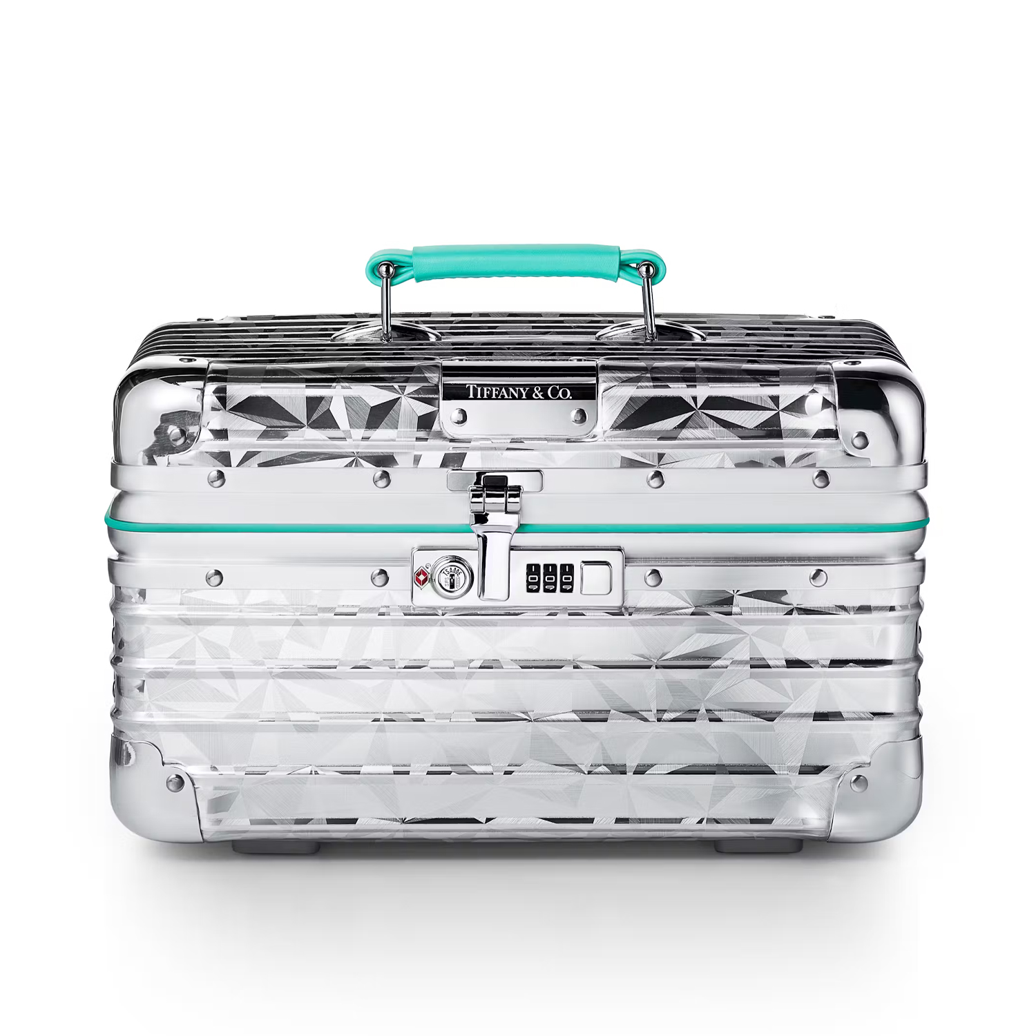 Il primo prodotto è una custodia per gioielli, che combina la superficie in alluminio scanalato di Rimowa con il leggendario motivo Rock Cut di Tiffany & Co. Il case in questione presenta il simbolo “T” e, naturalmente, la iconica colorazione Tiffany Blue che si impone prominente sulla maniglia del portagioielli a tre livelli.