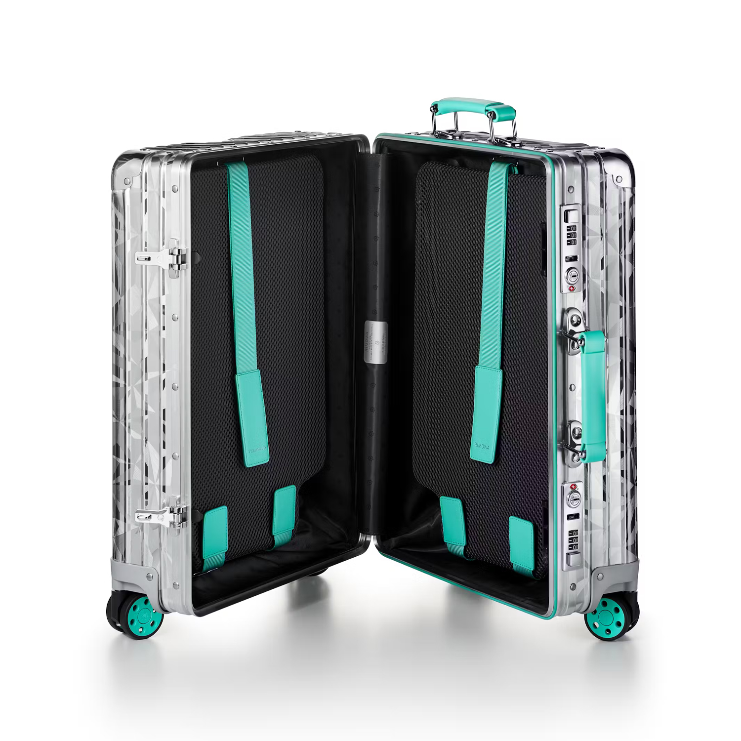 Il secondo item invece, la valigia Classic di Rimowa, viene completamente adattato alle esigenze estetiche dei clienti dell’azienda tedesca dotandosi di ruote, etichetta per bagaglio e maniglie in colorazione Tiffany Blue. All’interno della valigia (rivestita esternamente dal motivo Rock Cut che riprende le sembianze di un diamante) si trovano sei scomparti pensati appositamente per ottimizzare il collocamento dei propri oggetti personali in preparazione a qualsiasi tipo di viaggio.