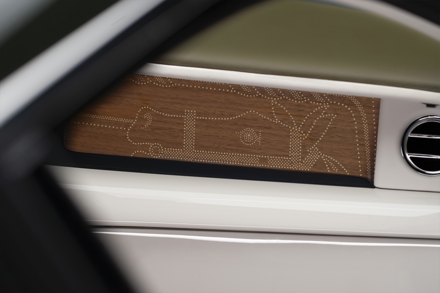 A completare il quadro rendendo ancora più esclusiva la vettura, infine, troviamo una serie di pannelli in legno di noce Open Pore Royal Walnut, impiegati sia per le griglie degli altoparlanti nelle portiere che per la consolle centrale. Quest’ultima è finemente decorata con un motivo realizzato a mano in Soft Seashell White, raffigurante gli iconici motivi equestri tipici di Hermès e ispirato alle creazioni dell’artista e illustratore francese Pierre Péron.