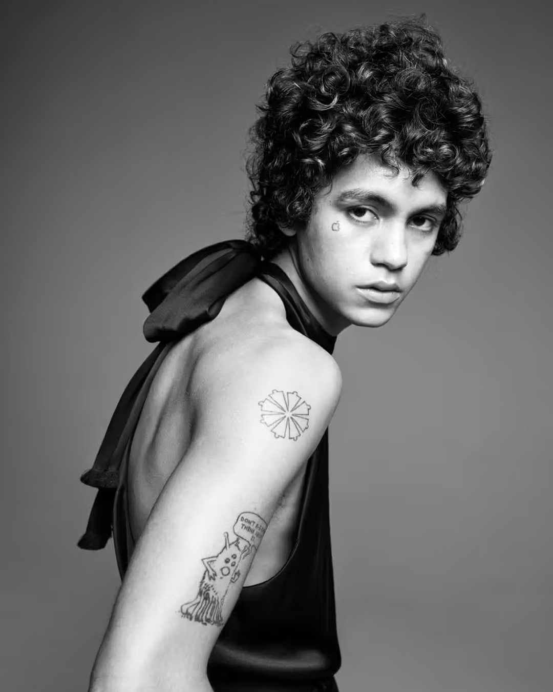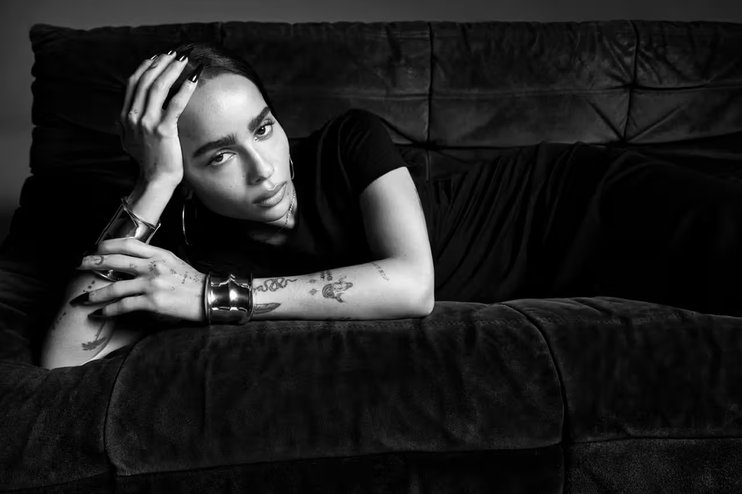 Anche Zoe Kravitz, con il suo look tanto essenziale quanto raffinato, conquista i riflettori della nuova campagna Saint Laurent posando sdraiata su un divano in tessuto che si accosta perfettamente all’abito scuro indossato dalla modella, completato da accessori e dai particolari tatuaggi esibiti nel corpo della star.