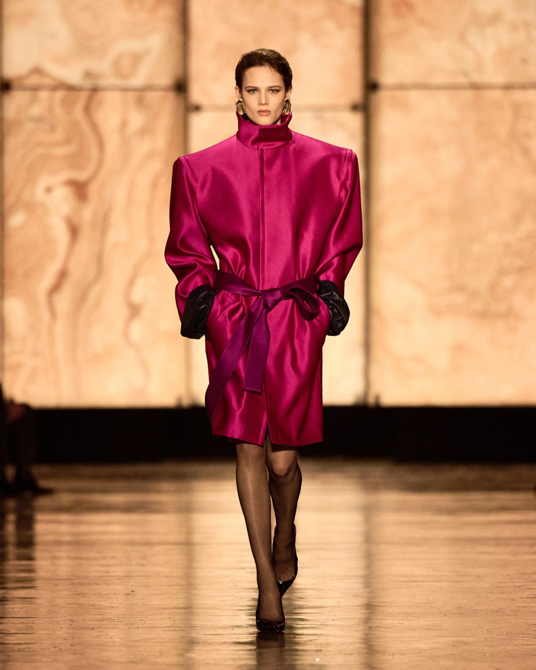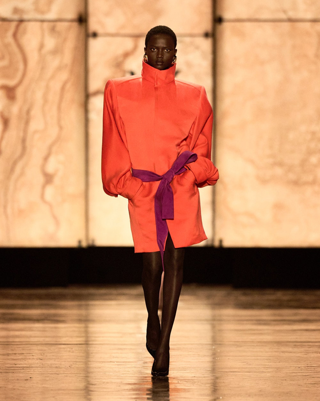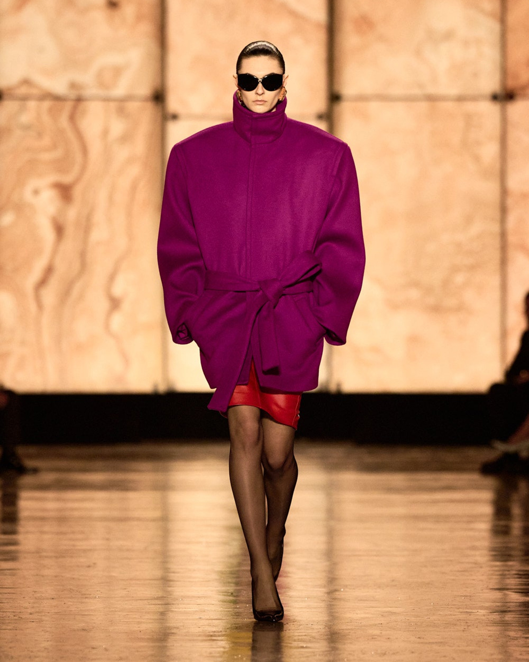 La potenza della semplicità. È tutto un gioco di proporzioni, forme definite e colori pieni che, combinati tra loro, danno vita alla nuova collezione Winter 25 firmata Saint Laurent. «Volevo qualcosa di pulito, senza ornamenti, senza decorazioni», spiega Anthony Vaccarello che guarda agli anni Novanta per presentare la sua collezione più colorata di sempre. Un indizio sull’ispirazione era già stato svelato nei giorni precedenti, quando sul profilo Instagram del designer belga è comparso un breve video che riprendeva la musa di Monsieur Yves rispondere alla domanda: «Cosa è Saint Laurent?»