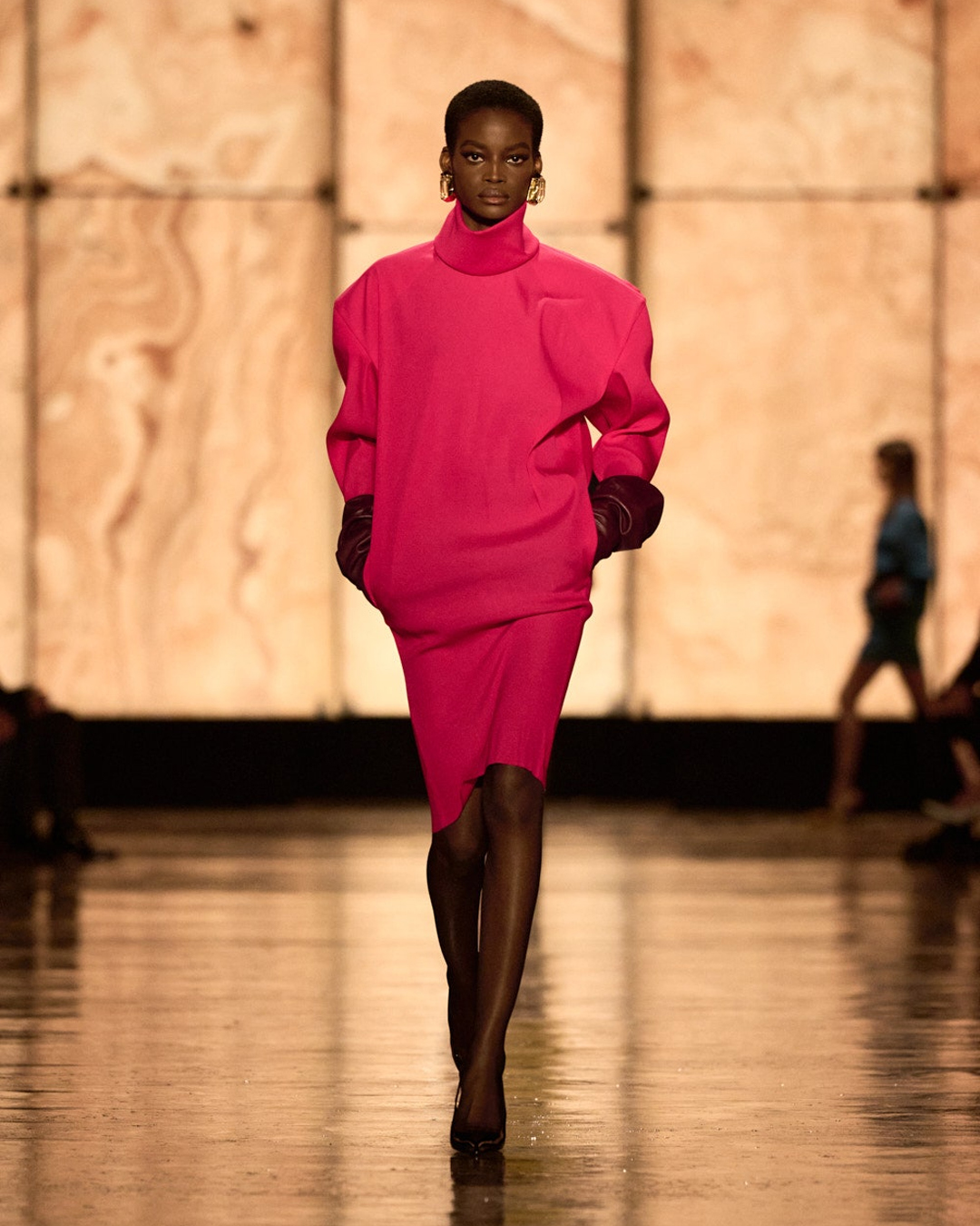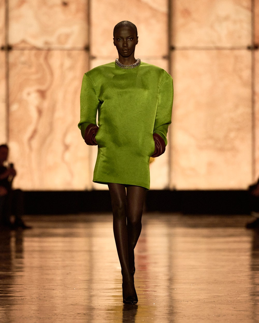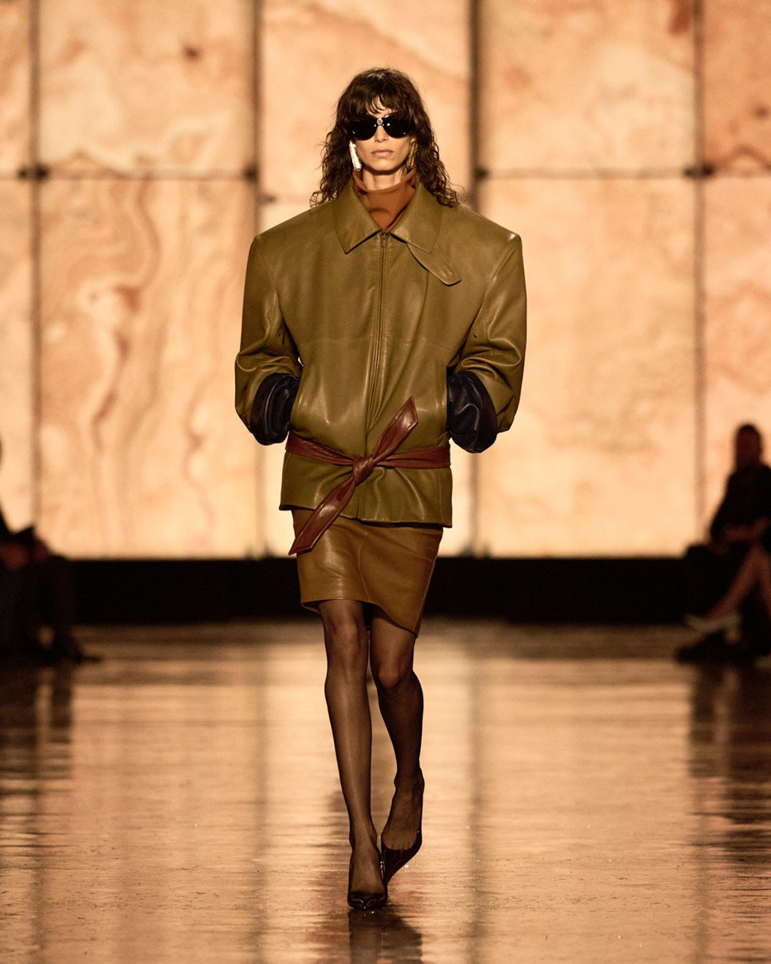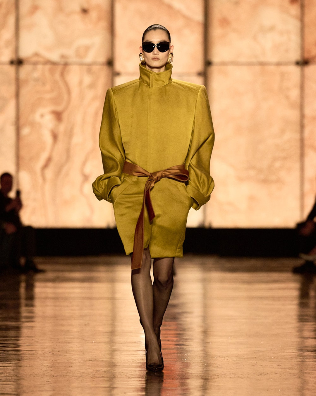 La potenza della semplicità. È tutto un gioco di proporzioni, forme definite e colori pieni che, combinati tra loro, danno vita alla nuova collezione Winter 25 firmata Saint Laurent. «Volevo qualcosa di pulito, senza ornamenti, senza decorazioni», spiega Anthony Vaccarello che guarda agli anni Novanta per presentare la sua collezione più colorata di sempre. Un indizio sull’ispirazione era già stato svelato nei giorni precedenti, quando sul profilo Instagram del designer belga è comparso un breve video che riprendeva la musa di Monsieur Yves rispondere alla domanda: «Cosa è Saint Laurent?»