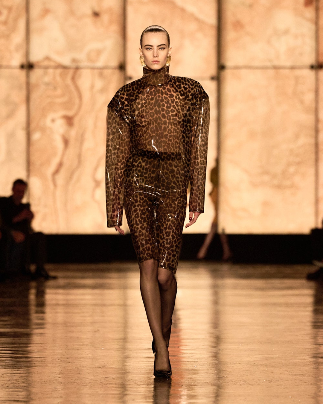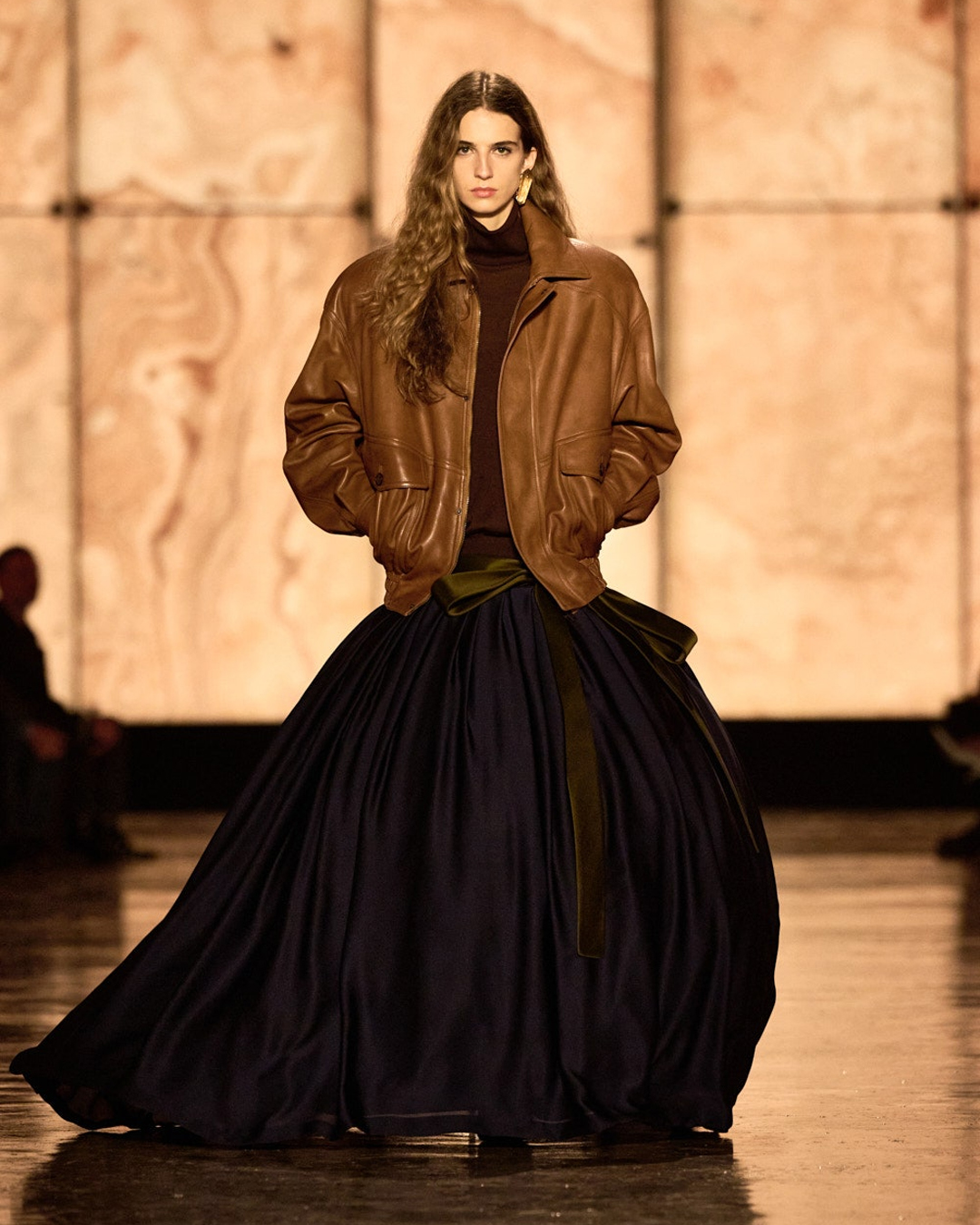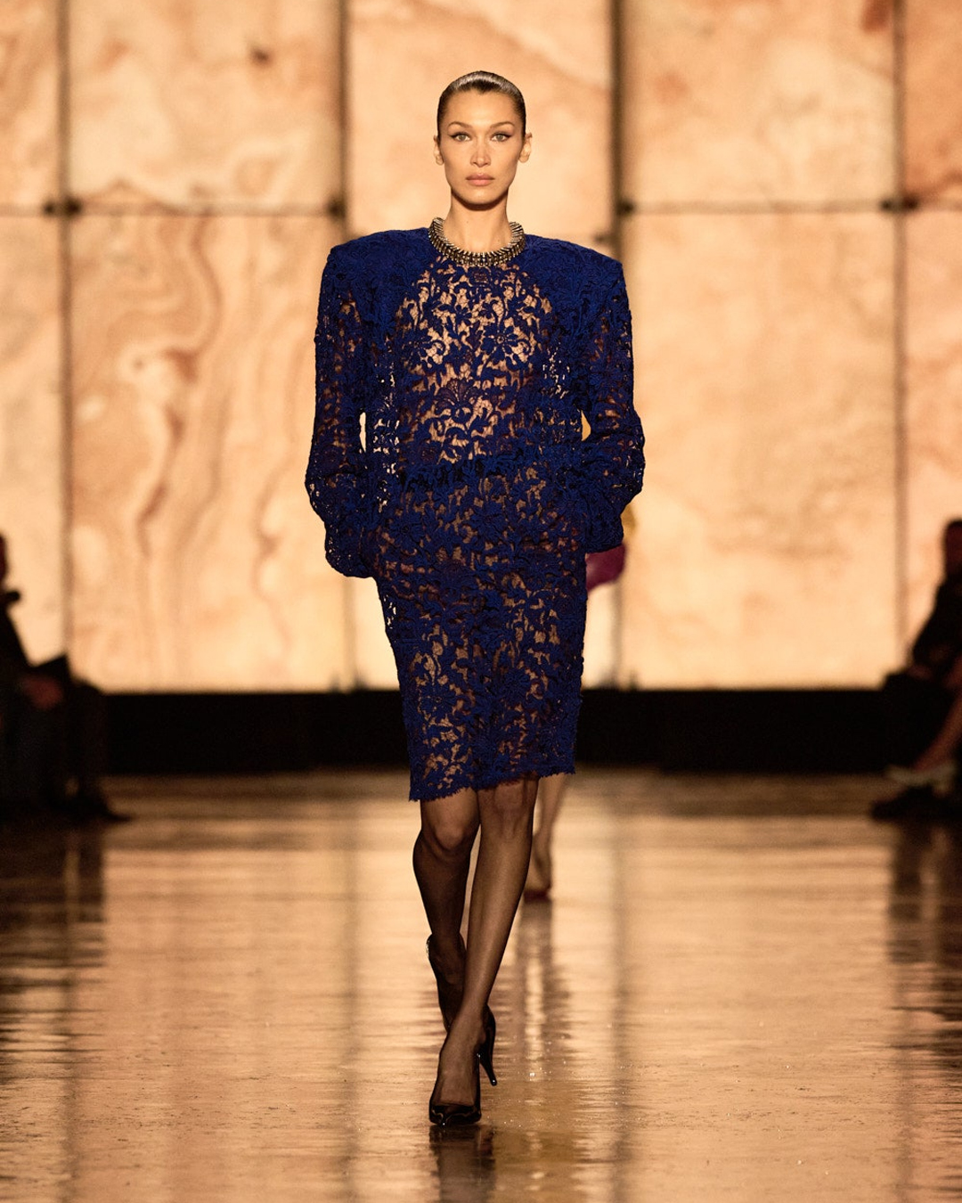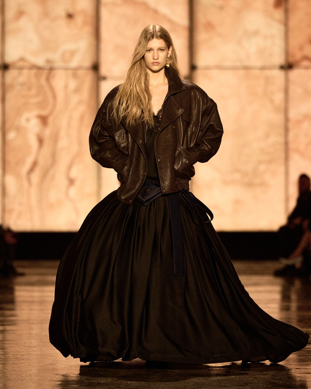 Le gonne sono midi, le bluse hanno il collo alto che termina con un grande fiocco che si appoggia sul retro, unico orpello decorativo concesso. Le giacche hanno le spalle over, esagerate, mentre una cinta morbida si ferma in vita, sempre bassa, anche quando si tratta delle gonne da ballo presentate alla chiusura del défilé. Qualche tocco poi di animalier, plastico nei completi in silicone, e di pizzo, proposto in blu notte nell’abito indossato da Bella Hadid, che calca la passerella ai piedi della Tour Eiffel concedendo l’unico catwalk della stagione. Immancabili poi i bomber in pelle, proposti in tonalità calde per la sera. Pochi abiti ma tanta concretezza.