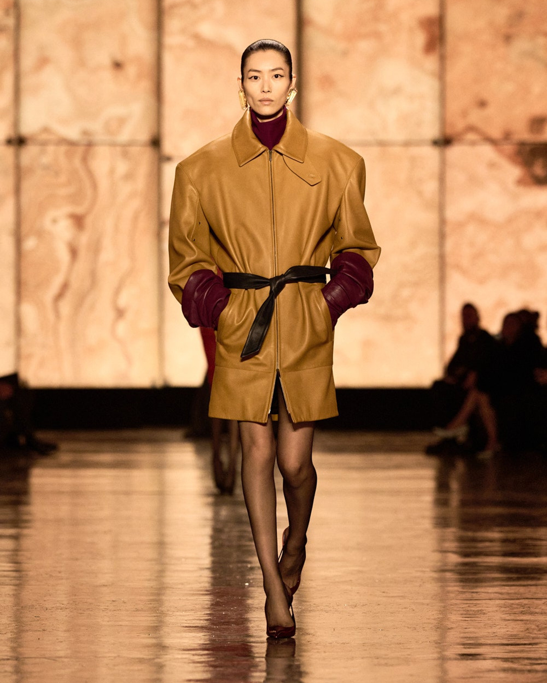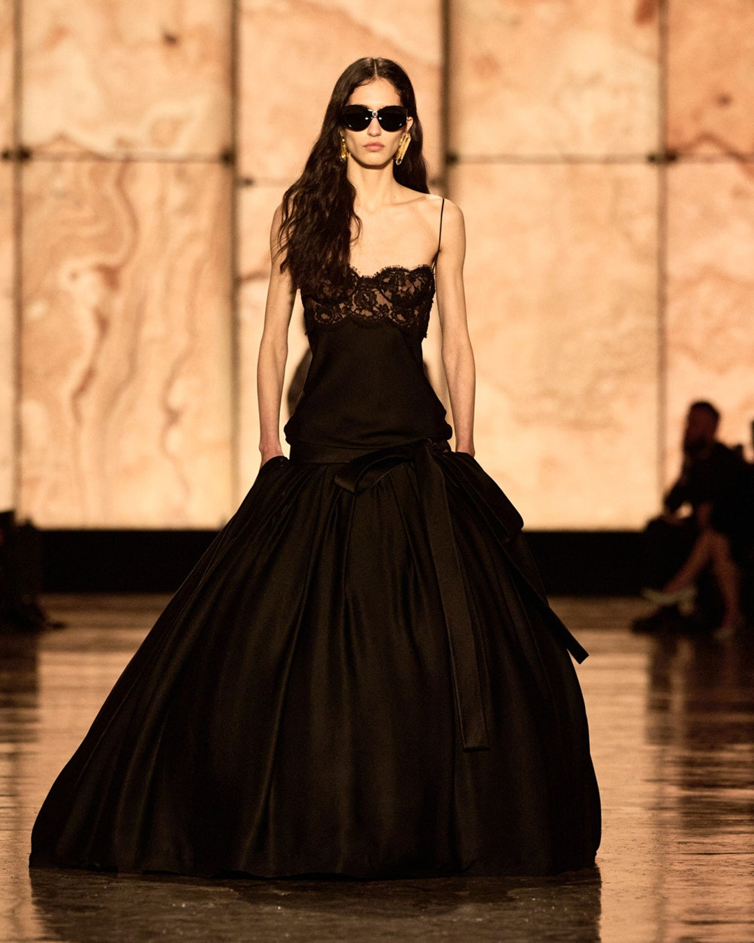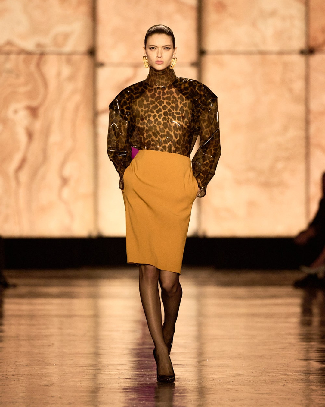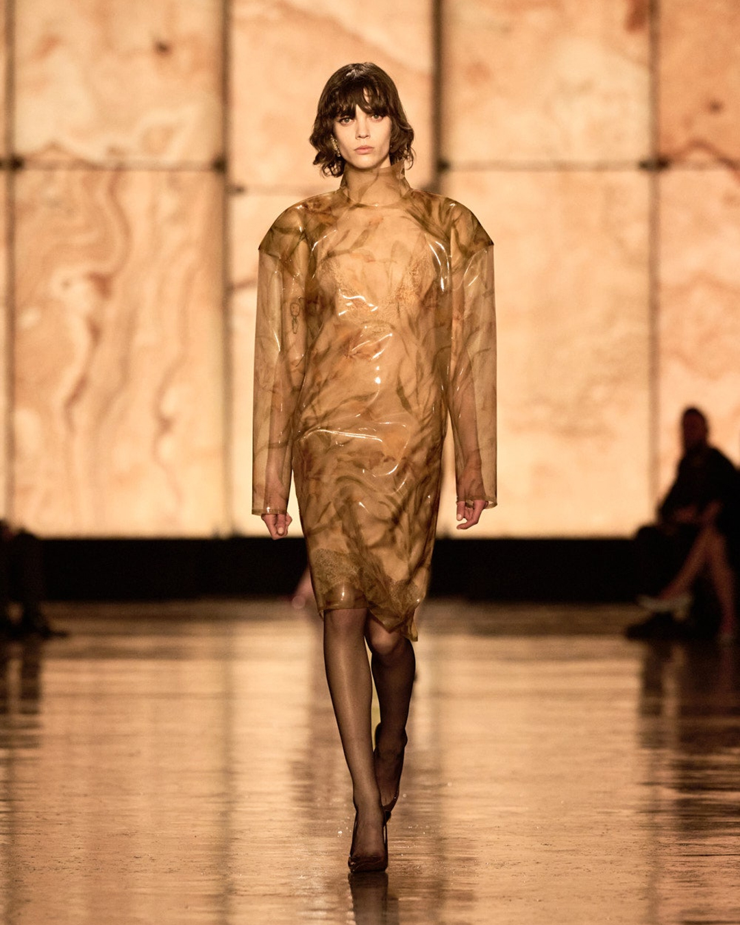 Le gonne sono midi, le bluse hanno il collo alto che termina con un grande fiocco che si appoggia sul retro, unico orpello decorativo concesso. Le giacche hanno le spalle over, esagerate, mentre una cinta morbida si ferma in vita, sempre bassa, anche quando si tratta delle gonne da ballo presentate alla chiusura del défilé. Qualche tocco poi di animalier, plastico nei completi in silicone, e di pizzo, proposto in blu notte nell’abito indossato da Bella Hadid, che calca la passerella ai piedi della Tour Eiffel concedendo l’unico catwalk della stagione. Immancabili poi i bomber in pelle, proposti in tonalità calde per la sera. Pochi abiti ma tanta concretezza.