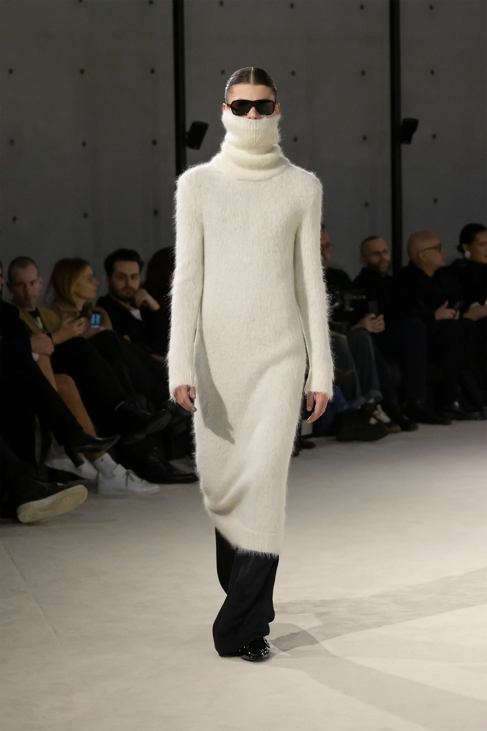 Proseguendo si osserva poi la presenza di camicie in chiffon e tuniche in maglia con cappuccio (motivo che viene ripreso dalla collezione SS23 presentata in Marocco), rigorosamente abbinate a comodi pantaloni che sfiorano il terreno. Sono proprio questi i look che testimoniano le due facce dell’operato di Vaccarello, di cui rispettivamente una più composta e tradizionalista ispirata alle classiche costruzioni Saint Laurent, e una più comoda e minimalista.