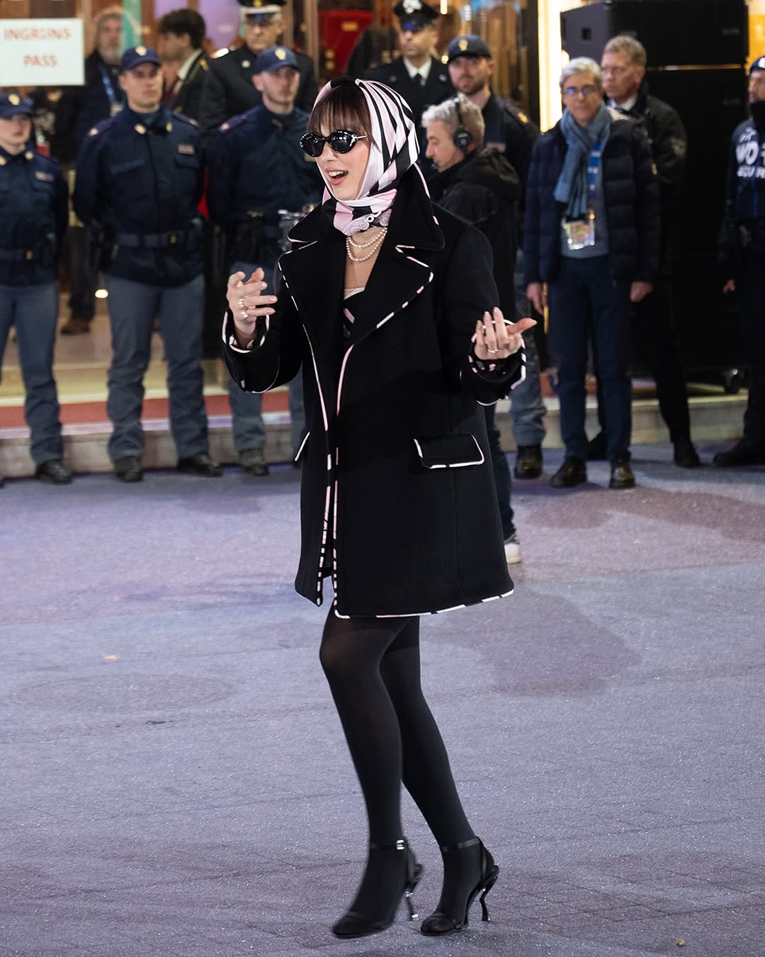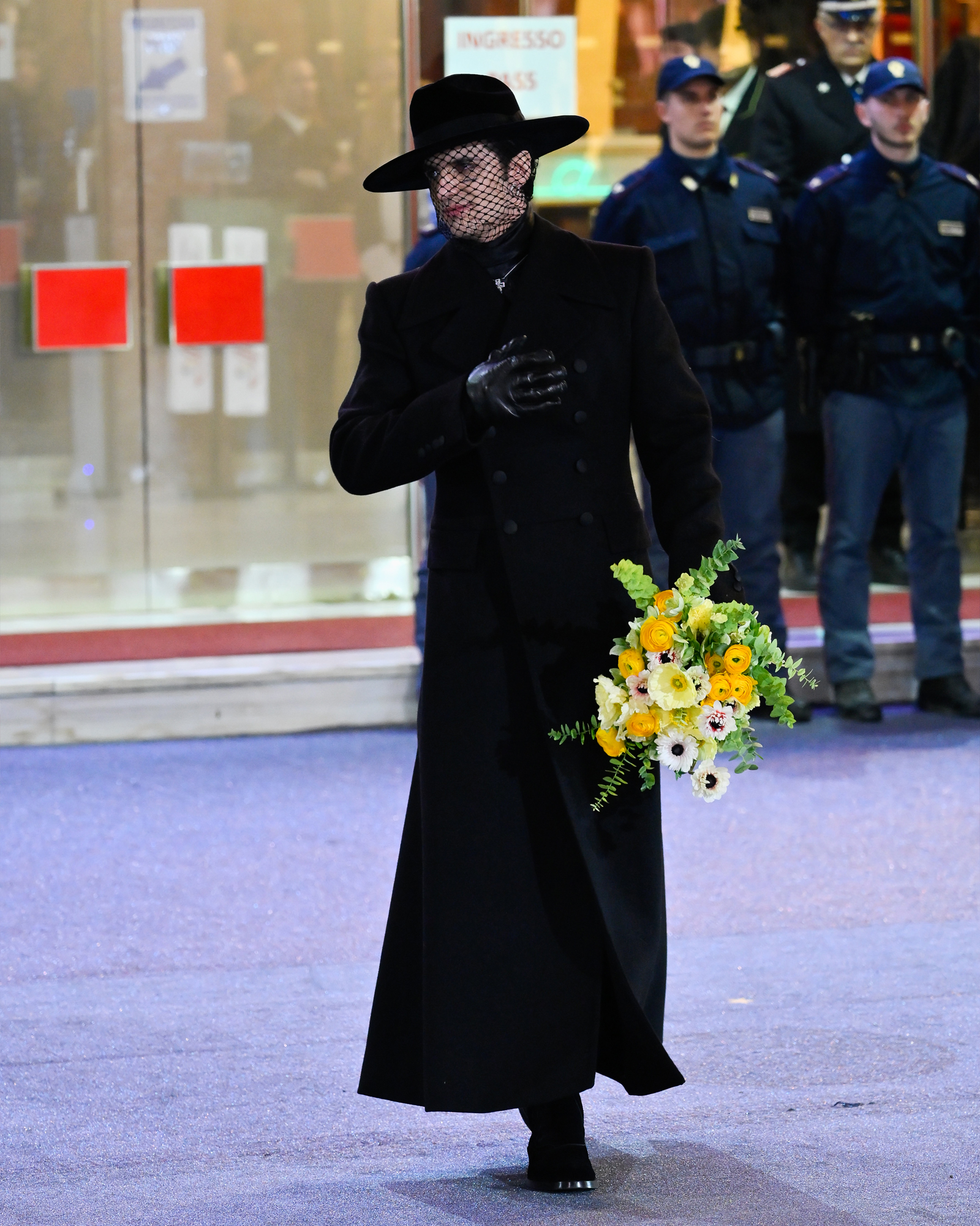 A chiudere la sfilata, Gaia in un total white di MM6 Maison Margiela, raggiunta poi da Elodie, il suo cigno nero, in Mugler. Insieme proseguono il buon proposito lanciato dal FantaSanremo della scorsa edizione, quello di vestirsi di bianco o di nero. Perché ormai la competizione canora segue due strade parallele: una premia il valore della musica, l’altra quello dello spettacolo. Ed entrambe sono strade valide.