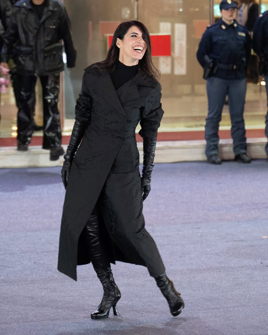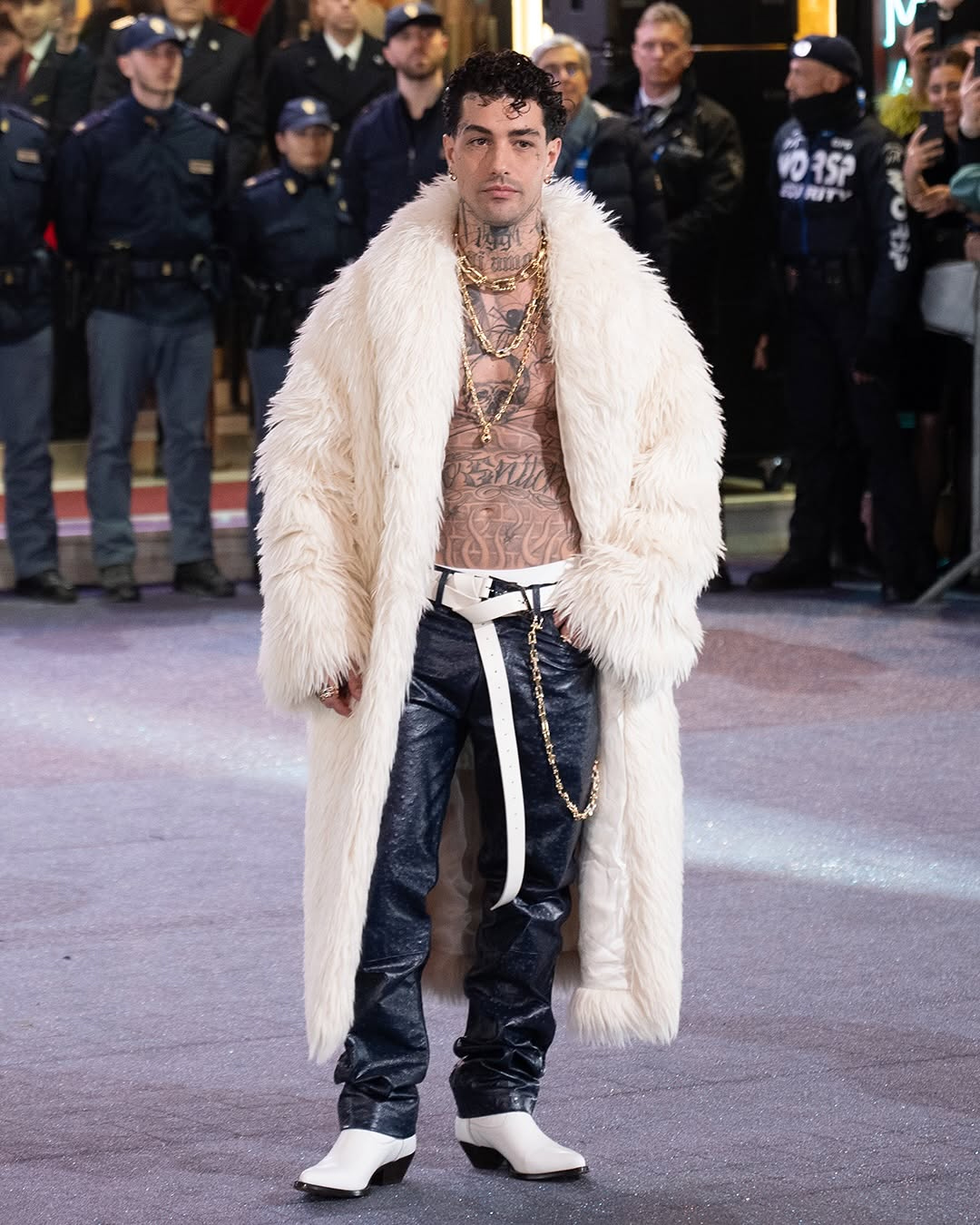 Impossibile non notare Shablo, Joshua, Tormento e Guè in C.P. Company, completamente rivestiti di pelle nera, seguiti da Giorgia in Dior, che conferma la sua duratura collaborazione con Maria Grazia Chiuri, e Rose Villain con un outfit dall’estetica punk firmato Fendi. Il leather look sembra essere il favorito insieme al prevalere di cappotti lunghissimi, collant velati e stivali importanti.
