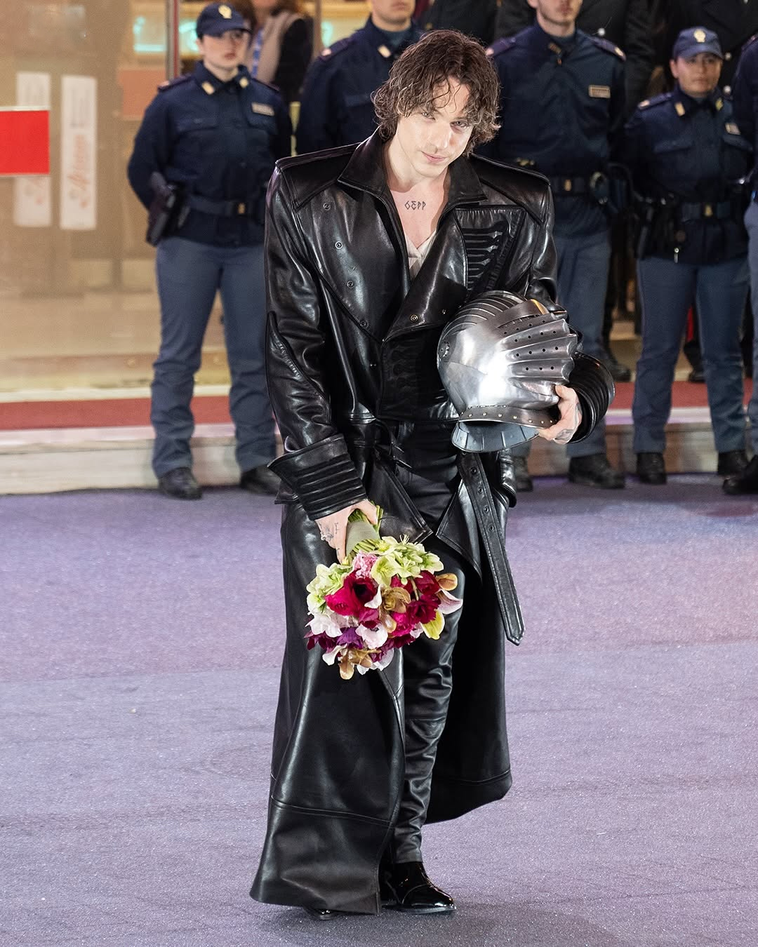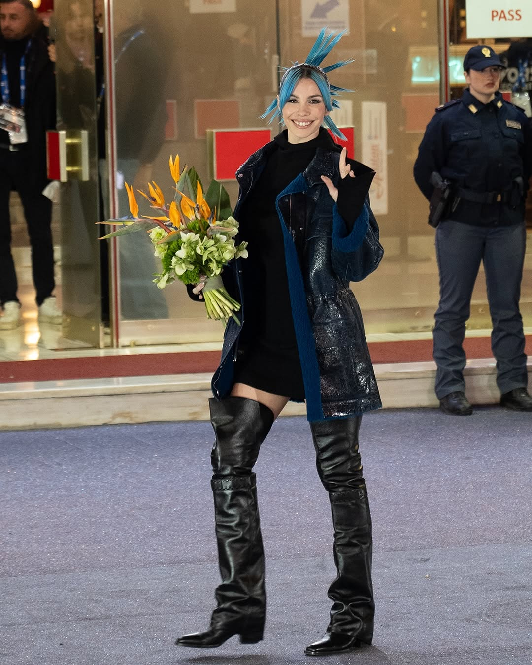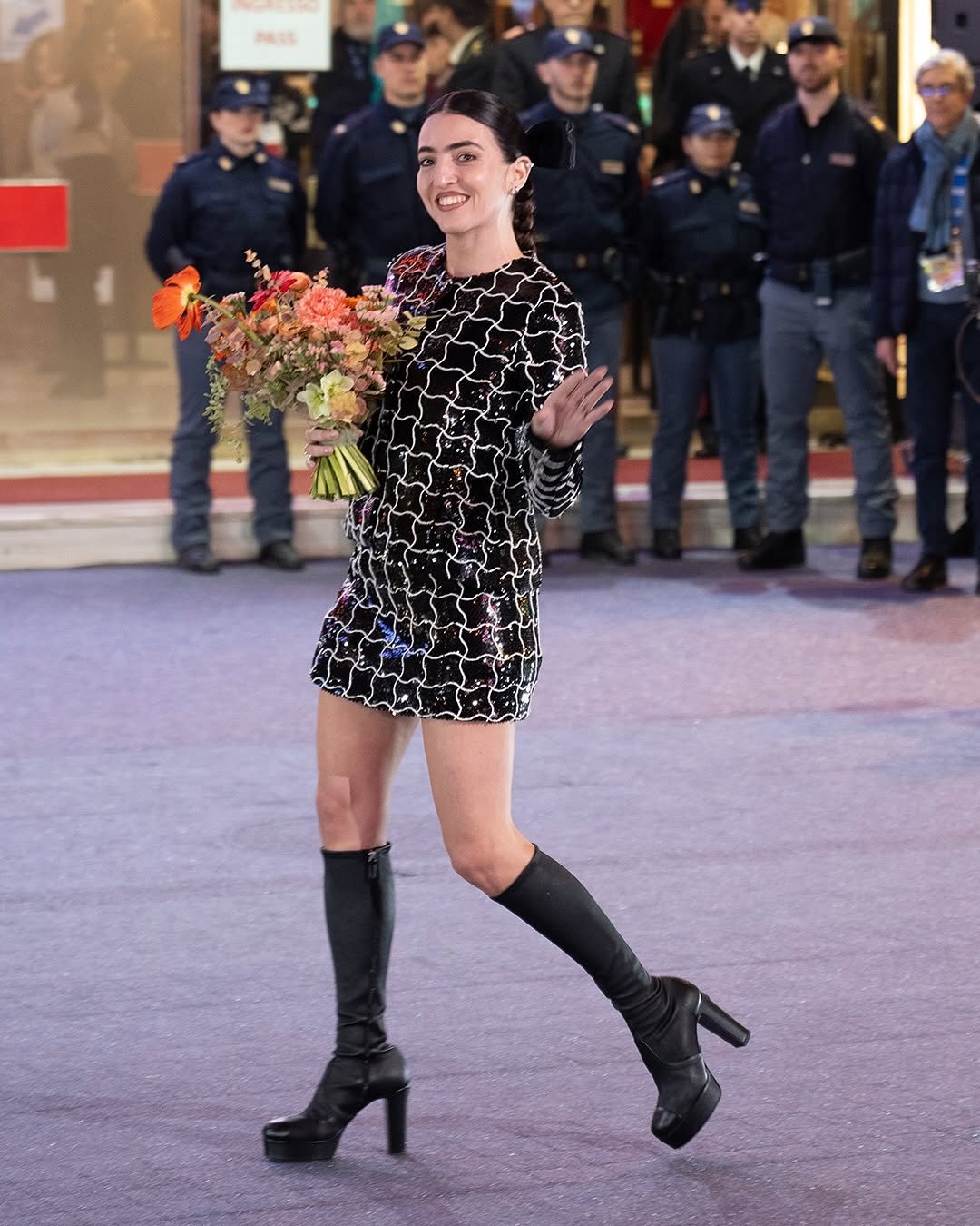 Per la prima volta sono arrivate a Sanremo Sarah Toscano, ex vincitrice di Amici, in Emilio Pucci, e Joan Thiele in Chanel, accompagnate dai più audaci Tony Effe in The Attico con gioielli Tiffany & Co. – perché c’erano più accessori che altro – e Irama in Balmain, con tanto di casco da cavaliere, un chiaro rimando ai red carpet americani con Zendaya e la cantante Chappell Roan.