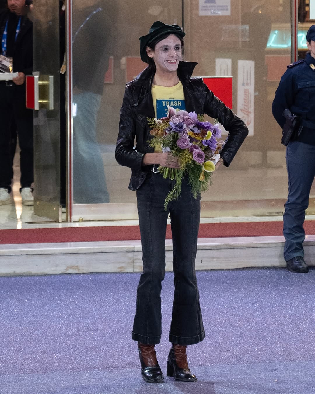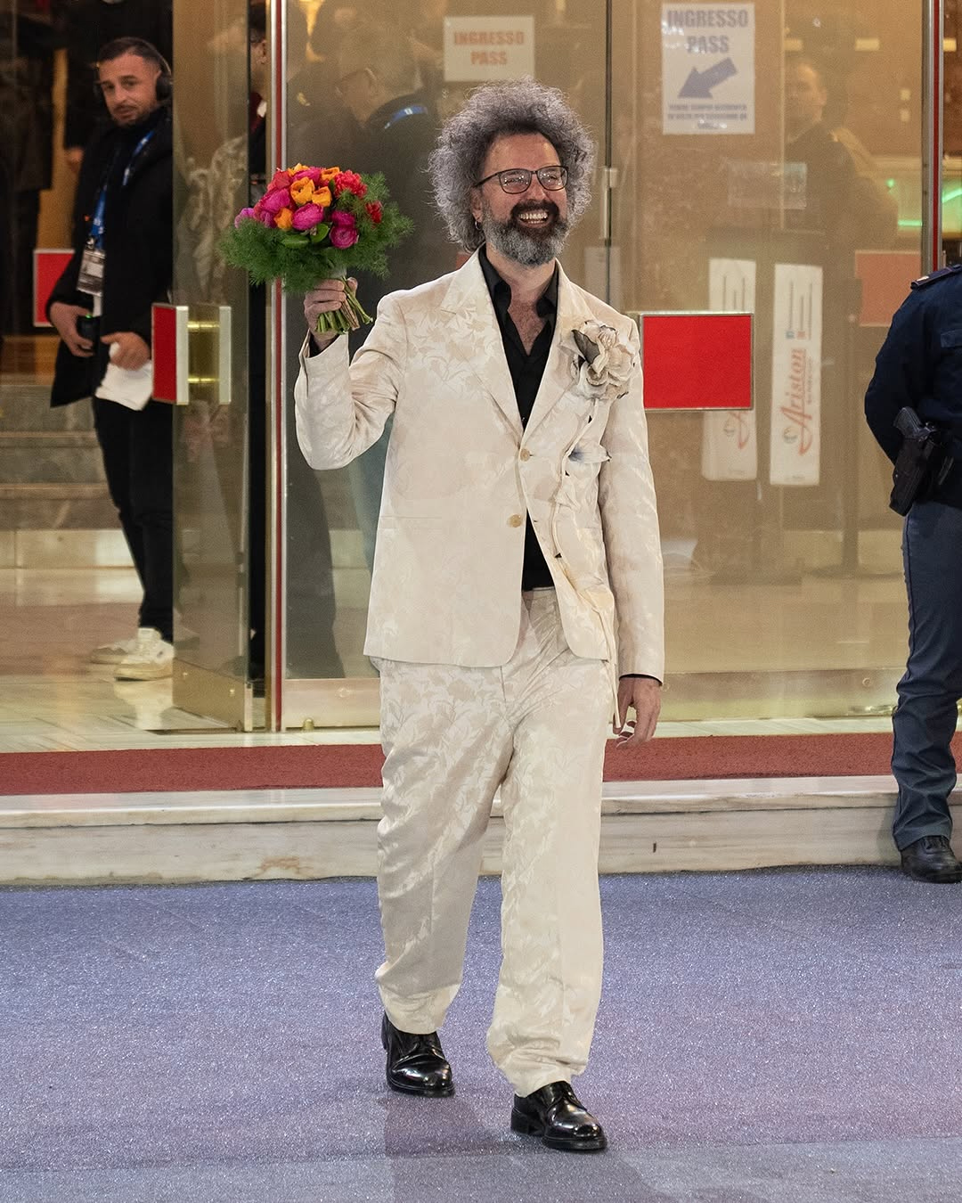 A catturare l’attenzione, però, sono due artisti che forse con la moda hanno sempre giocato poco, lasciando più spazio alla musica: Simone Cristicchi in Antonio Marras e Lucio Corsi, di cui non si hanno riferimenti precisi, ma che – all’indomani del Super Bowl – non può fare a meno di risultare particolarmente cool con i suoi flare jeans.