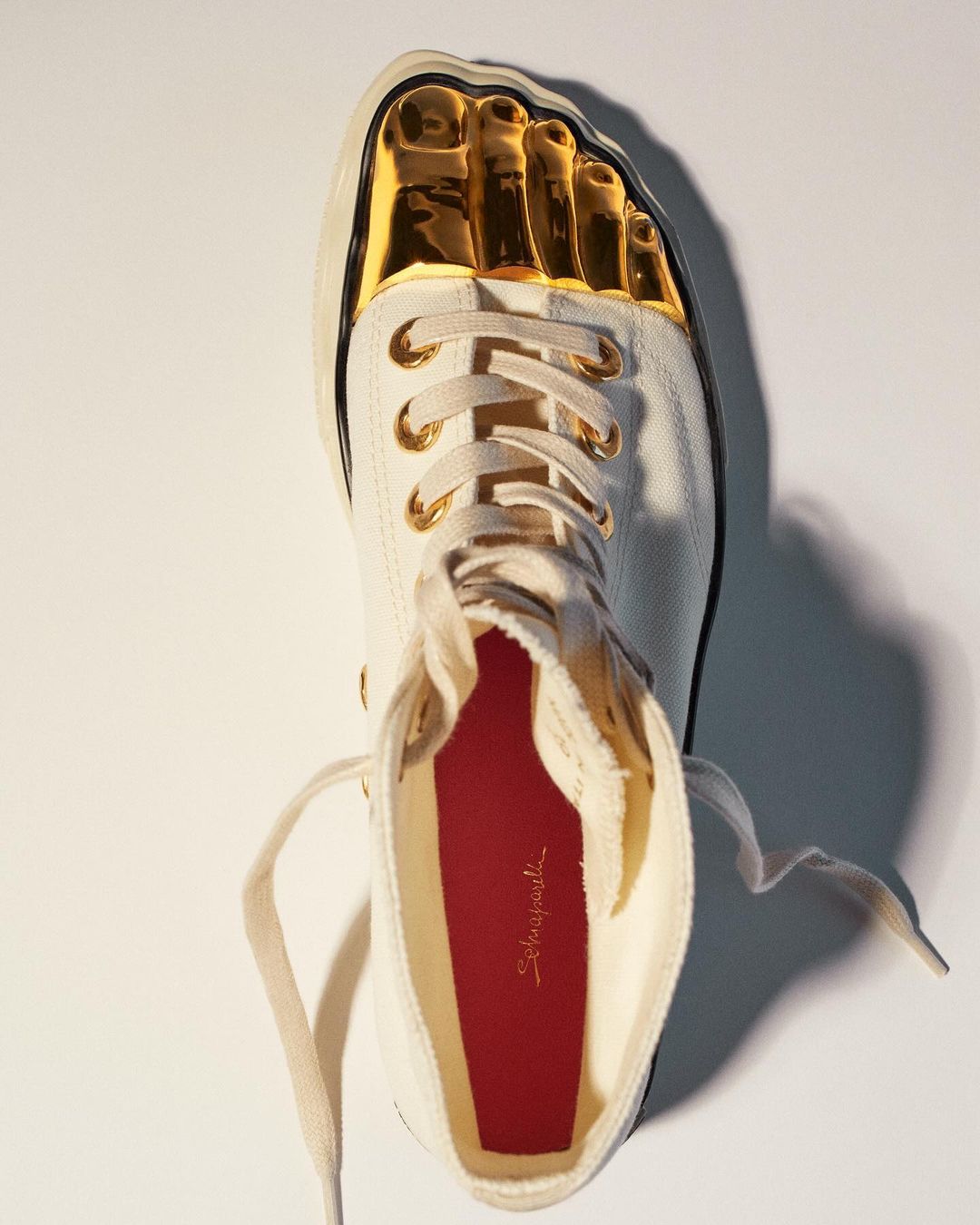 Per la prima volta nella sua storia Schiaparelli presenta un paio di sneaker: il direttore creativo Daniel Roseberry ha infatti lanciato le “Gold Toe Trainers”, già svelate durante la sfilata Summer 2024 del brand.