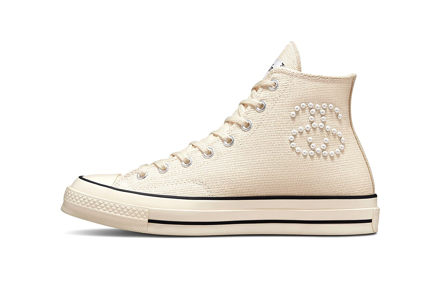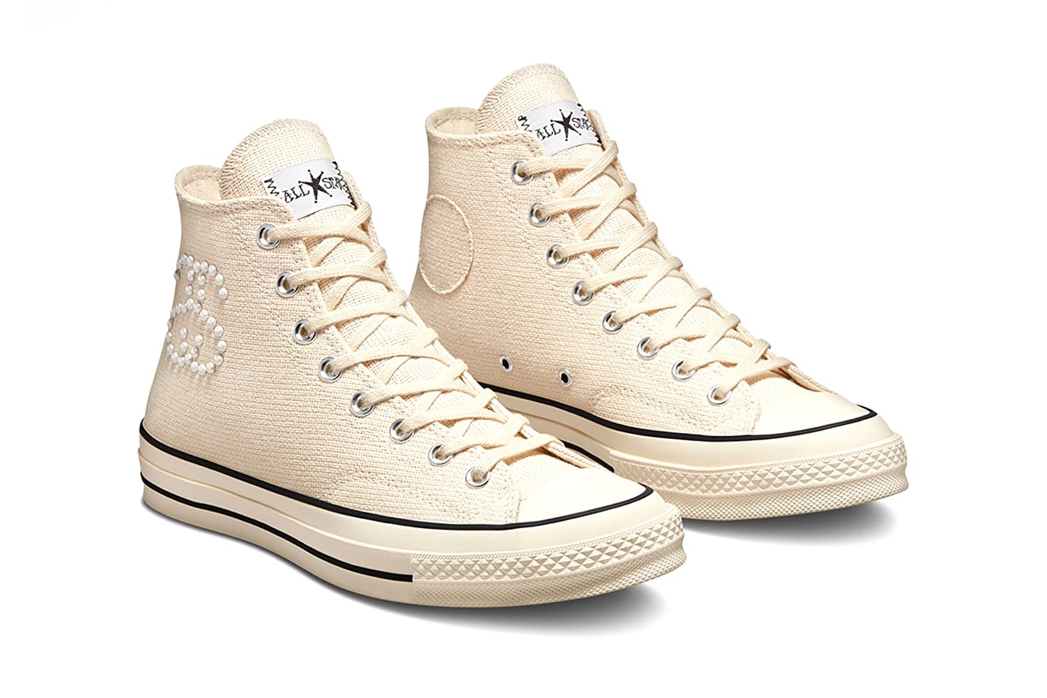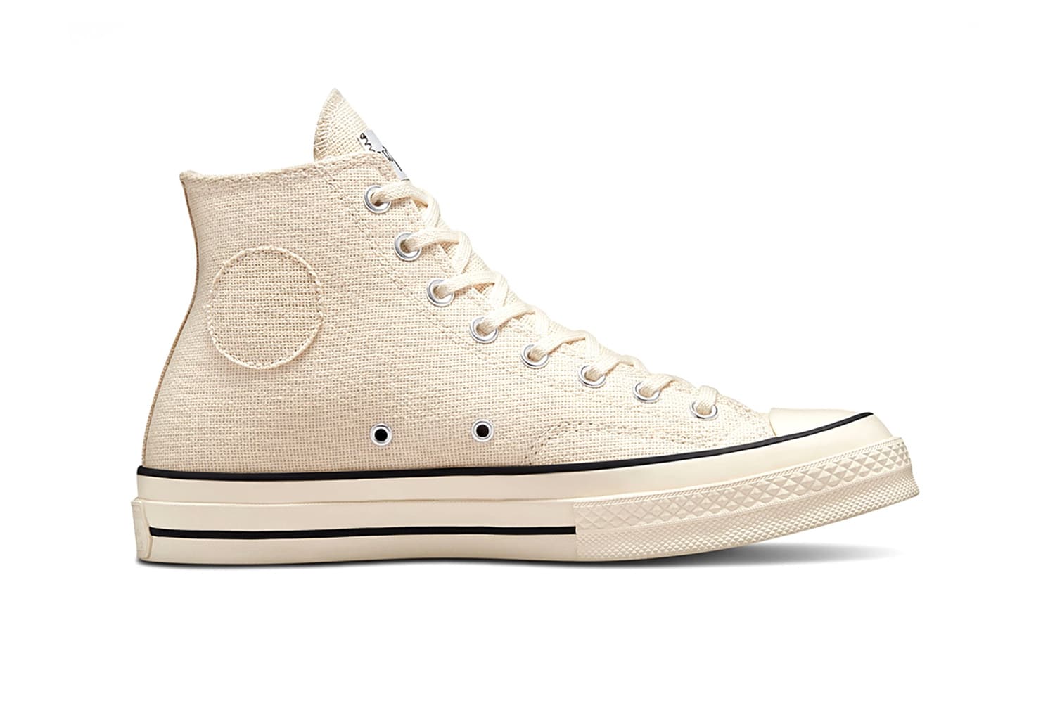 Con una struttura in lino leggera e fresca, il modello si dimostra perfetto per l’imminente stagione estiva: in termini di dettagli, Stüssy ha optato per l’applicazione di un logo borchiato che impreziosisce la sezione laterale, mentre il logo Converse sulla patch mediale è stato sostituito da un semplice branding in lino. Le solette co-branded richiamano l’iconografia della collaborazione a completamento del design.