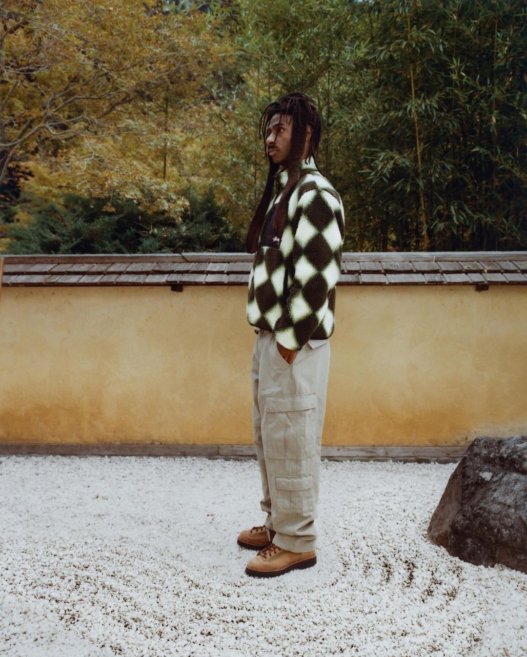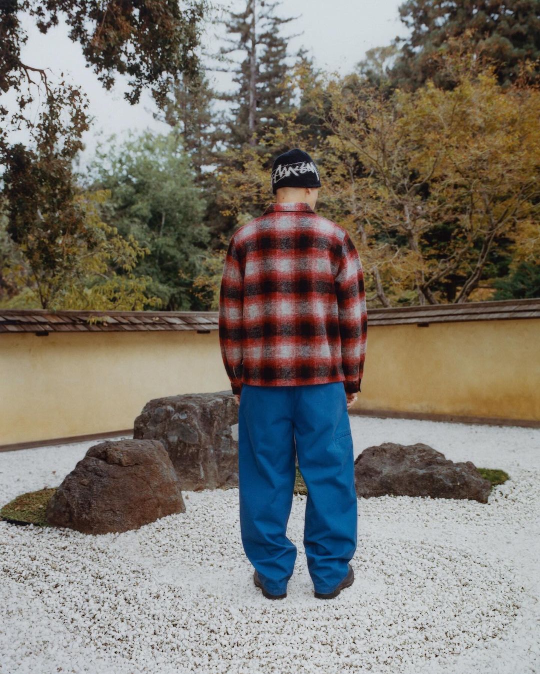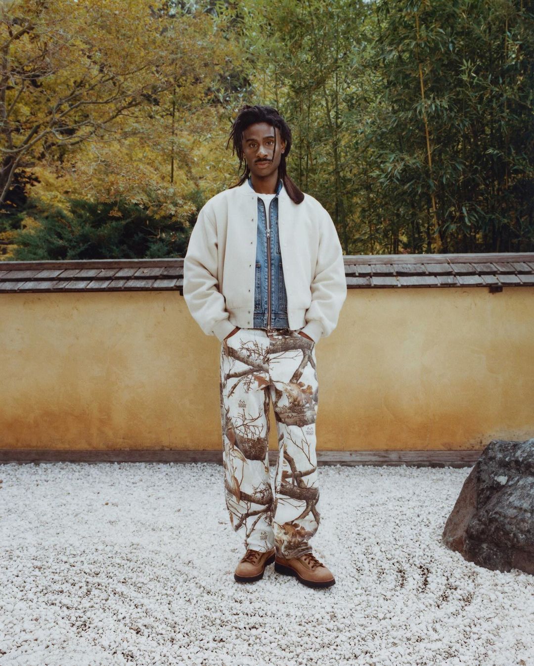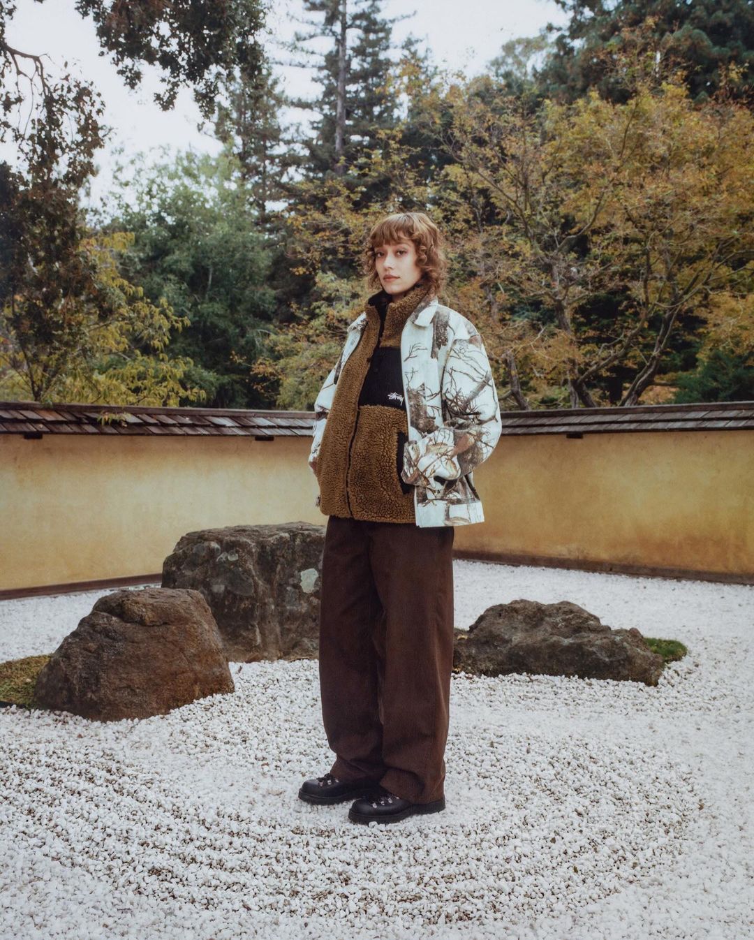 L’attenzione, ancora una volta, è immediatamente catturata dalla linea di capispalla, che si compone di alcuni dei simboli di Stüssy, come ad esempio i piumini in nylon, i lunghi cappotti a quadri in mohair, bomber in morbido shearling e chore coat che richiamano l’abbigliamento workwear. La linea holiday 2023 di Stüssy, inoltre, porta con sé l’iconico pattern “Real Trees” che si esprime su pantaloni e giacche da lavoro, accanto a fantasie camouflage e animalier.