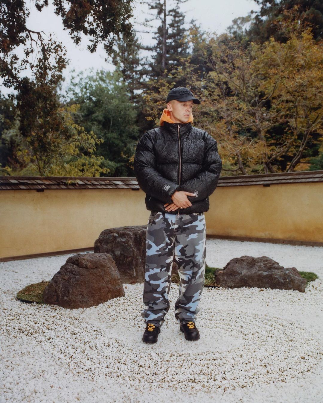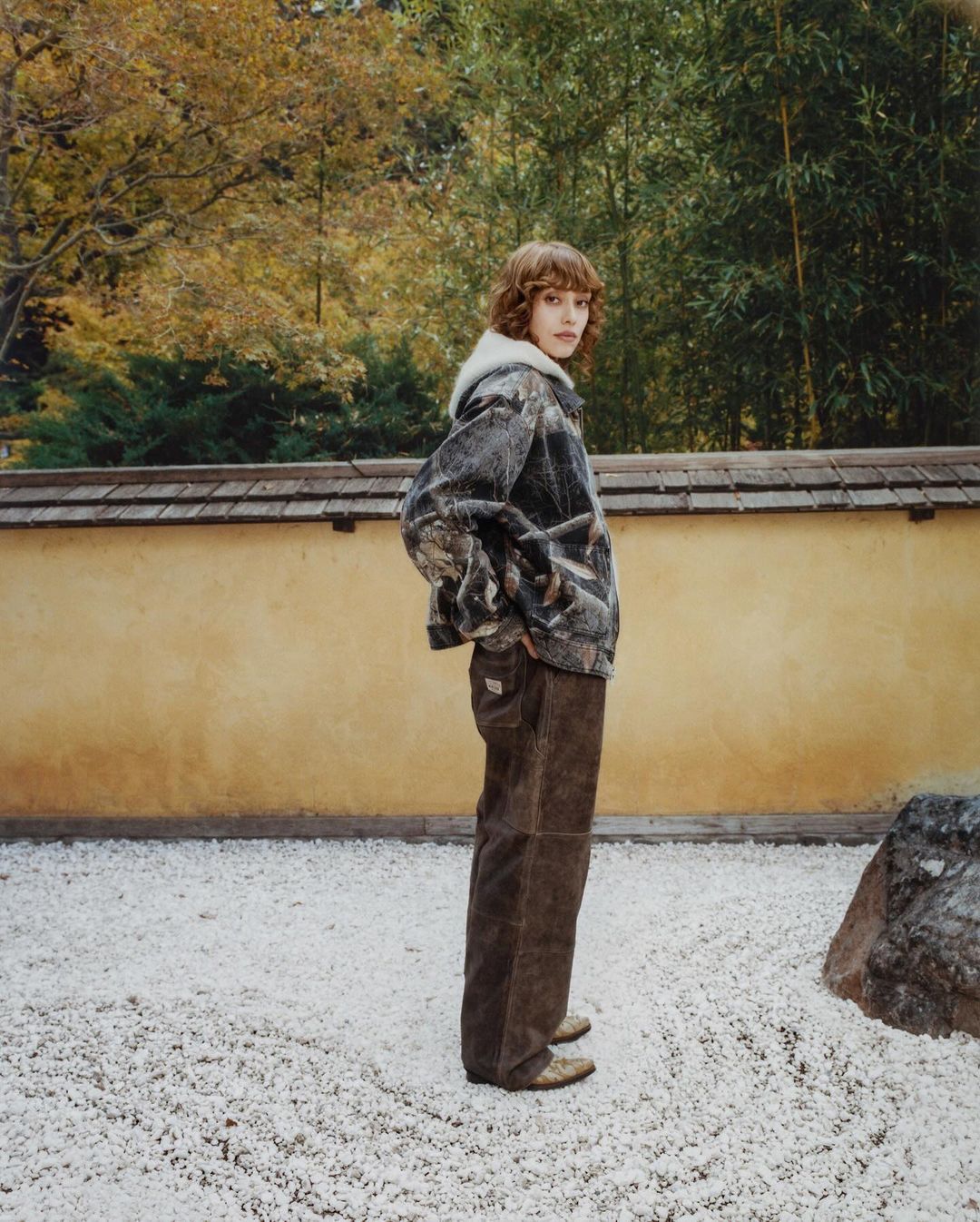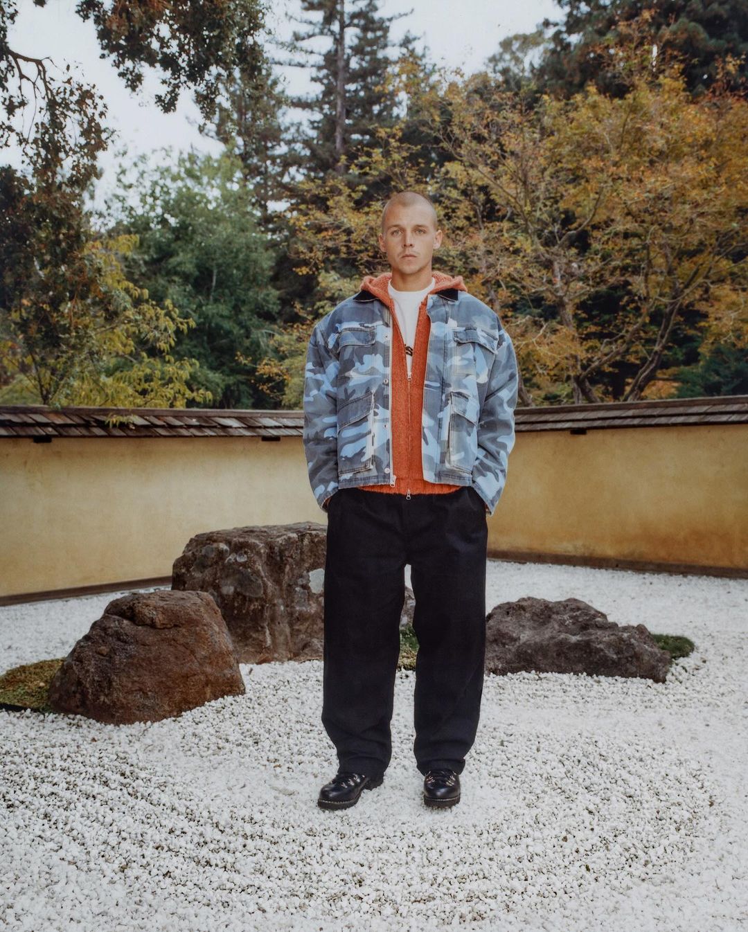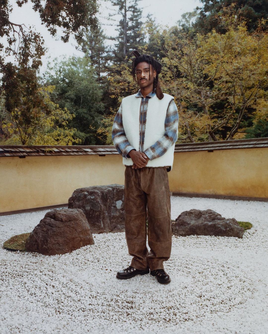 L’attenzione, ancora una volta, è immediatamente catturata dalla linea di capispalla, che si compone di alcuni dei simboli di Stüssy, come ad esempio i piumini in nylon, i lunghi cappotti a quadri in mohair, bomber in morbido shearling e chore coat che richiamano l’abbigliamento workwear. La linea holiday 2023 di Stüssy, inoltre, porta con sé l’iconico pattern “Real Trees” che si esprime su pantaloni e giacche da lavoro, accanto a fantasie camouflage e animalier.