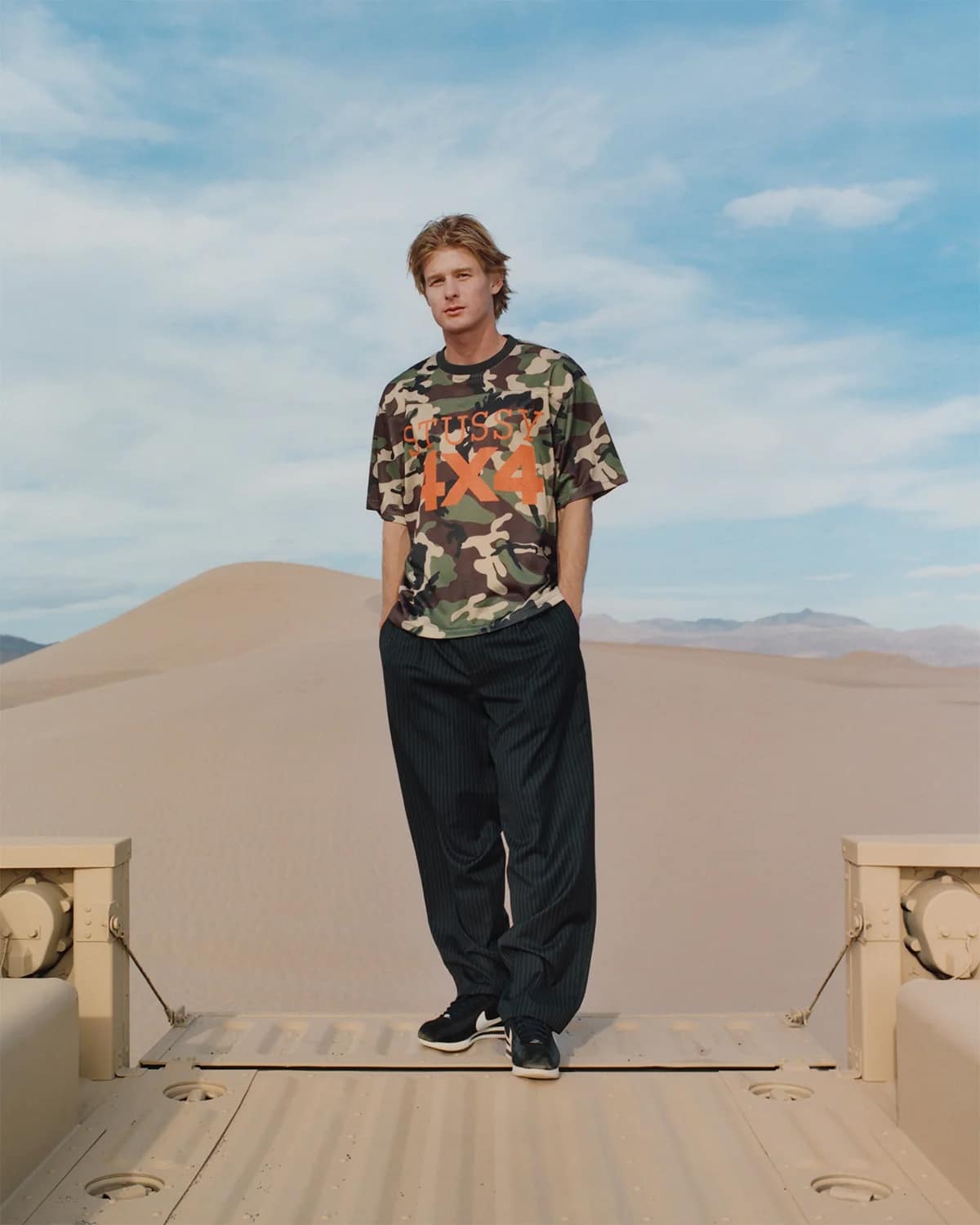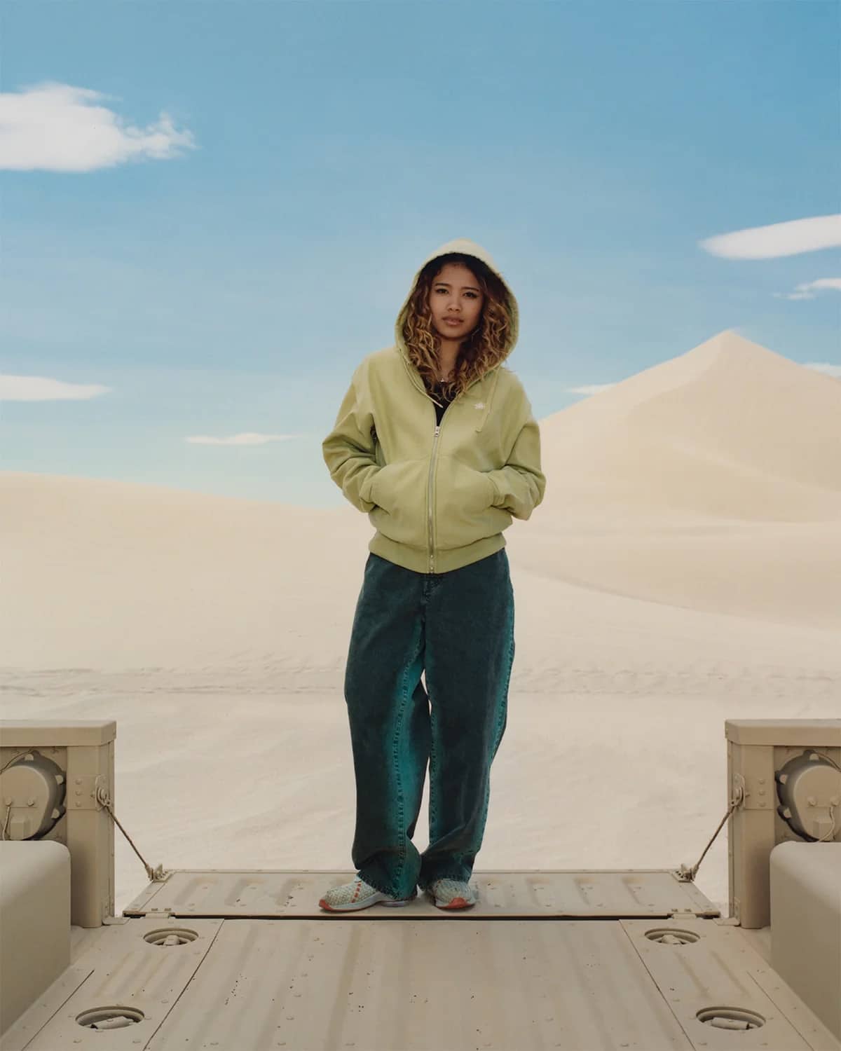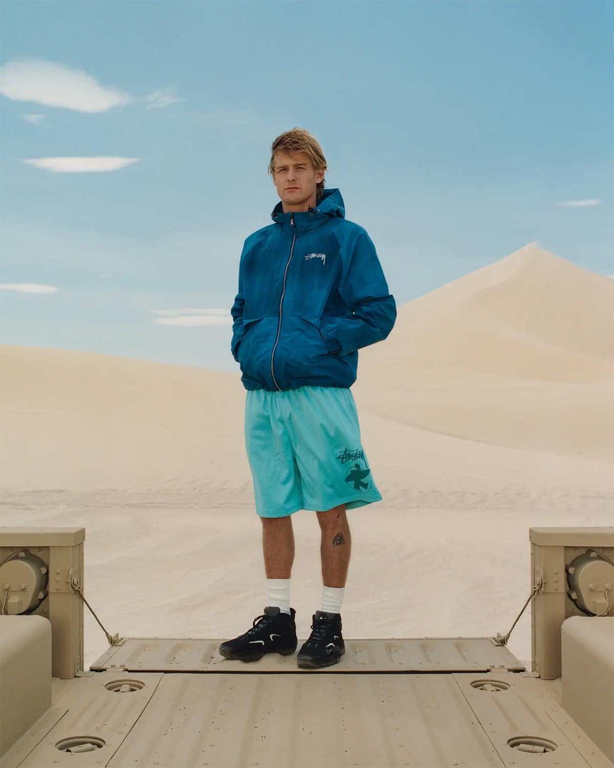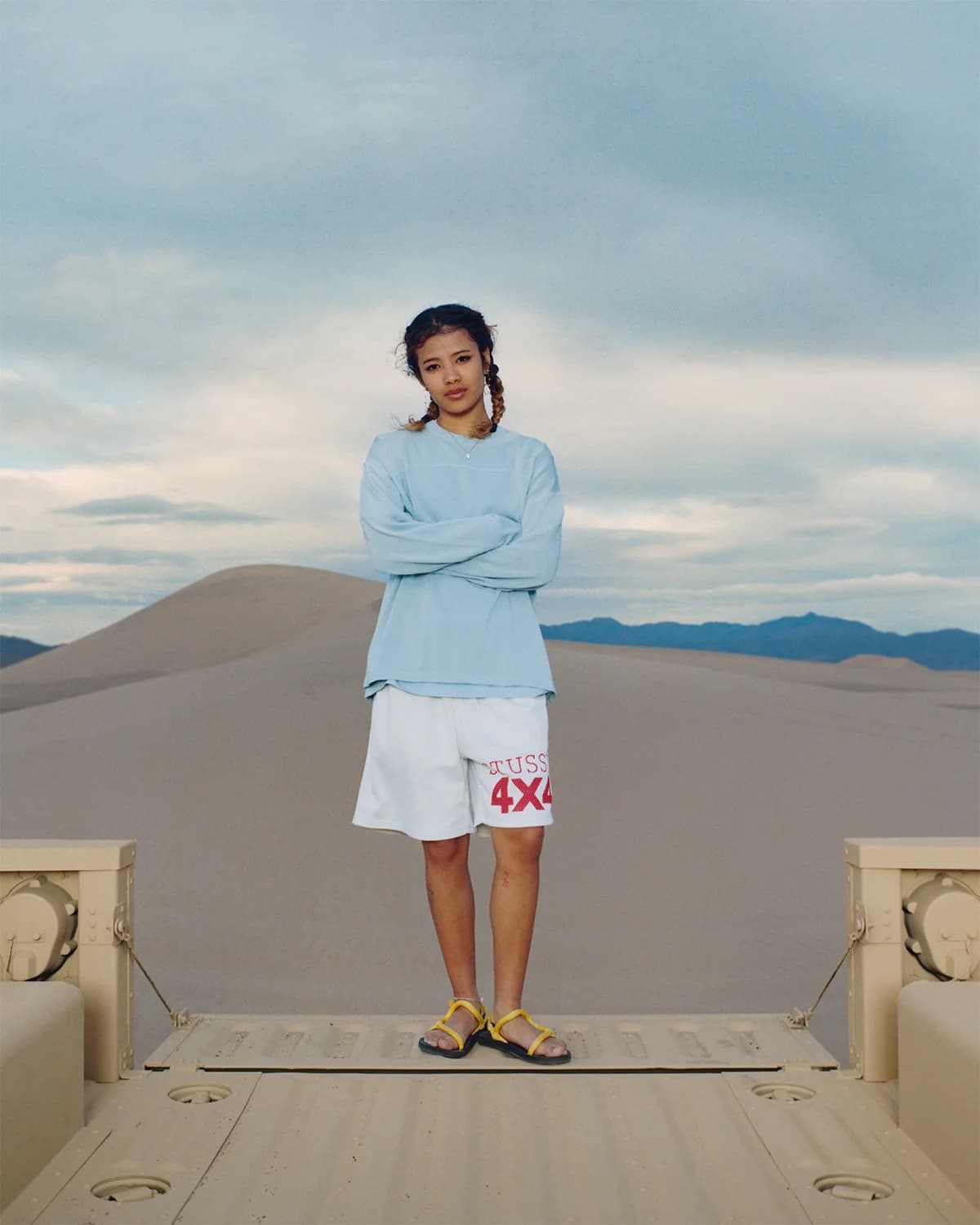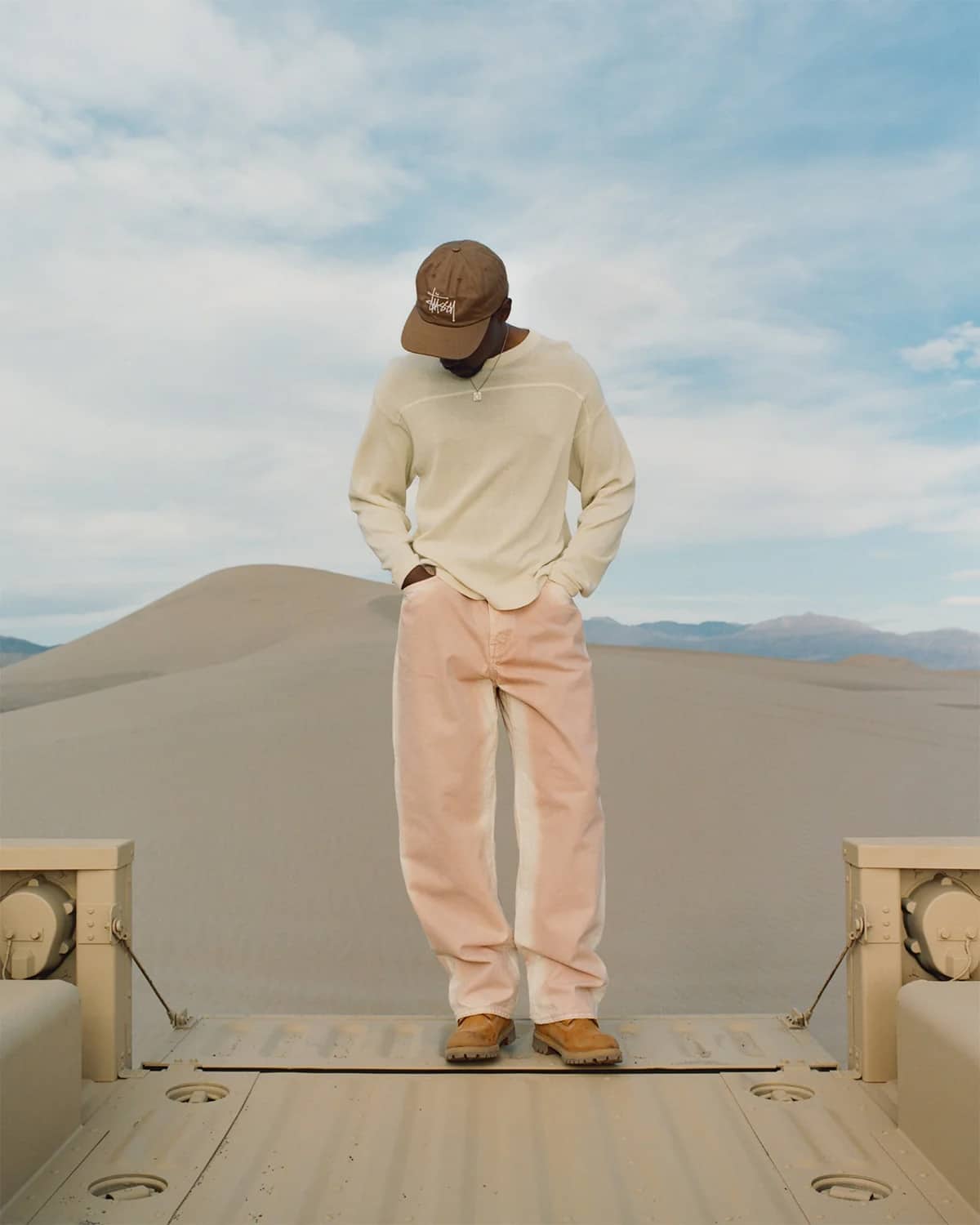 Le immagini della campagna dedicata alla stagione estiva rendono protagonista una cornice scenografica desertica con una passerella in primo piano. È proprio la scelta del contesto fotografico che fornisce il perfetto contrasto neutro con la sorprendente tavolozza cromatica che caratterizza la proposta. Nello specifico, Stüssy ha inserito all’interno della linea capi di diversa estrazione, passando dall’utilitywear al casualwear, senza sacrificare le iconiche radici surfwear che hanno contraddistinto i primissimi anni di operato del brand.