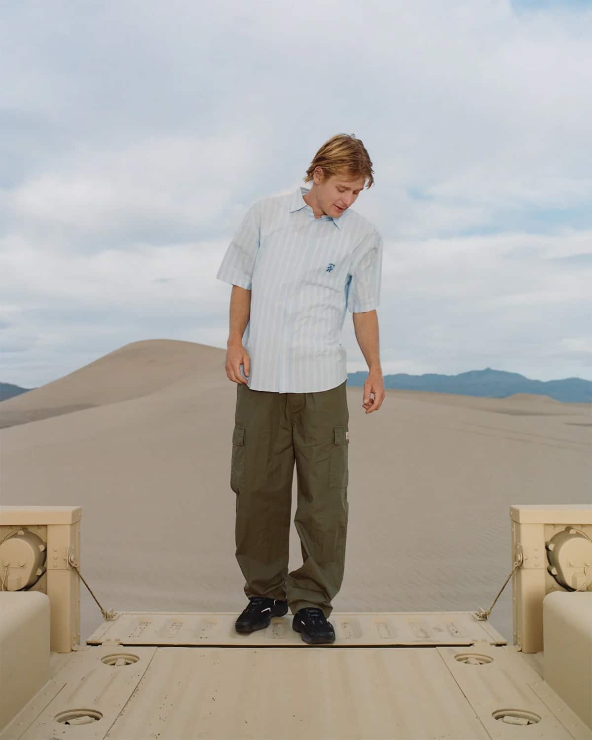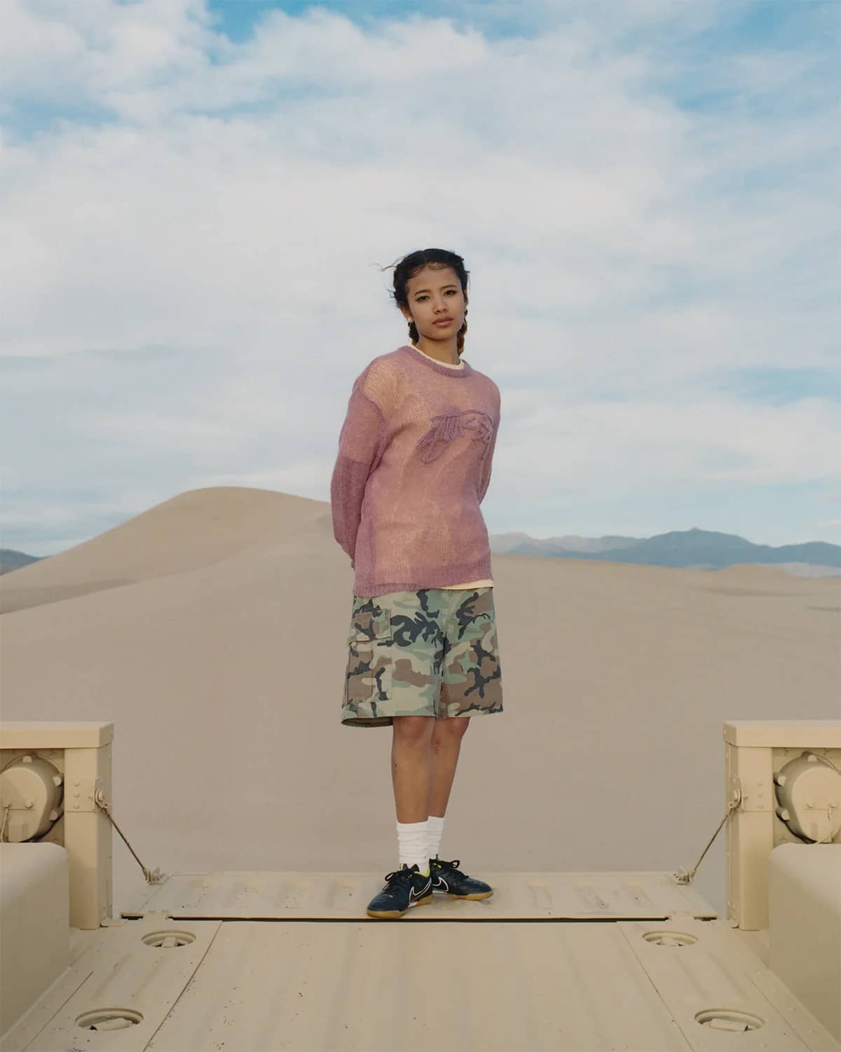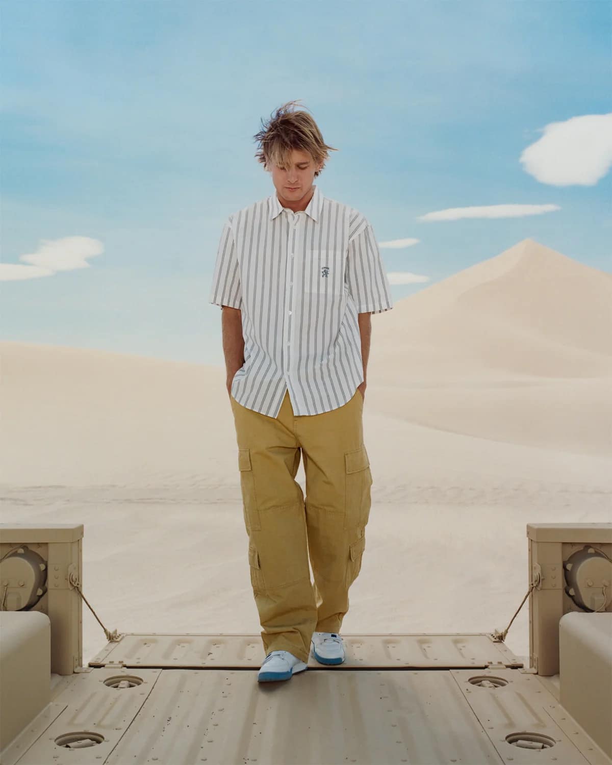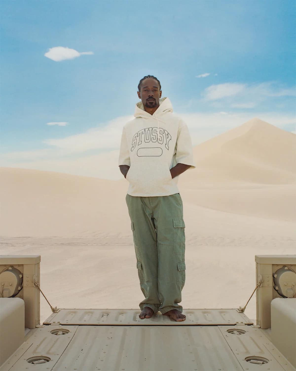 Le immagini della campagna dedicata alla stagione estiva rendono protagonista una cornice scenografica desertica con una passerella in primo piano. È proprio la scelta del contesto fotografico che fornisce il perfetto contrasto neutro con la sorprendente tavolozza cromatica che caratterizza la proposta. Nello specifico, Stüssy ha inserito all’interno della linea capi di diversa estrazione, passando dall’utilitywear al casualwear, senza sacrificare le iconiche radici surfwear che hanno contraddistinto i primissimi anni di operato del brand.