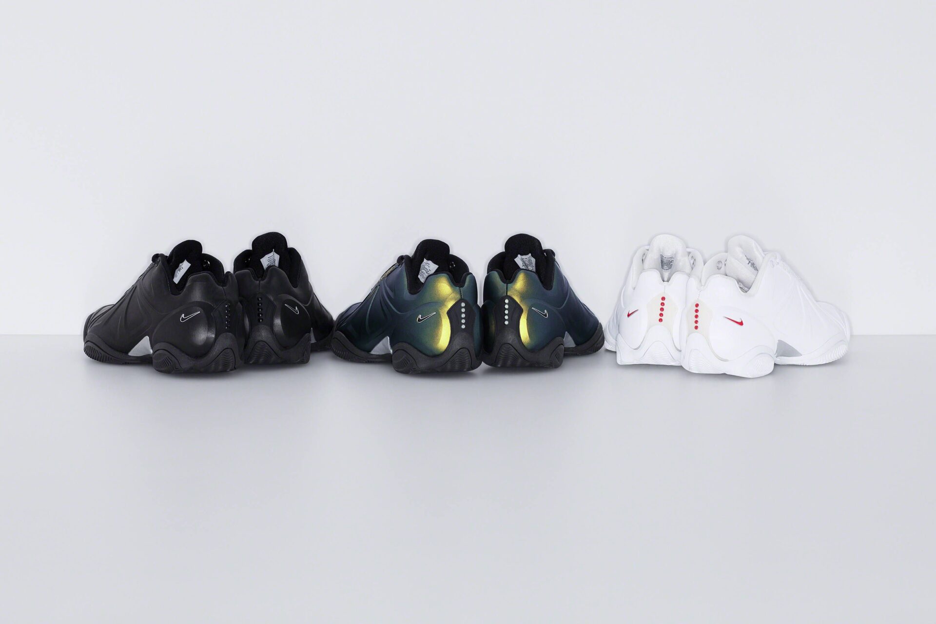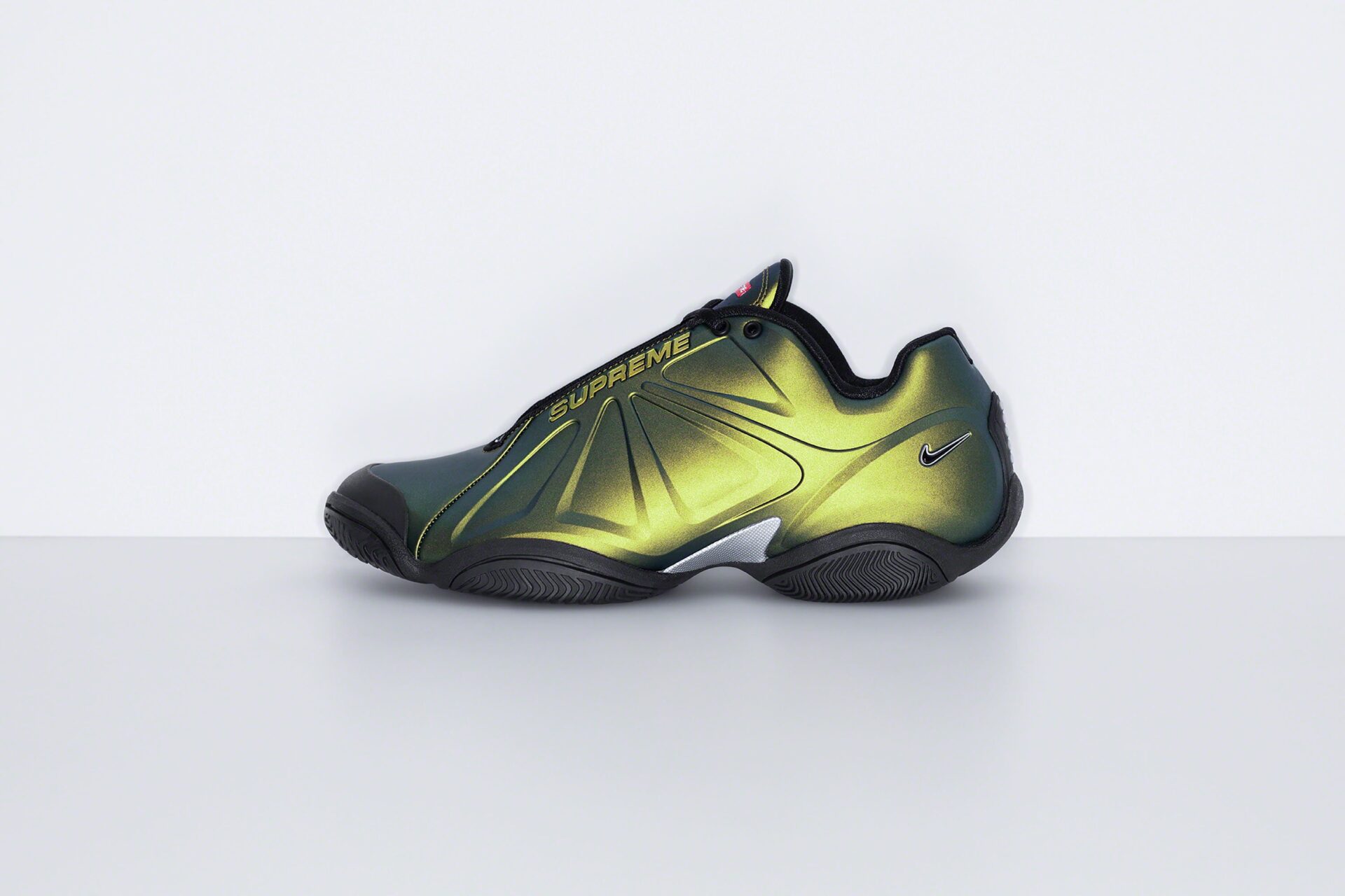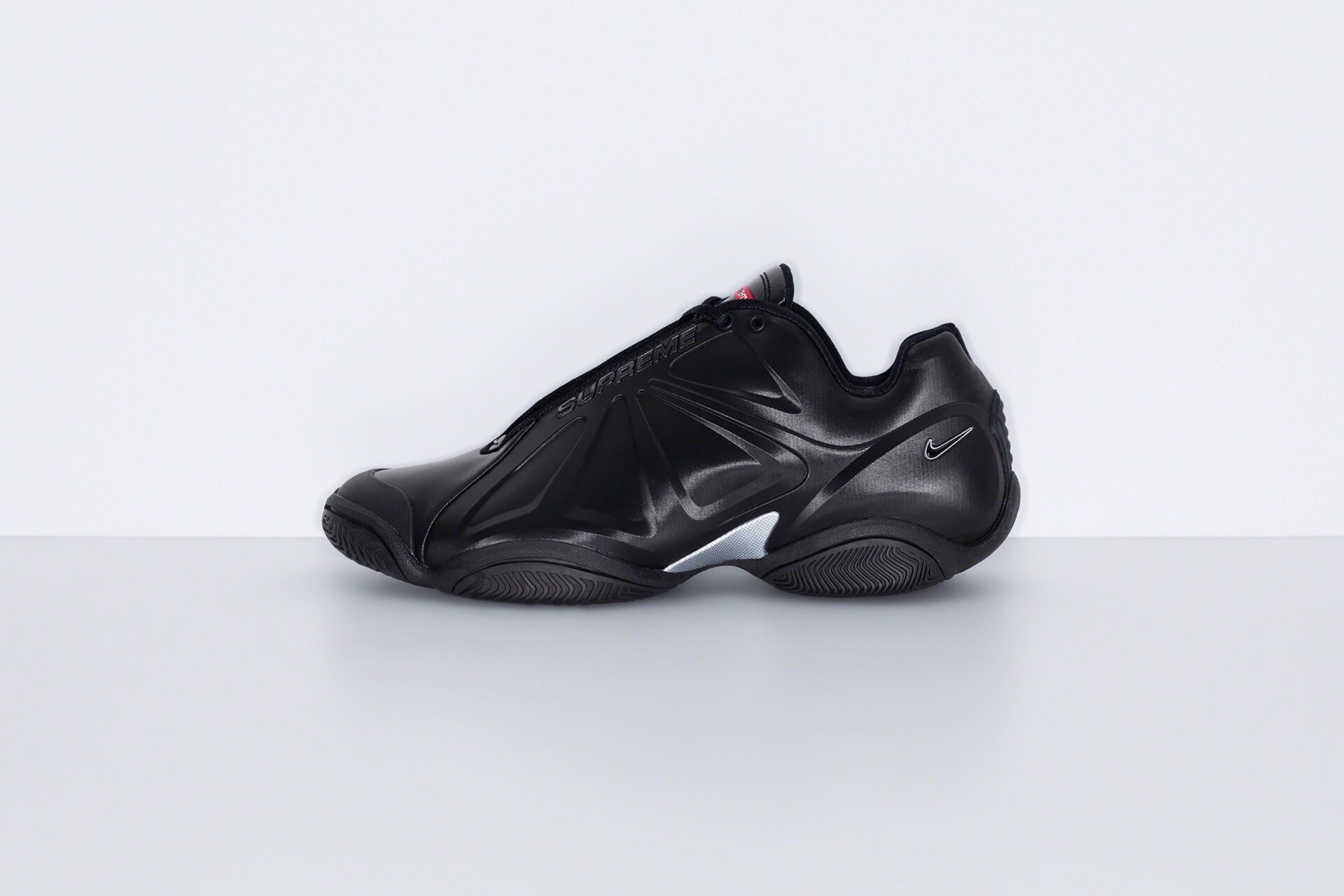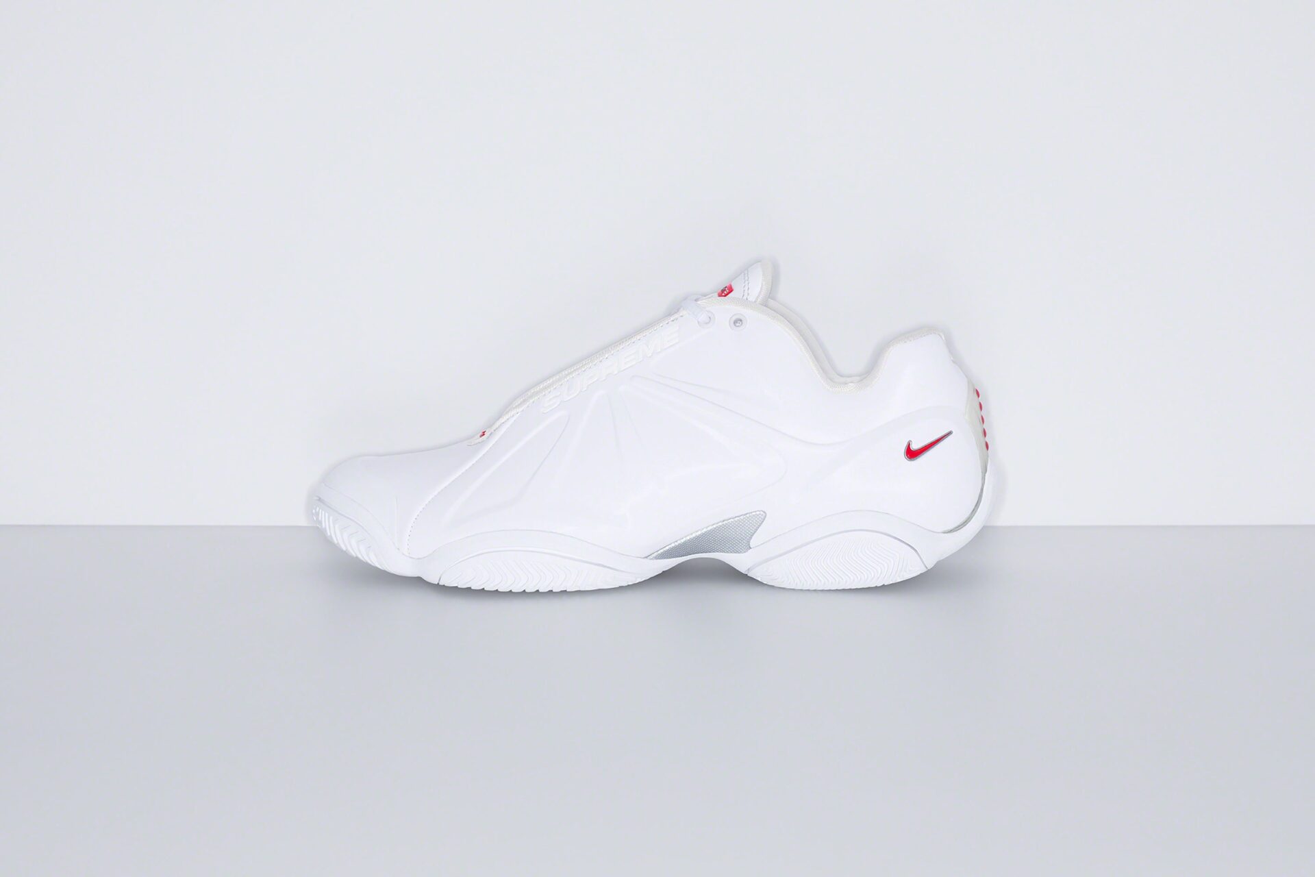 Dal punto di vista strutturale la sneaker presenta una tomaia sintetica con lacci a scomparsa, allineandosi al look di alcune delle più celebri calzature sportive dell’epoca Y2K che, ultimamente, va sempre di più di moda. Il branding Supreme completa il design minimal caratterizzato da numerosi rinforzi, posizionandosi in corrispondenza dei lacci, della linguetta della calzatura e affiancandosi al marchio Nike che compare sul tallone.