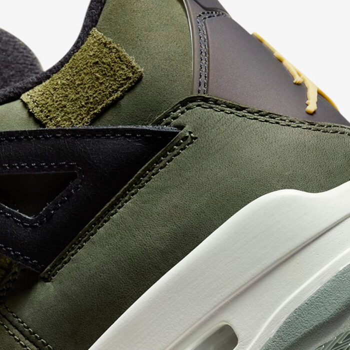 La sneaker viene caratterizzata da un mix di tonalità medium olive, vaniglia, kaki, nero e avorio