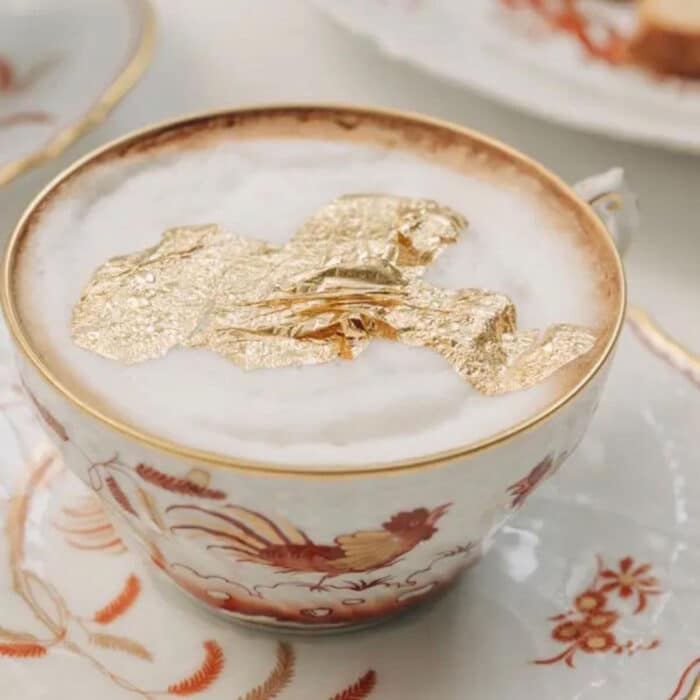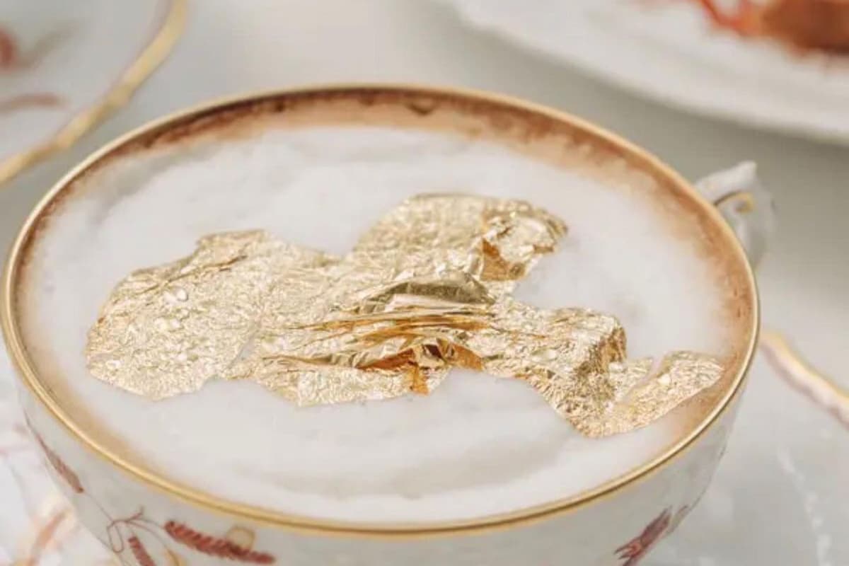 Preparata con latte di bufala, la bevanda viene servita all’interno di prestigiose tazze Ginori ed è adornata con foglia d'oro