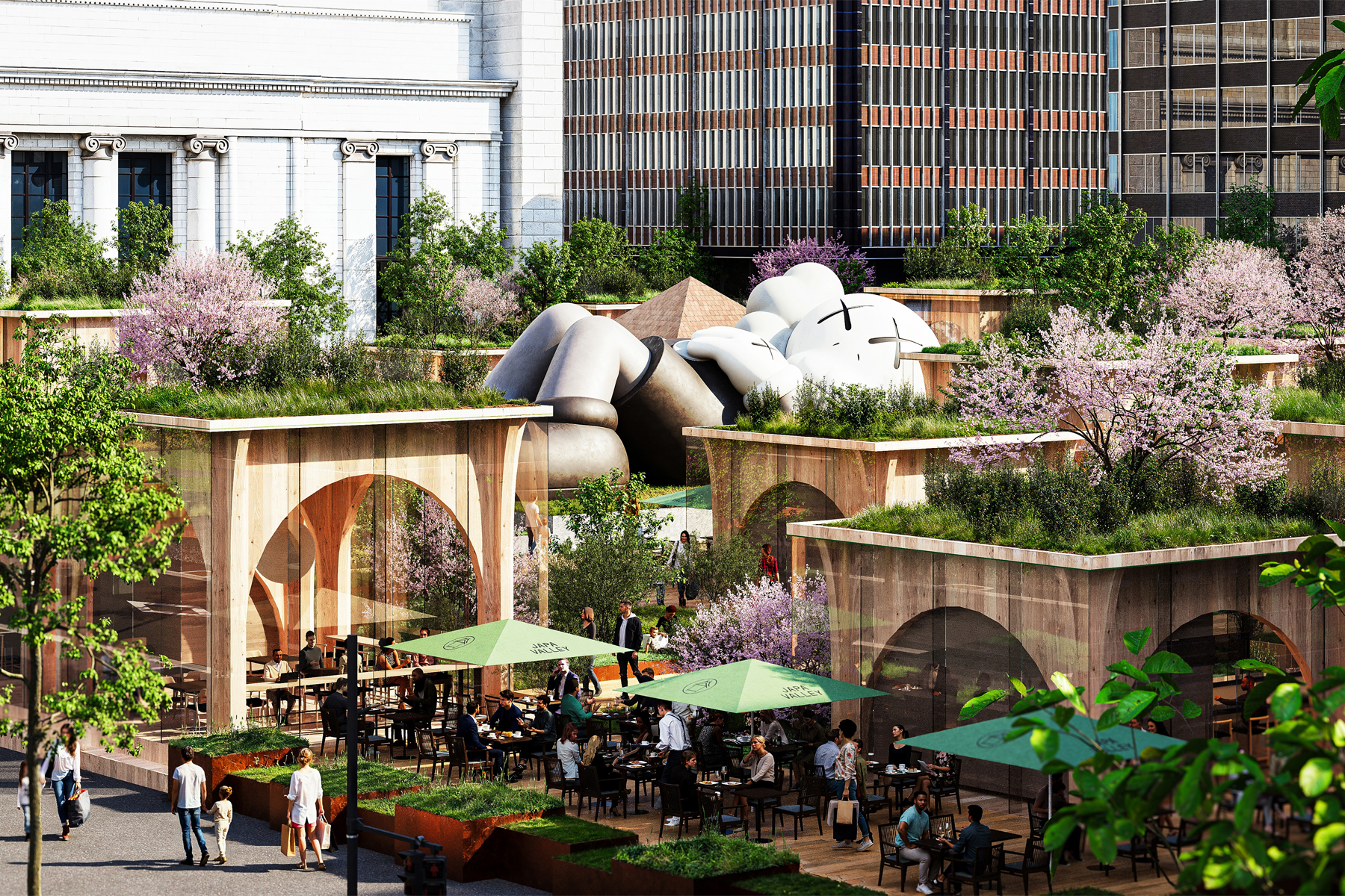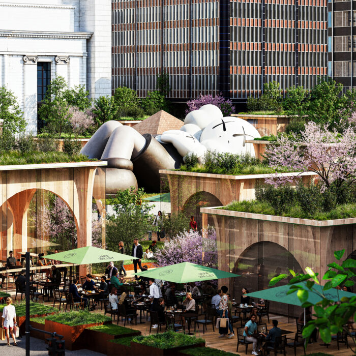Il trio creativo immagina uno spazio temporaneo tra arte monumentale, pop-up store e sake artigianale nel cuore della metropoli giapponese