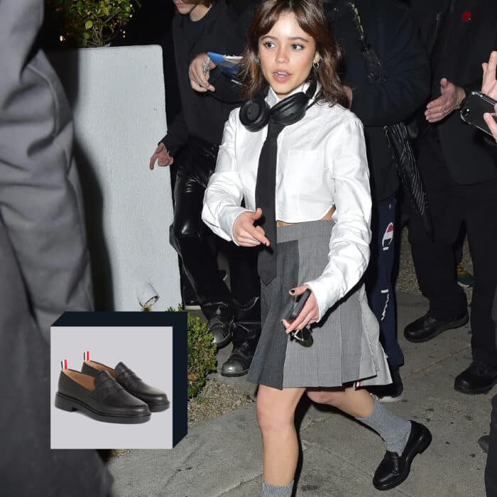 L'attrice di Mercoledì ha sfoggiato un look preppy completato da loafer firmati Thom Browne