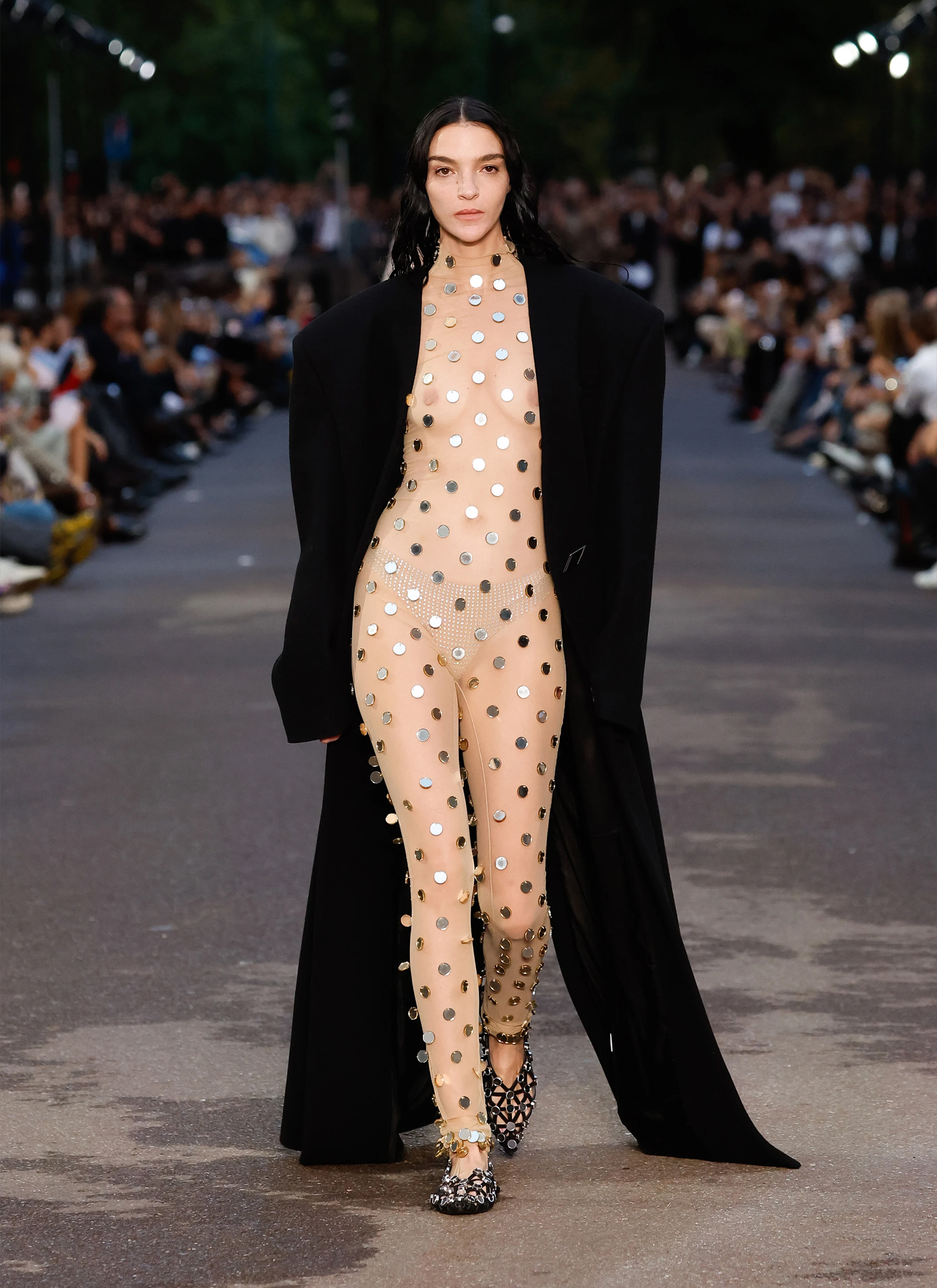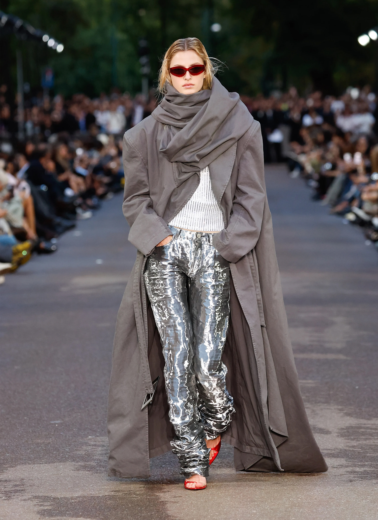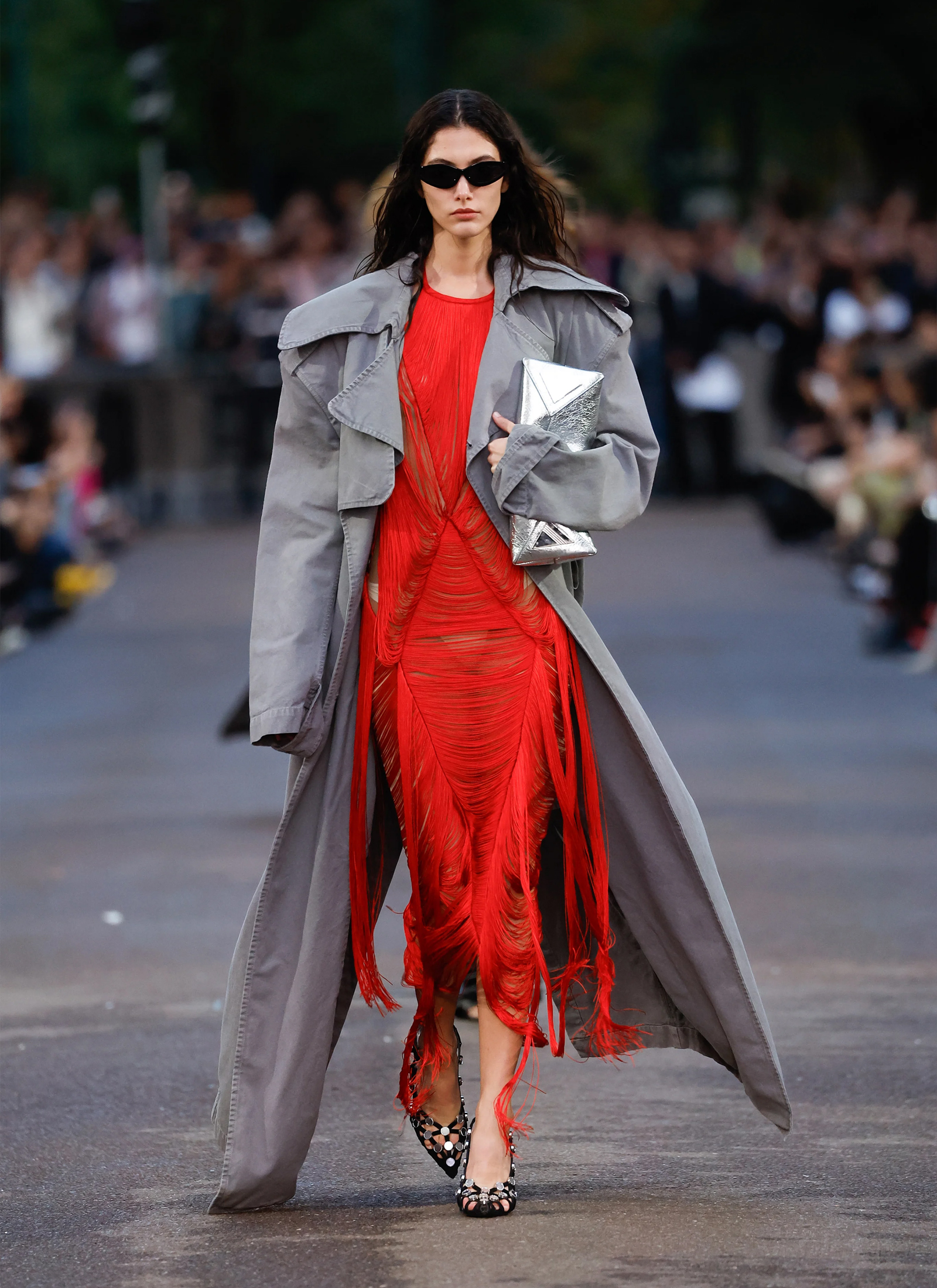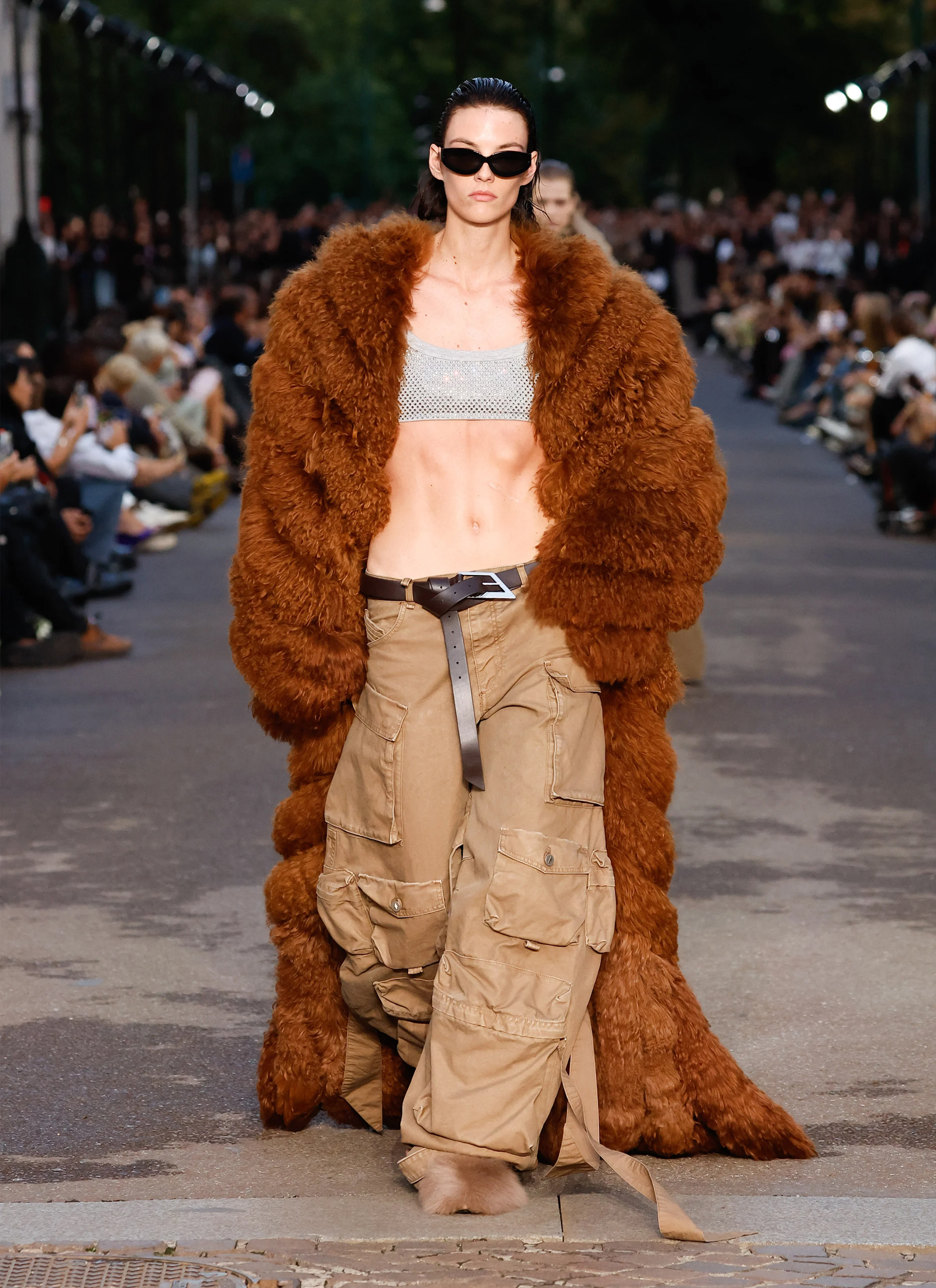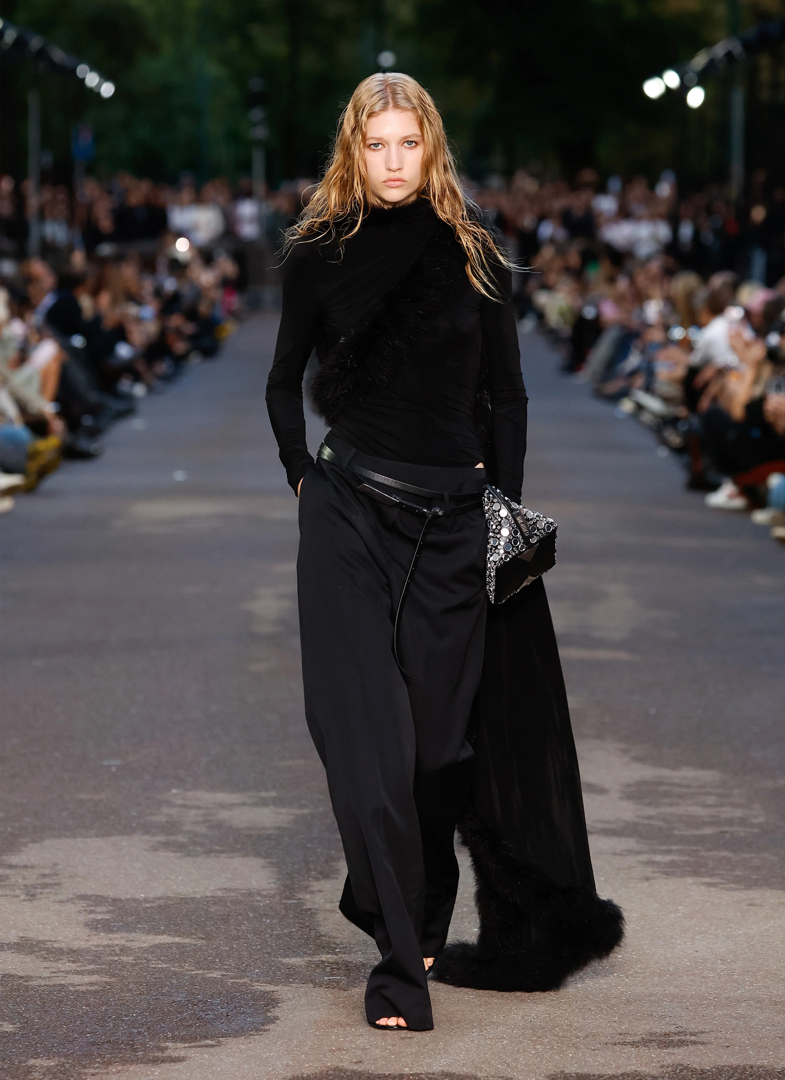 A far da padrone è il cappotto oversize, indossato sia da Elodie che da Chiara Ferragni, che sovrasta i pantaloni cargo, anch’essi molto ampi. Le proporzioni, dunque, sono importanti, e così accanto ad abiti da cocktail e nude look, hanno preso parte alla parata anche cardigan più morbidi, capispalla effetto furry, maglieria e capi arricchiti da piume e paillettes metalliche. La donna tinteggiata da The Attico è fiera e scultorea, con personalità forte e decisa, caratterizzata da un moderno ideale di power dressing che viene ripreso in più occasioni, e non risulta mai fuori luogo.