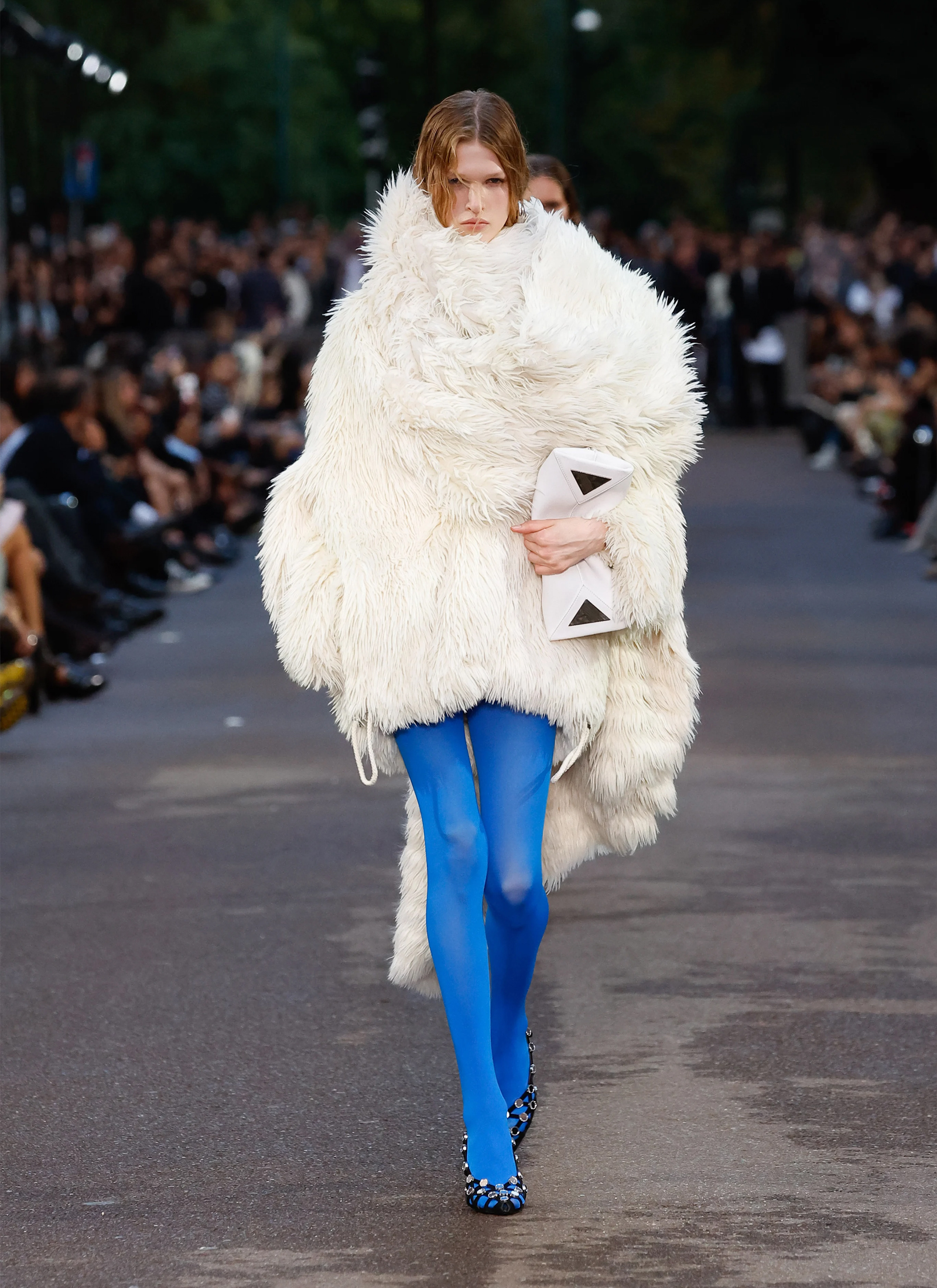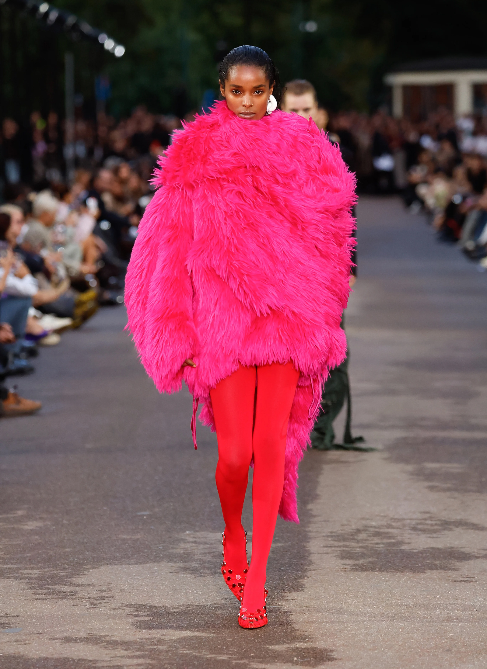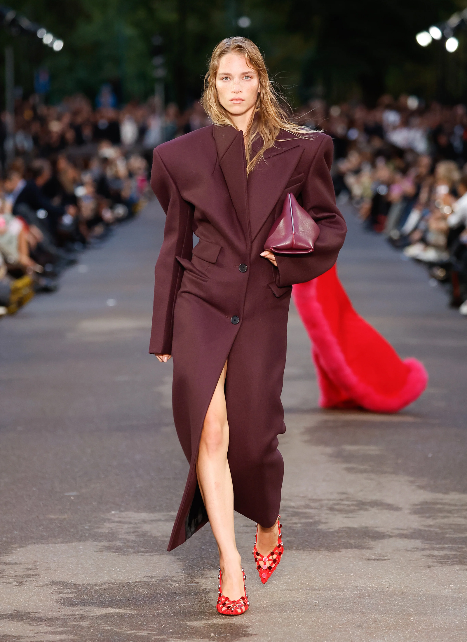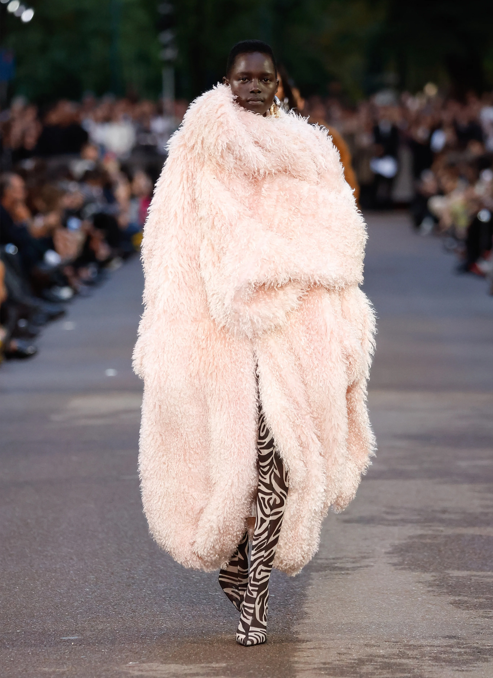 A far da padrone è il cappotto oversize, indossato sia da Elodie che da Chiara Ferragni, che sovrasta i pantaloni cargo, anch’essi molto ampi. Le proporzioni, dunque, sono importanti, e così accanto ad abiti da cocktail e nude look, hanno preso parte alla parata anche cardigan più morbidi, capispalla effetto furry, maglieria e capi arricchiti da piume e paillettes metalliche. La donna tinteggiata da The Attico è fiera e scultorea, con personalità forte e decisa, caratterizzata da un moderno ideale di power dressing che viene ripreso in più occasioni, e non risulta mai fuori luogo.