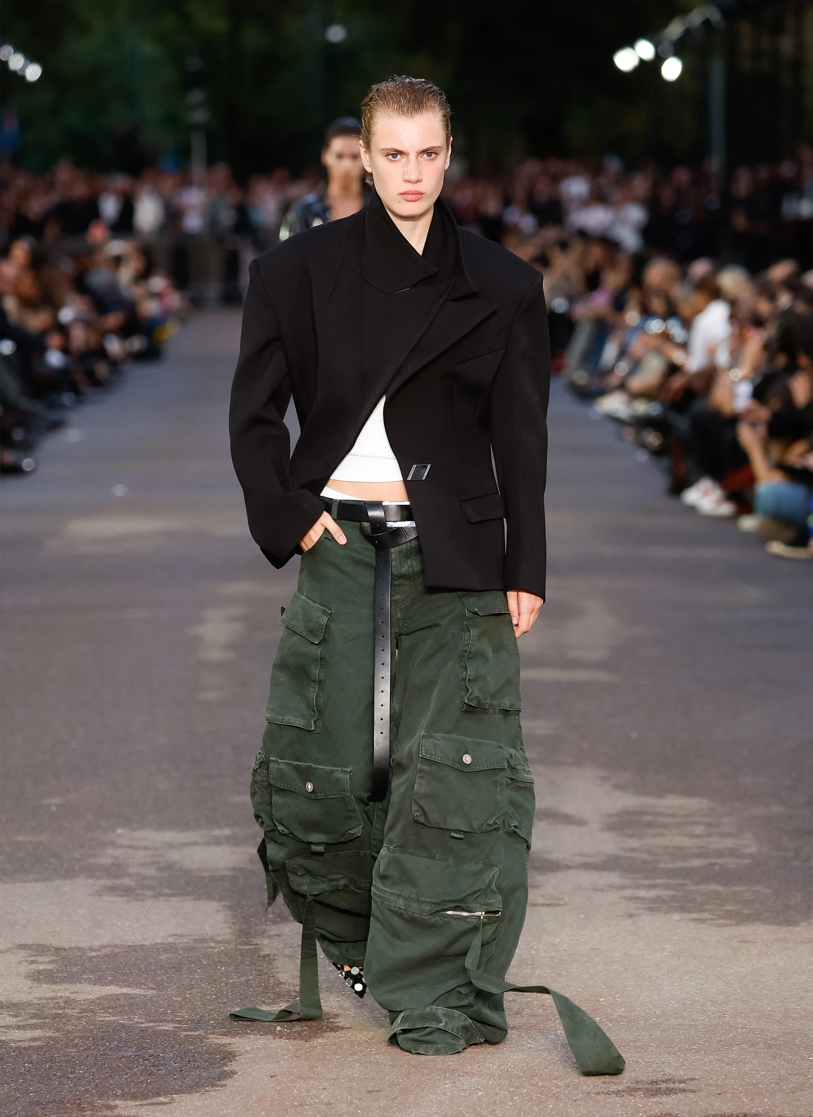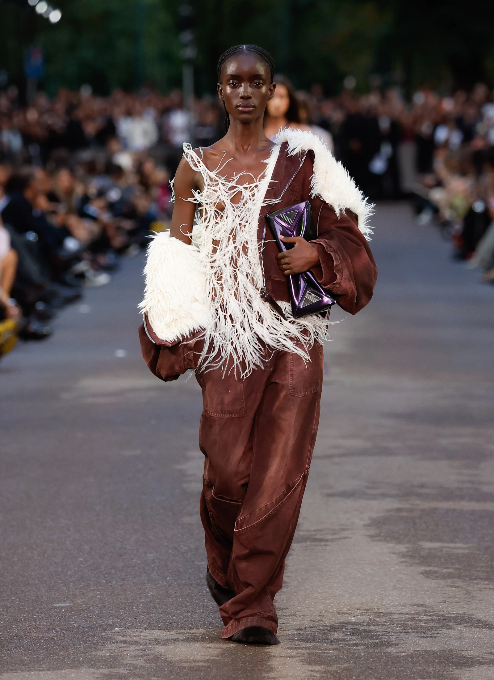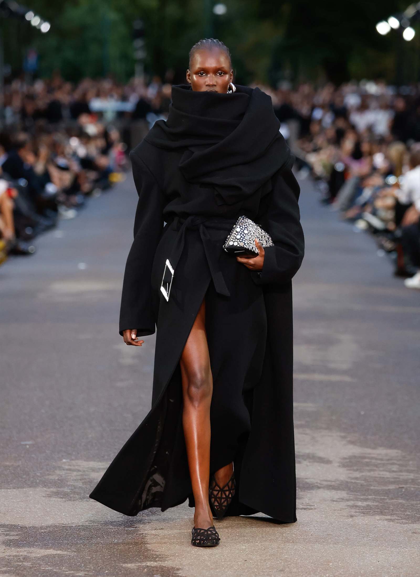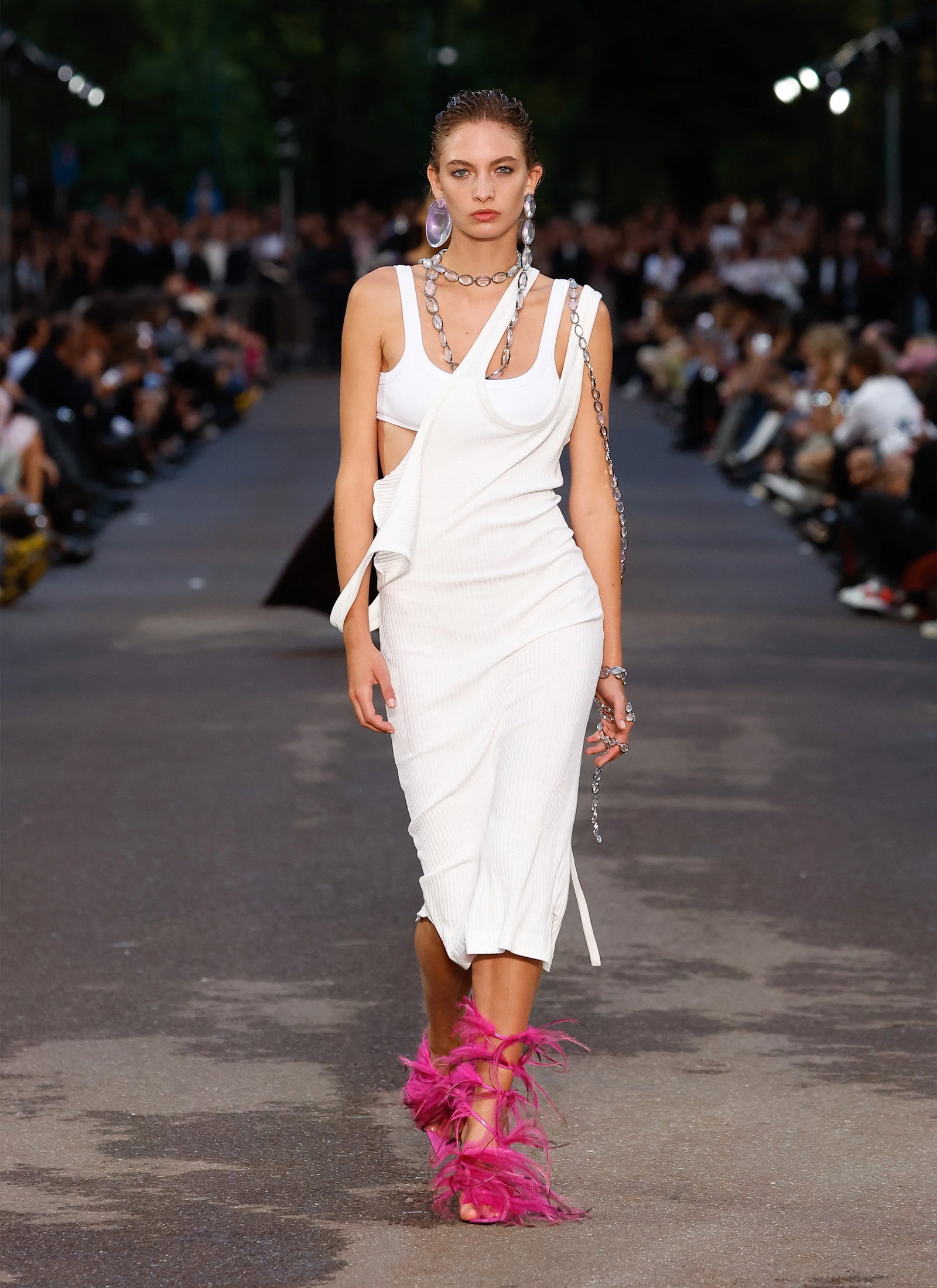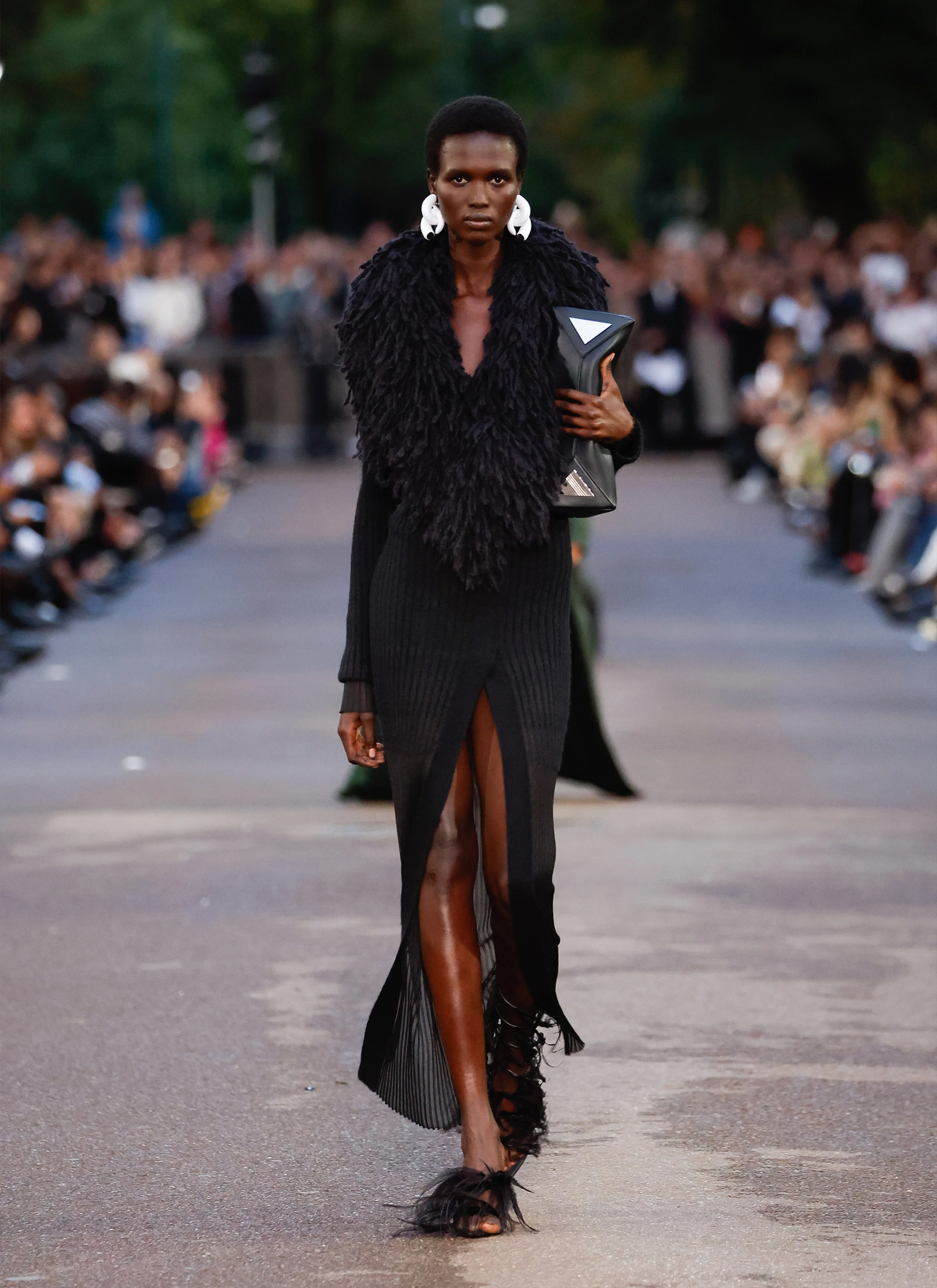 A far da padrone è il cappotto oversize, indossato sia da Elodie che da Chiara Ferragni, che sovrasta i pantaloni cargo, anch’essi molto ampi. Le proporzioni, dunque, sono importanti, e così accanto ad abiti da cocktail e nude look, hanno preso parte alla parata anche cardigan più morbidi, capispalla effetto furry, maglieria e capi arricchiti da piume e paillettes metalliche. La donna tinteggiata da The Attico è fiera e scultorea, con personalità forte e decisa, caratterizzata da un moderno ideale di power dressing che viene ripreso in più occasioni, e non risulta mai fuori luogo.