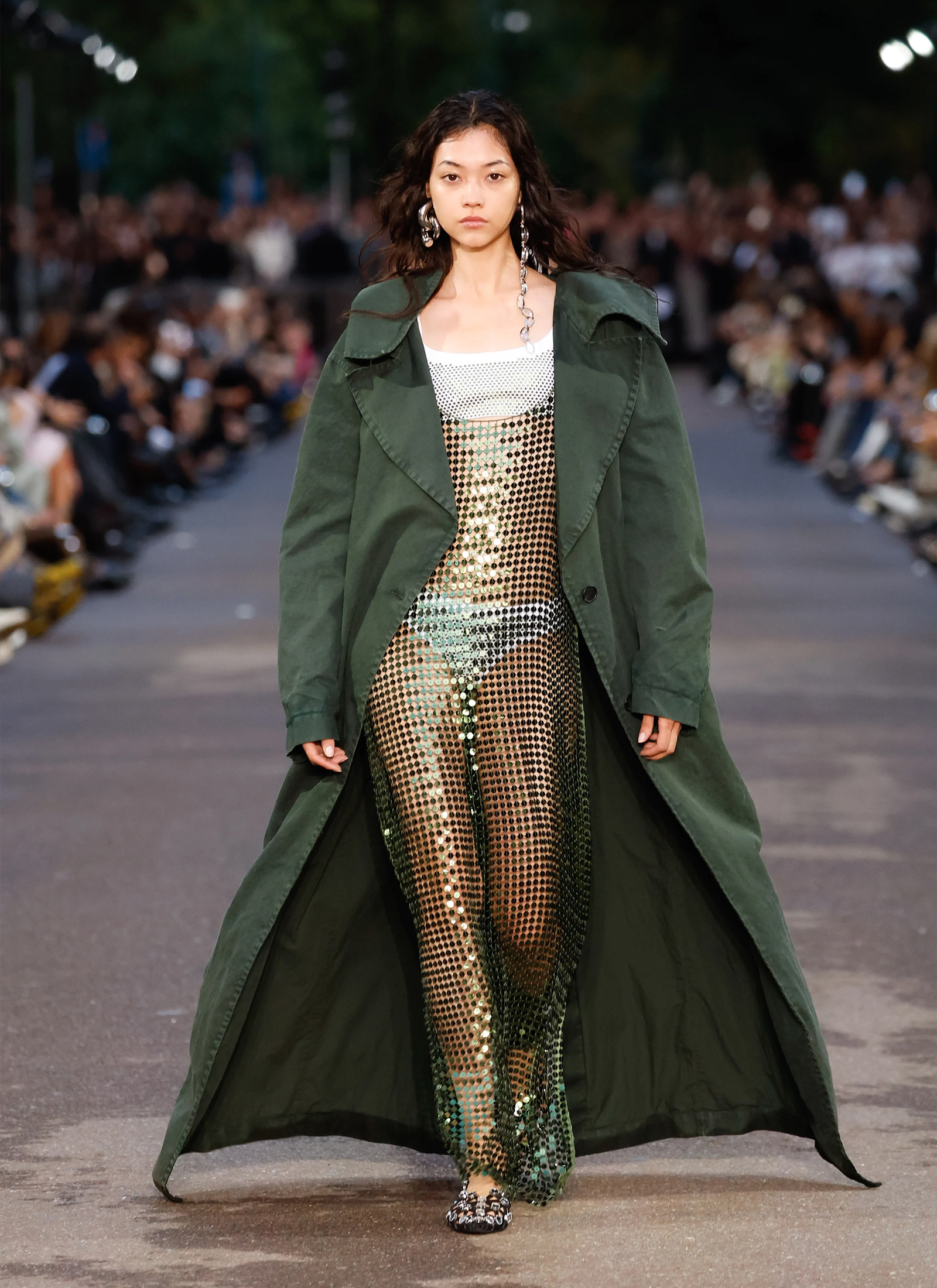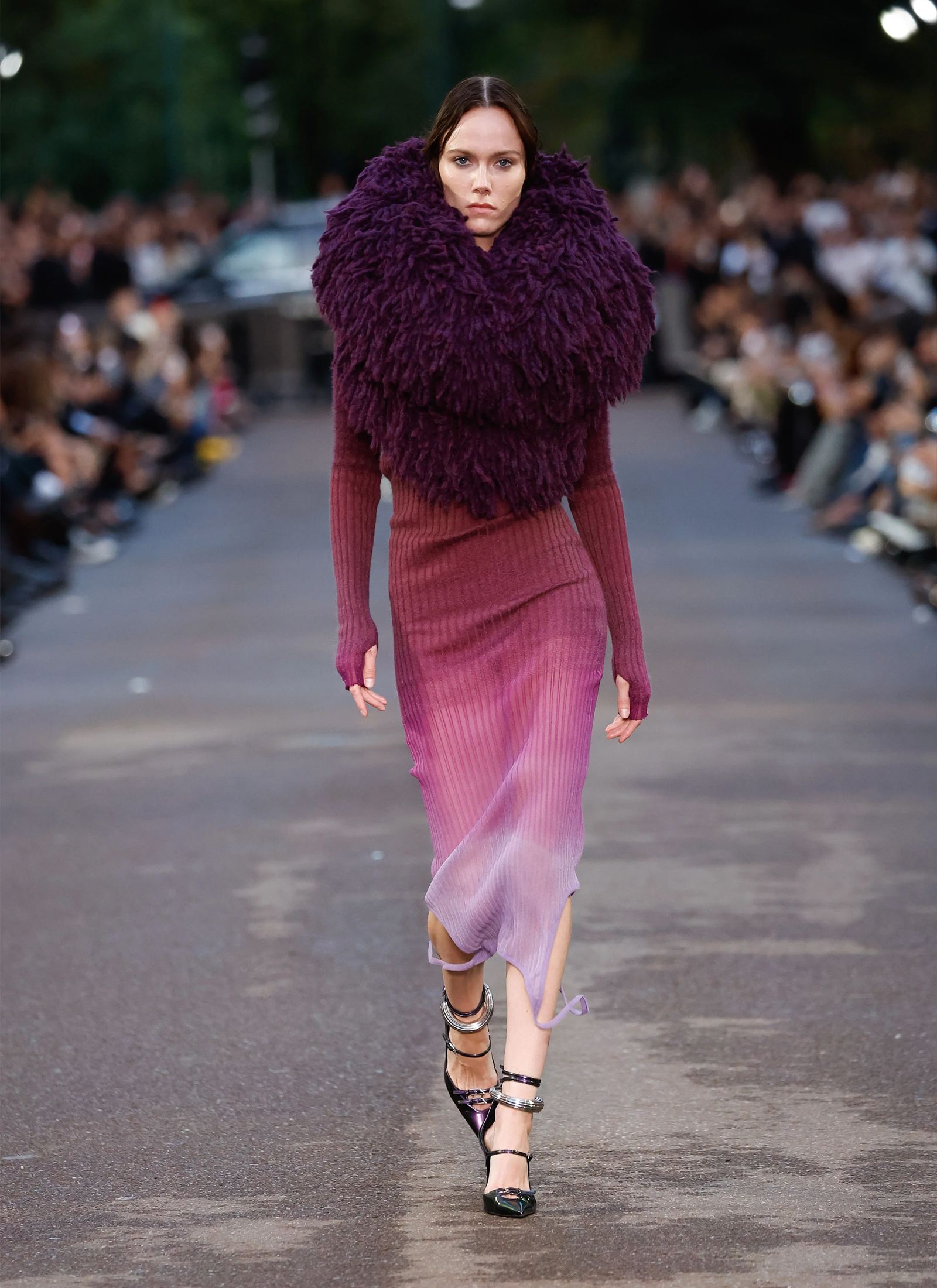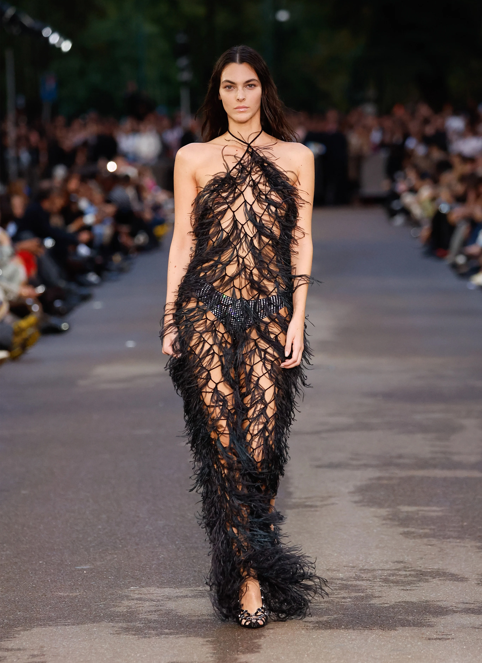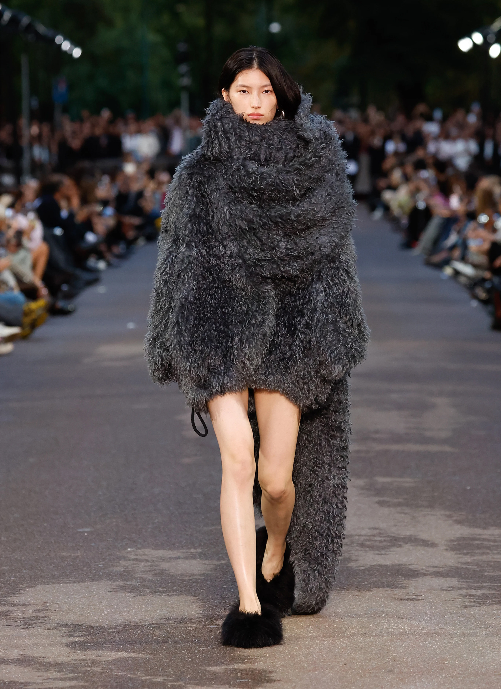 A far da padrone è il cappotto oversize, indossato sia da Elodie che da Chiara Ferragni, che sovrasta i pantaloni cargo, anch’essi molto ampi. Le proporzioni, dunque, sono importanti, e così accanto ad abiti da cocktail e nude look, hanno preso parte alla parata anche cardigan più morbidi, capispalla effetto furry, maglieria e capi arricchiti da piume e paillettes metalliche. La donna tinteggiata da The Attico è fiera e scultorea, con personalità forte e decisa, caratterizzata da un moderno ideale di power dressing che viene ripreso in più occasioni, e non risulta mai fuori luogo.