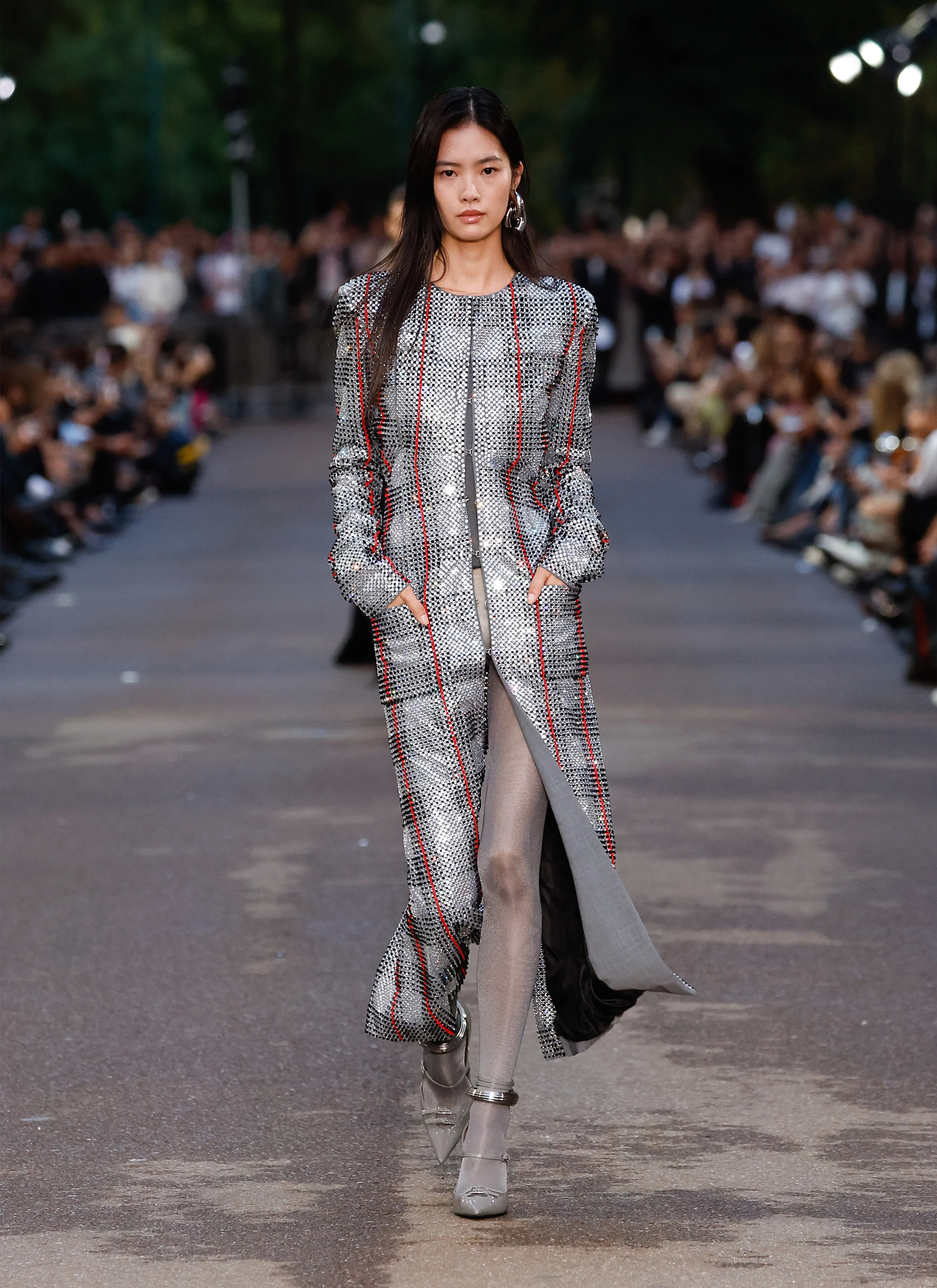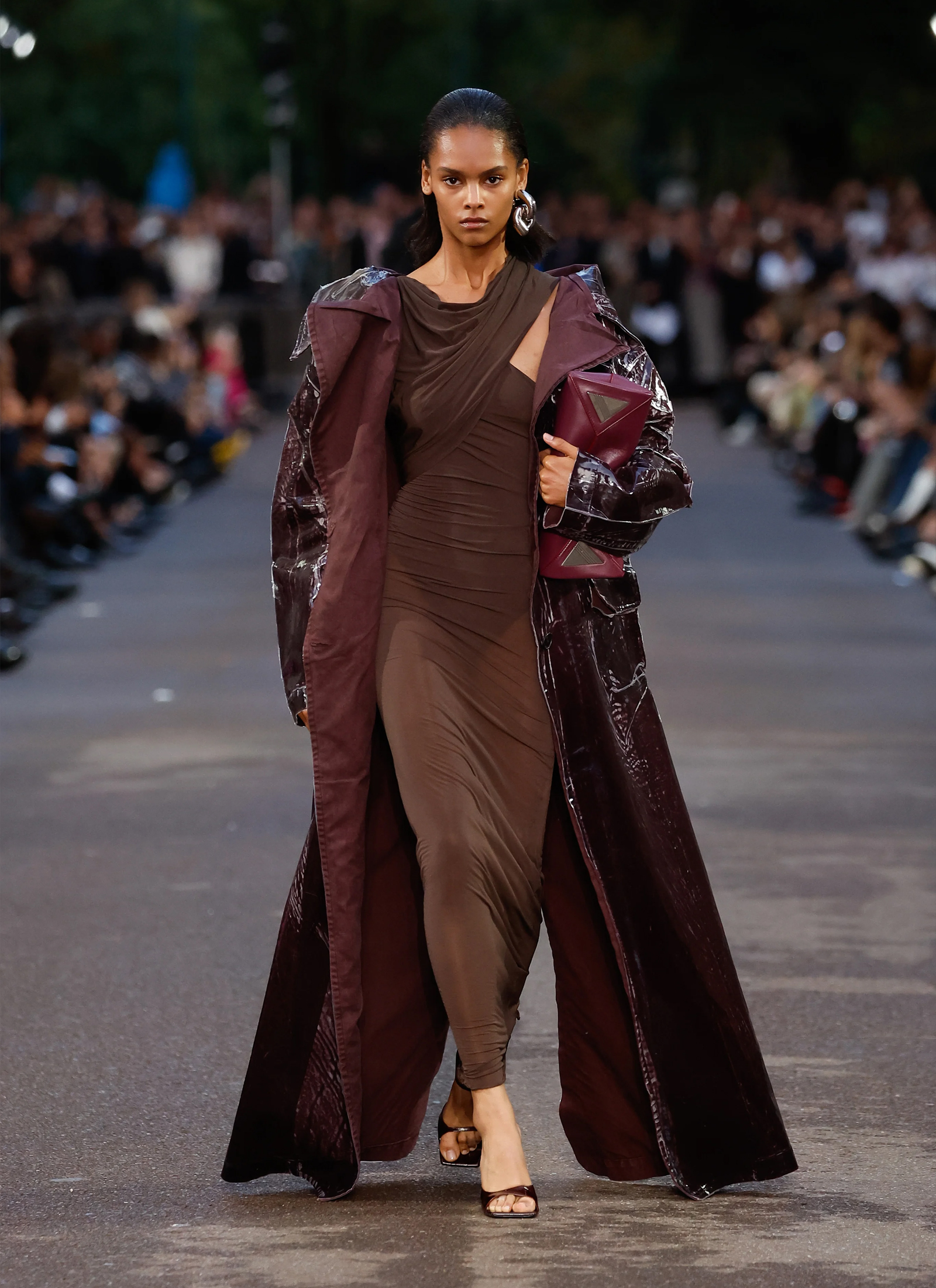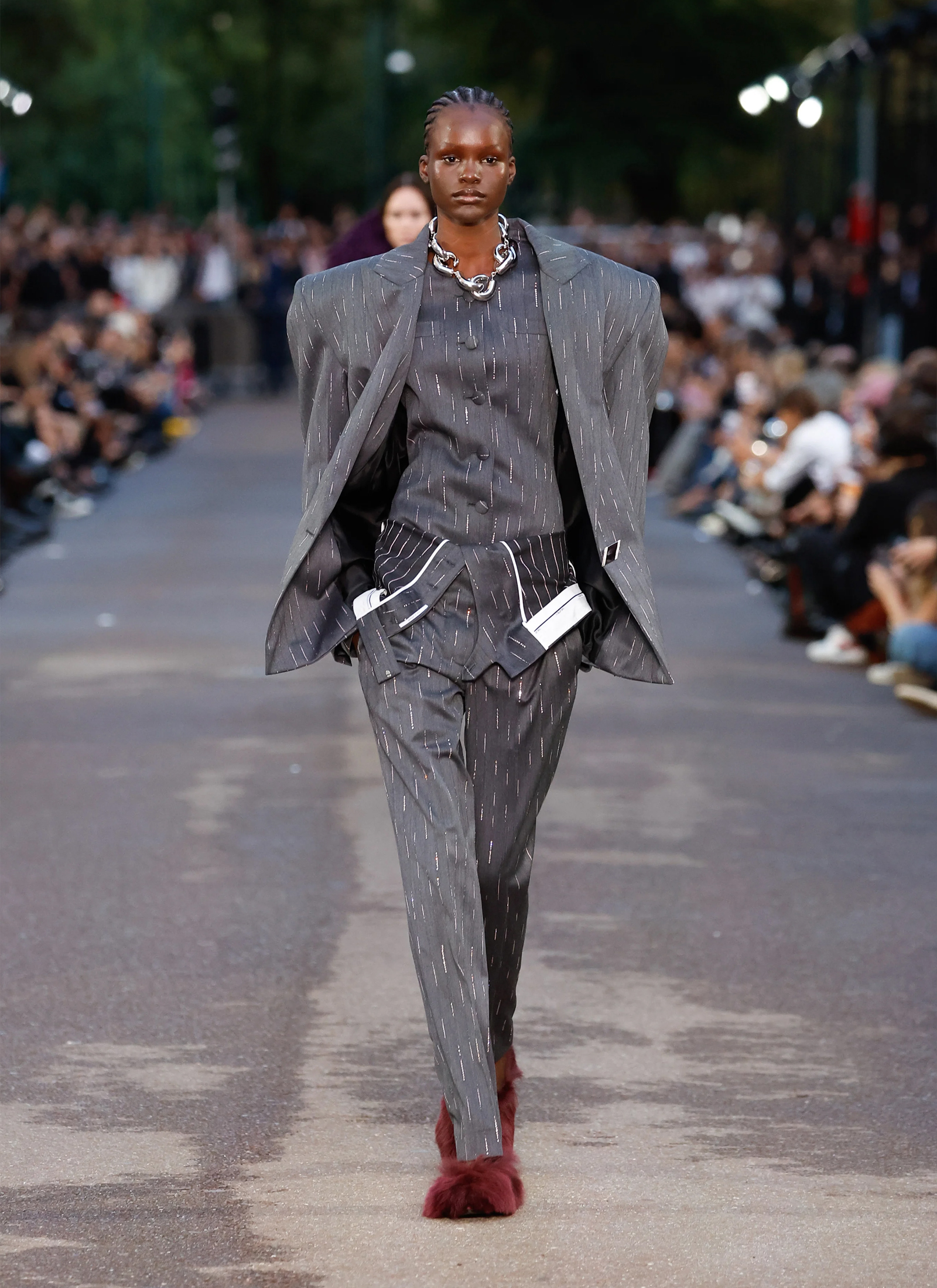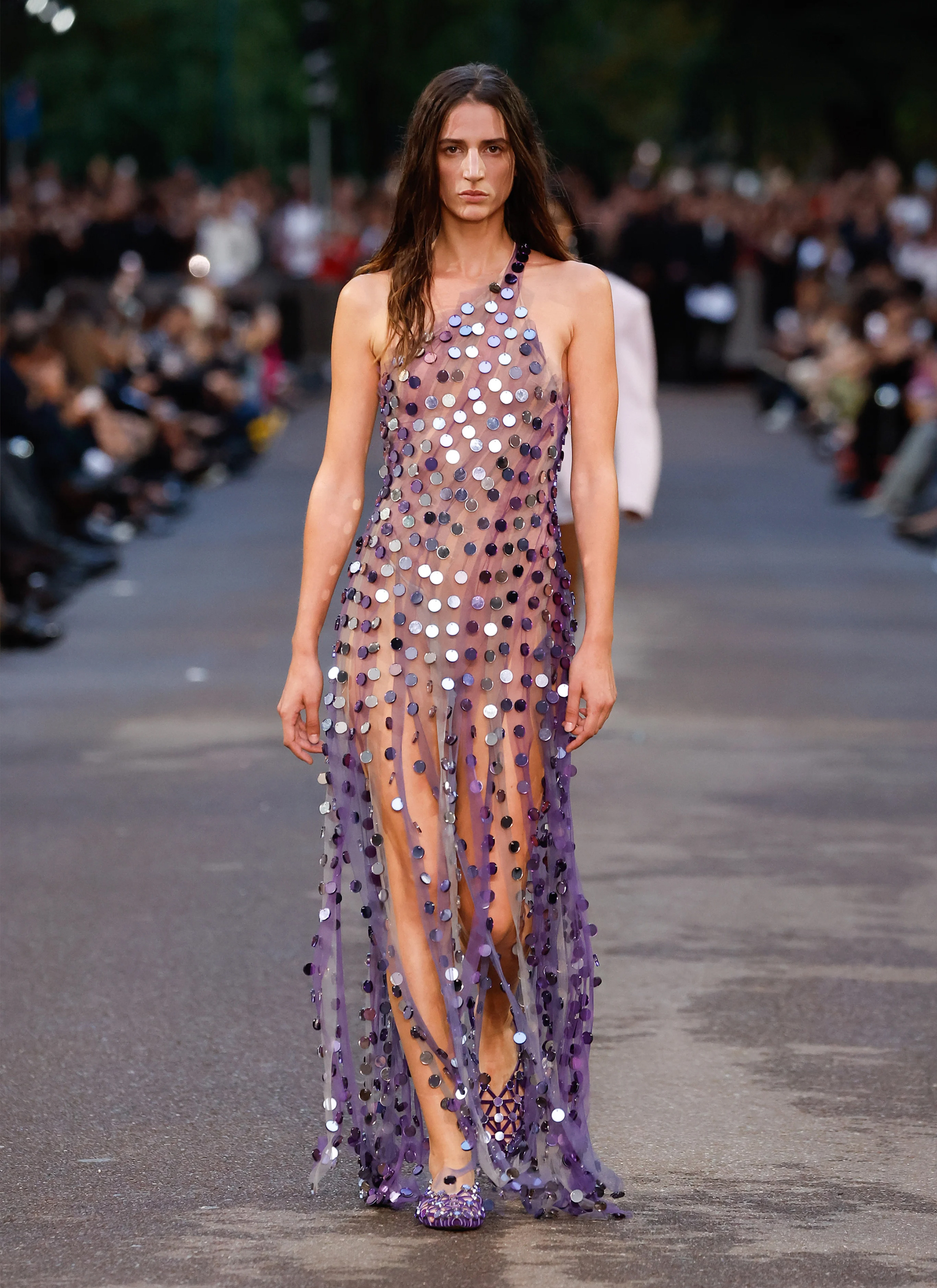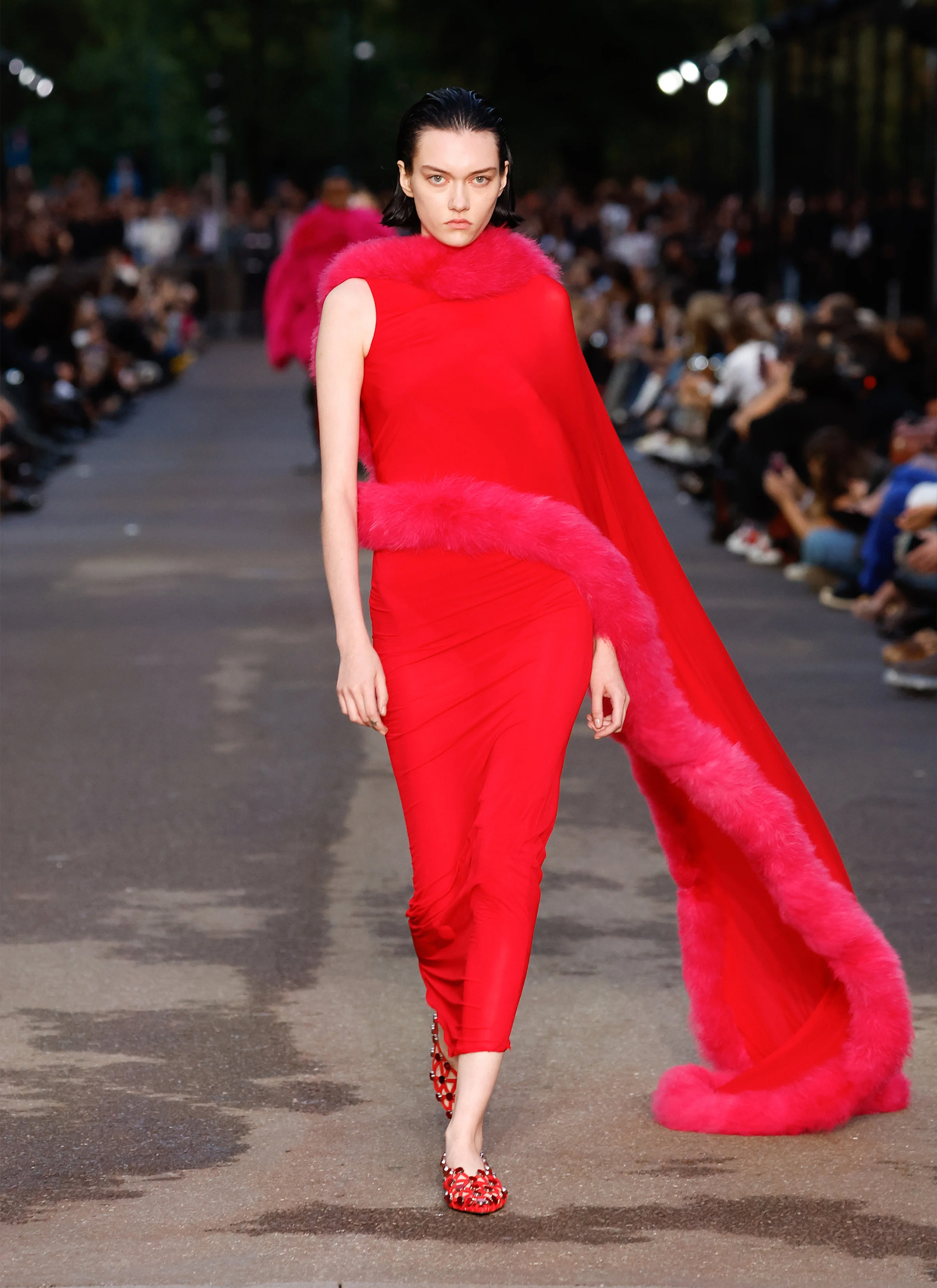 A far da padrone è il cappotto oversize, indossato sia da Elodie che da Chiara Ferragni, che sovrasta i pantaloni cargo, anch’essi molto ampi. Le proporzioni, dunque, sono importanti, e così accanto ad abiti da cocktail e nude look, hanno preso parte alla parata anche cardigan più morbidi, capispalla effetto furry, maglieria e capi arricchiti da piume e paillettes metalliche. La donna tinteggiata da The Attico è fiera e scultorea, con personalità forte e decisa, caratterizzata da un moderno ideale di power dressing che viene ripreso in più occasioni, e non risulta mai fuori luogo.