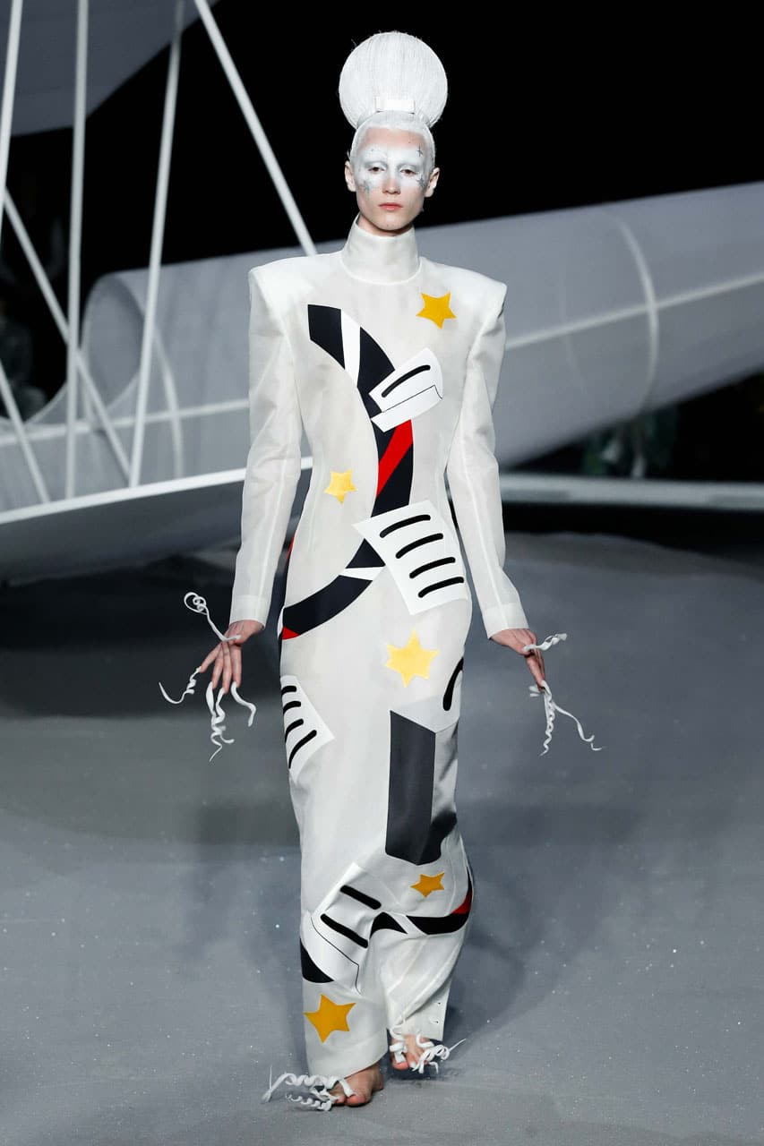 “Ci troviamo nel deserto”, afferma la voce narrante, “Un aereo è precipitato”: al concludersi di queste due brevi frasi introduttive, una modella vestita con un completo a forma di tuta spaziale con maniche a sbuffo è comparsa al centro della scenografia, pronta ad incontrare un’altra interprete dai capelli biondi vestita con uno dei blazer tipici del designer (a ricordare le sembianze del Piccolo Principe).