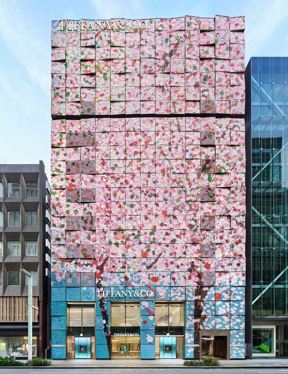 Il negozio rinnovato, situato nel quartiere nipponico di Ginza, presenta un enorme disegno floreale che inizia con uno sfondo blu a livello della strada, prima di “sbocciare” e crescere verso l’alto espandendosi verso un’esibizione abbagliante di petali rosa, bianchi, verdi e rossi.