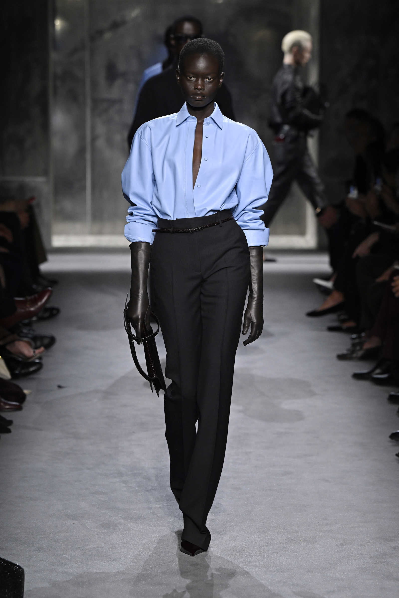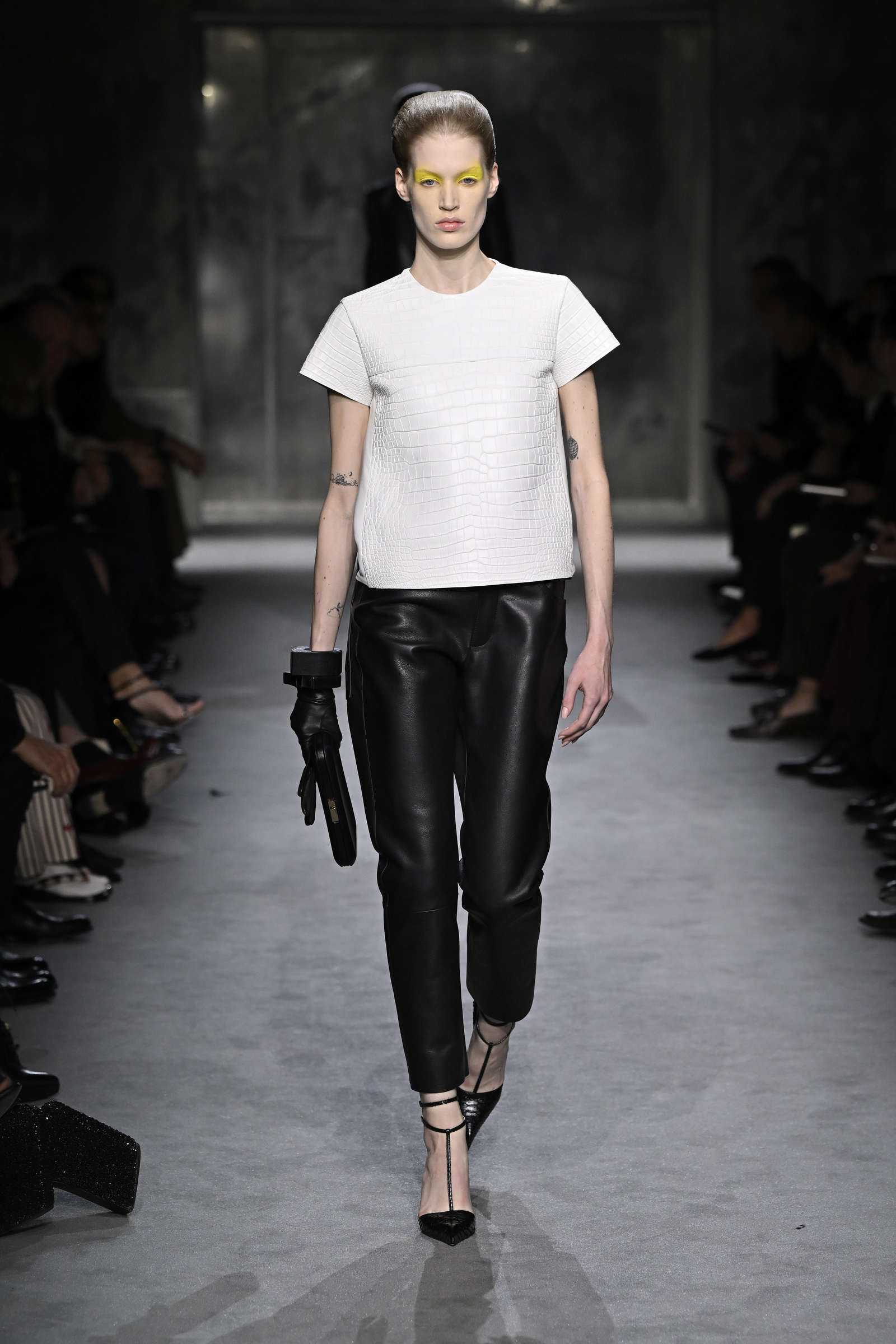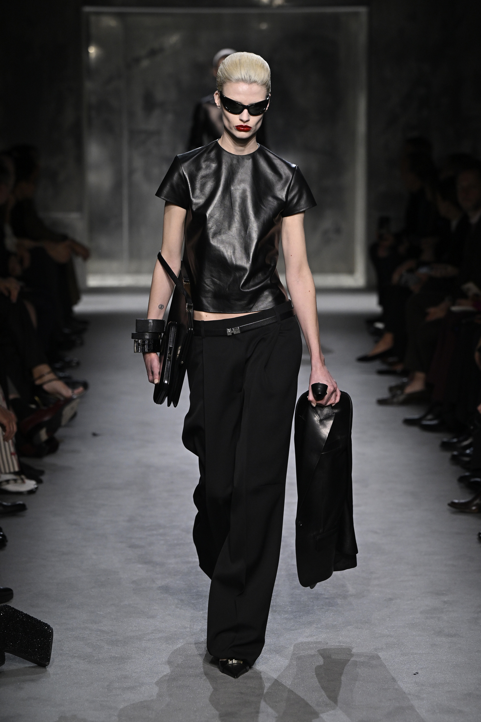 E mentre sorgono le luci dell’alba, la sensualità permane e scorre sui capi in pelle nera o bianca, materiale prediletto per i completi dai tagli spigolosi e dalla vita bassissima. Ogni orpello decorativo è assolutamente bandito: i colori pieni e la costruzione rigorosa degli abiti sono il focus della collezione Autumn/Winter 2025/26, che riscopre l’heritage del brand senza fermarsi al puro citazionismo, ma anzi lo rielabora, donandogli una nuova veste.