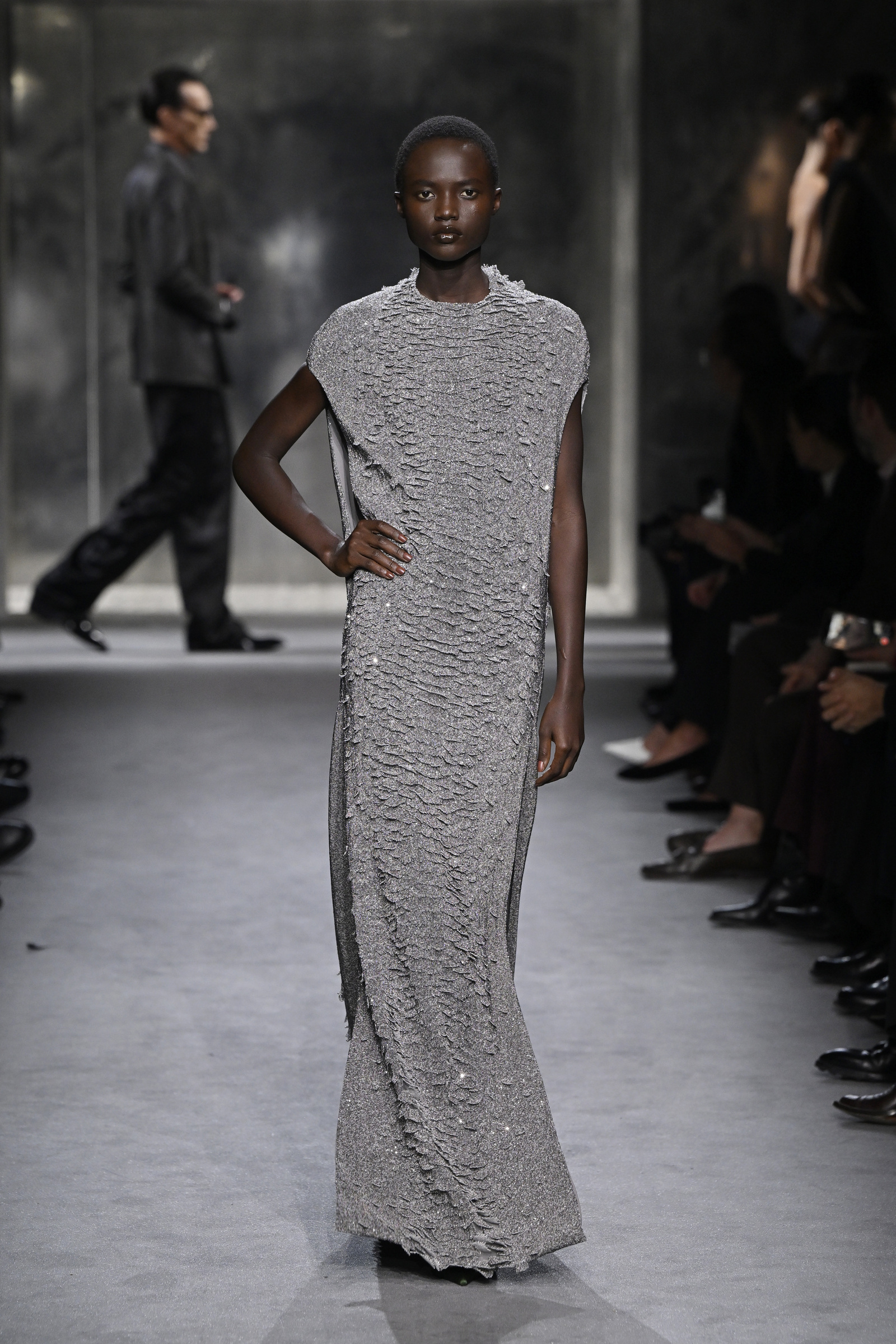 Ecco, quindi, la sensualità che permea ogni dettaglio. Oltre ai capi in pelle, discreta trasuda nelle frange dell’abito cocktail proposto in lilla, negli scolli a V e negli spacchi profondi degli abiti da sera, che sfilano in coppia adornati da una camelia bianca, unica decorazione concessa. E, infine, nella polvere sparkling che illumina dress, giacche e suit, signature del marchio, che in questa occasione, oltre al nero e al grigio, si apre a una palette di colori pastello e vitaminici, culminando con l’abito giallo.
