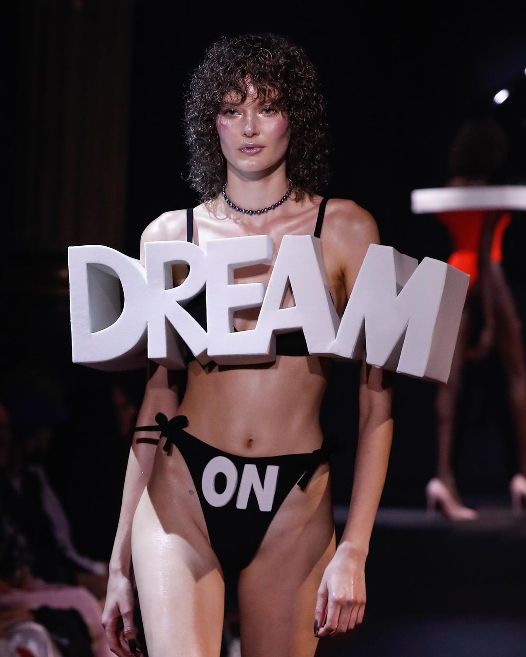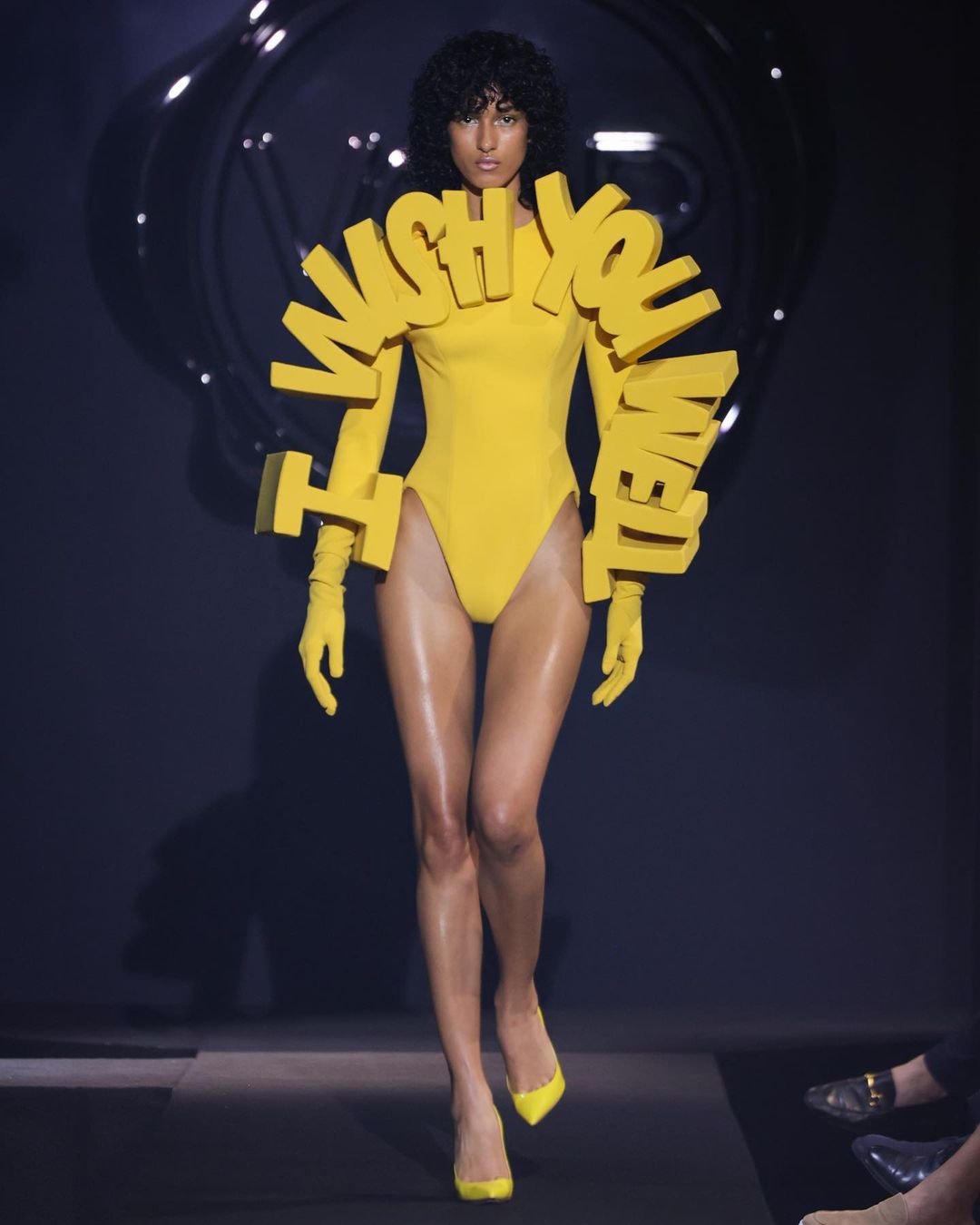 Oltre a ciò, tra gli altri pezzi degni di nota menzioniamo il body giallo con maniche in stampatello riportanti la scritta “I Wish You Well”, oltre ad un top bikini in stampatello decorato con la scritta “Dream” abbinato ad una parte inferiore del completo intimo riportante la parola “on”. La particolarità di questi capi, così come per il capospalla indossato da Shakira prima della passerella, è la presenza di lettere cubitali tridimensionali, a creare un vivace e strabiliante effetto ottico, nonché a trasmettere meglio il messaggio.