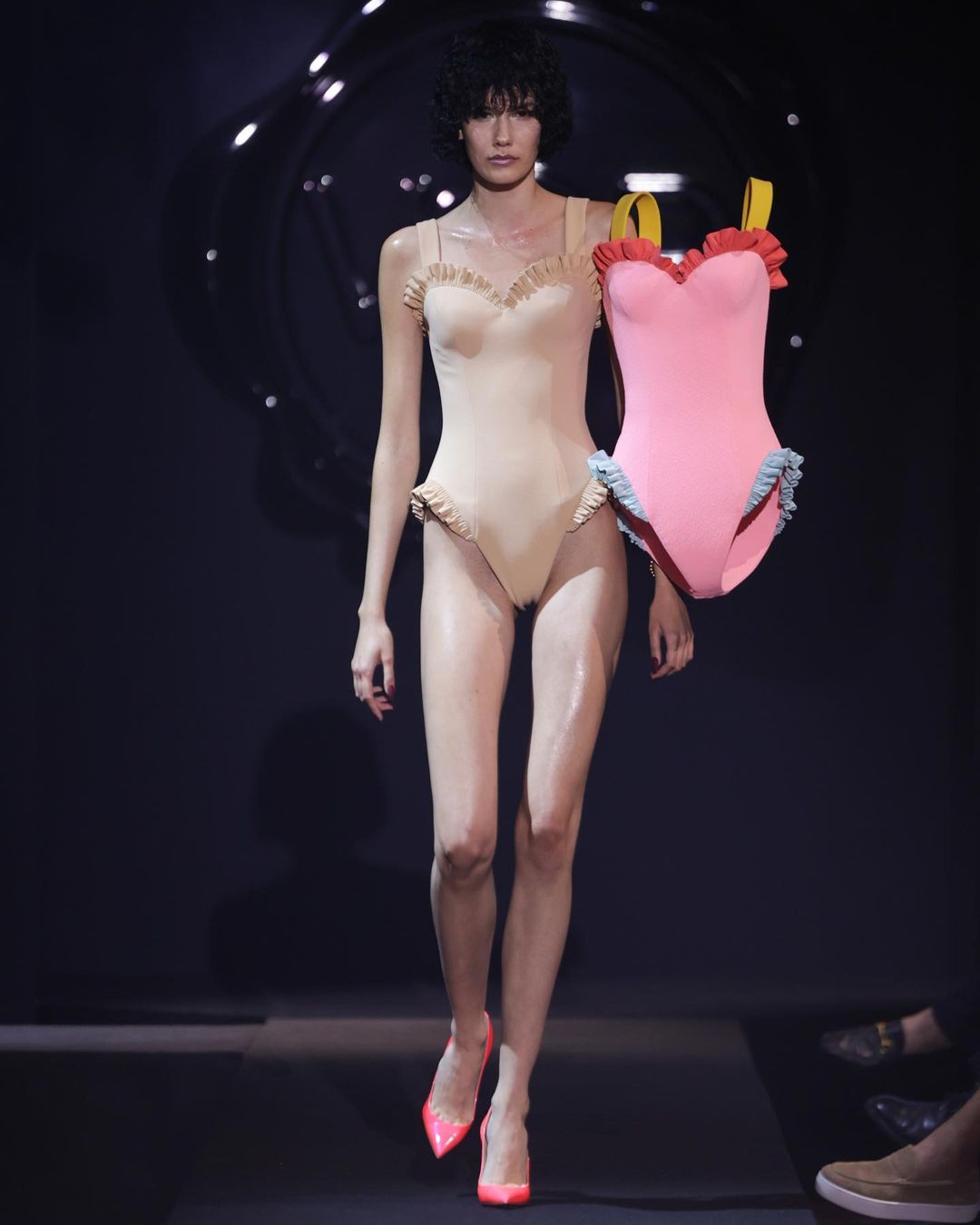 Le modelle hanno sfilato in passerella in una serie di body dai colori audaci accompagnati da manichini (privi di teste, mani e piedi) che adornavano i loro corpi sedendosi sulle loro spalle, avvolgendo le maniche intorno alla vita o appoggiandosi sui fianchi.